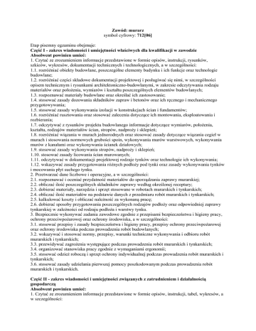 Zawód: murarz symbol cyfrowy: 712[06] Etap pisemny egzaminu obejmuje: Część I - zakres wiadomości i umiejętności właściwych dla kwalifikacji w zawodzie Absolwent powinien umieć: 1. Czytać ze zrozumieniem informacje przedstawione w formie opisów, instrukcji, rysunków, szkiców, wykresów, dokumentacji technicznych i technologicznych, a w szczególności: 1.1. rozróżniać obiekty budowlane, poszczególne elementy budynku i ich funkcje oraz technologie budowlane; 1.2. rozróżniać części składowe dokumentacji projektowej i posługiwać się nimi, w szczególności opisem technicznym i rysunkami architektoniczno-budowlanymi, w zakresie odczytywania rodzaju materiałów oraz położenia, wymiarów i kształtu poszczególnych elementów budowlanych; 1.3. rozpoznawać materiały budowlane oraz określać ich zastosowanie; 1.4. stosować zasady dozowania składników zapraw i betonów oraz ich ręcznego i mechanicznego przygotowywania; 1.5. stosować zasady wykonywania izolacji w konstrukcjach ścian i fundamentów; 1.6. rozróżniać rusztowania oraz stosować zalecenia dotyczące ich montowania, eksploatowania i rozbierania; 1.7. odczytywać z rysunków projektu budowlanego informacje dotyczące wymiarów, położenia, kształtu, rodzajów materiałów ścian, stropów, nadproży i sklepień; 1.8. rozróżniać wiązania w murach jednorodnych oraz stosować zasady dotyczące wiązania cegieł w murach i stosowania normowych grubości spoin, wykonywania murów warstwowych, wykonywania murów z kanałami oraz wykonywania ścianek działowych; 1.9. stosować zasady wykonywania stropów, nadproży i sklepień; 1.10. stosować zasady licowania ścian murowanych; 1.11. odczytywać w dokumentacji projektowej rodzaje tynków oraz technologie ich wykonywania; 1.12. wskazywać zasady przygotowania różnych podłoży pod tynki oraz zasady wykonywania tynków i mocowania płyt suchego tynku. 2. Przetwarzać dane liczbowe i operacyjne, a w szczególności: 2.1. rozpoznawać i oceniać przydatność materiałów do sporządzania zaprawy murarskiej; 2.2. obliczać ilość poszczególnych składników zaprawy według określonej receptury; 2.3. dobierać materiały, narzędzia i sprzęt stosowane w robotach murarskich i tynkarskich; 2.4. obliczać ilość materiałów na podstawie danych z przedmiaru robót murarskich i tynkarskich; 2.5. kalkulować koszty i obliczać należność za wykonaną pracę; 2.6. dobierać sposoby przygotowania poszczególnych rodzajów podłoży oraz odpowiedniej zaprawy tynkarskiej w zależności od rodzaju podłoża i warstwy tynku. 3. Bezpiecznie wykonywać zadania zawodowe zgodnie z przepisami bezpieczeństwa i higieny pracy, ochrony przeciwpożarowej oraz ochrony środowiska, a w szczególności: 3.1. stosować przepisy i zasady bezpieczeństwa i higieny pracy, przepisy ochrony przeciwpożarowej oraz ochrony środowiska podczas prowadzenia robót budowlanych; 3.2. wskazywać i stosować normy, przepisy, warunki techniczne wykonywania i odbioru robót murarskich i tynkarskich; 3.3. przewidywać zagrożenia występujące podczas prowadzenia robót murarskich i tynkarskich; 3.4. organizować stanowiska pracy zgodnie z wymaganiami ergonomii; 3.5. stosować odzież roboczą i sprzęt ochrony indywidualnej podczas prowadzenia robót murarskich i tynkarskich; 3.6. stosować zasady udzielania pierwszej pomocy poszkodowanym podczas prowadzenia robót murarskich i tynkarskich. Część II - zakres wiadomości i umiejętności związanych z zatrudnieniem i działalnością gospodarczą Absolwent powinien umieć: 1. Czytać ze zrozumieniem informacje przedstawione w formie opisów, instrukcji, tabel, wykresów, a w szczególności: 1.1. rozróżniać podstawowe pojęcia i terminy z zakresu funkcjonowania gospodarki oraz prawa pracy, prawa podatkowego i przepisów regulujących podejmowanie i wykonywanie działalności gospodarczej; 1.2. rozróżniać dokumenty związane z zatrudnieniem oraz podejmowaniem i wykonywaniem działalności gospodarczej; 1.3. identyfikować i analizować informacje dotyczące wymagań i uprawnień pracownika, pracodawcy, bezrobotnego i klienta. 2. Przetwarzać dane liczbowe i operacyjne, a w szczególności: 2.1. analizować informacje związane z podnoszeniem kwalifikacji, poszukiwaniem pracy i zatrudnieniem oraz podejmowaniem i wykonywaniem działalności gospodarczej; 2.2. sporządzać dokumenty związane z poszukiwaniem pracy i zatrudnieniem oraz podejmowaniem i wykonywaniem działalności gospodarczej; 2.3. rozróżniać skutki wynikające z nawiązania i rozwiązania stosunku pracy. Etap praktyczny egzaminu obejmuje wykonanie określonego zadania egzaminacyjnego wynikającego z tematów: 1. Wykonanie fragmentu muru w zadanym wiązaniu i określonej technice murowania, zgodnie z dokumentacją. 2. Wykonanie zadanego rodzaju tynku na wyznaczonym fragmencie ściany. Absolwent powinien umieć: 1. Planować czynności związane z wykonaniem zadania: 1.1. sporządzić plan działania; 1.2. sporządzić wykaz niezbędnych surowców, materiałów, sprzętu kontrolno-pomiarowego, narzędzi; 1.3. wykonać niezbędne obliczenia, rysunki lub szkice pomocnicze. 2. Organizować stanowisko pracy: 2.1. zgromadzić i rozmieścić na stanowisku pracy materiały, narzędzia, urządzenia i sprzęt zgodnie z przepisami i zasadami bezpieczeństwa i higieny pracy oraz przepisami ochrony przeciwpożarowej; 2.2. sprawdzić stan techniczny maszyn, urządzeń i sprzętu; 2.3. dobrać odzież roboczą i środki ochrony indywidualnej. 3. Wykonać zadanie egzaminacyjne z zachowaniem przepisów bezpieczeństwa i higieny pracy, ochrony przeciwpożarowej oraz ochrony środowiska i wykazać się umiejętnościami objętymi tematami: 3.1. Wykonanie fragmentu muru w zadanym wiązaniu i określonej technice murowania, zgodnie z dokumentacją: 3.1.1. wyznaczyć roboty zgodnie z dokumentacją; 3.1.2. zbadać doraźnie i ocenić jakość używanych materiałów; 3.1.3. nałoż