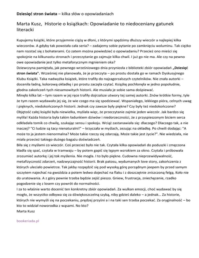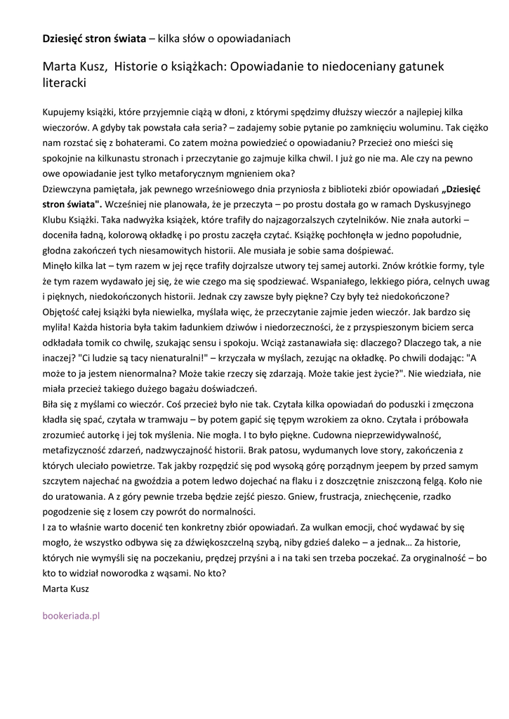 Dziesięć stron świata – kilka słów o opowiadaniach Marta Kusz, Historie o książkach: Opowiadanie to niedoceniany gatunek literacki Kupujemy książki, które przyjemnie ciążą w dłoni, z którymi spędzimy dłuższy wieczór a najlepiej kilka wieczorów. A gdyby tak powstała cała seria? – zadajemy sobie pytanie po zamknięciu woluminu. Tak ciężko nam rozstad się z bohaterami. Co zatem można powiedzied o opowiadaniu? Przecież ono mieści się spokojnie na kilkunastu stronach i przeczytanie go zajmuje kilka chwil. I już go nie ma. Ale czy na pewno owe opowiadanie jest tylko metaforycznym mgnieniem oka? Dziewczyna pamiętała, jak pewnego wrześniowego dnia przyniosła z biblioteki zbiór opowiadao „Dziesięć stron świata". Wcześniej nie planowała, że je przeczyta – po prostu dostała go w ramach Dyskusyjnego Klubu Książki. Taka nadwyżka książek, które trafiły do najzagorzalszych czytelników. Nie znała autorki – doceniła ładną, kolorową okładkę i po prostu zaczęła czytad. Książkę pochłonęła w jedno popołudnie, głodna zakooczeo tych niesamowitych historii. Ale musiała je sobie sama dośpiewad. Minęło kilka lat – tym razem w jej ręce trafiły dojrzalsze utwory tej samej autorki. Znów krótkie formy, tyle że tym razem wydawało jej się, że wie czego ma się spodziewad. Wspaniałego, lekkiego pióra, celnych uwag i pięknych, niedokooczonych historii. Jednak czy zawsze były piękne? Czy były też niedokooczone? Objętośd całej książki była niewielka, myślała więc, że przeczytanie zajmie jeden wieczór. Jak bardzo się myliła! Każda historia była takim ładunkiem dziwów i niedorzeczności, że z przyspieszonym biciem serca odkładała tomik co chwilę, szukając sensu i spokoju. Wciąż zastanawiała się: dlaczego? Dlaczego tak, a nie inaczej? "Ci ludzie są tacy nienaturalni!" – krzyczała w myślach, zezując na okładkę. Po chwili dodając: "A może to ja jestem nienormalna? Może takie rzeczy się zdarzają. Może takie jest życie?". Nie wiedziała, nie miała przecież takiego dużego bagażu doświadczeo. Biła się z myślami co wieczór. Coś przecież było nie tak. Czytała kilka opowiadao do poduszki i zmęczona kładła się spad, czytała w tramwaju – by potem gapid się tępym wzrokiem za okno. Czytała i próbowała zrozumied autorkę i jej tok myślenia. Nie mogła. I to było piękne. Cudowna nieprzewidywalnośd, metafizycznośd zdarzeo, nadzwyczajnośd historii. Brak patosu, wydumanych love story, zakooczenia z których uleciało powietrze. Tak jakby rozpędzid się pod wysoką górę porządnym jeepem by przed samym szczytem najechad na gwoździa a potem ledwo dojechad na flaku i z doszczętnie zniszczoną felgą. Koło nie do uratowania. A z góry pewnie trzeba będzie zejśd pieszo. Gniew, frustracja, zniechęcenie, rzadko pogodzenie się z losem czy powrót do normalności. I za to właśnie warto docenid ten konkretny zbiór opowiadao. Za wulkan emocji, chod wydawad by się mogło, że wszystko odbywa się za dźwiękoszczelną szybą, niby gdzieś daleko – a jednak… Za historie, których nie wymyśli się na poczekaniu, prędzej przyśni a i na taki sen trzeba poczekad. Za oryginalnośd – bo kto to widział noworodka z wąsami. No kto? Marta Kusz bookeriada.pl