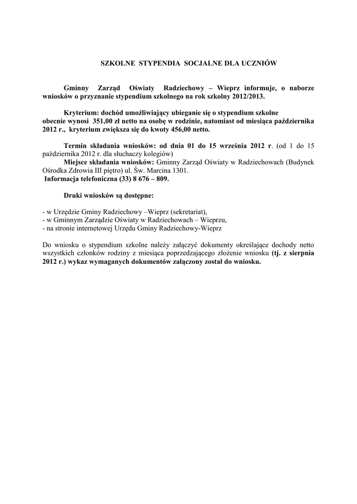 SZKOLNE STYPENDIA SOCJALNE DLA UCZNIÓW Gminny Zarząd Oświaty Radziechowy – Wieprz informuje, o naborze wniosków o przyznanie stypendium szkolnego na rok szkolny 2012/2013. Kryterium: dochód umożliwiający ubieganie się o stypendium szkolne obecnie wynosi 351,00 zł netto na osobę w rodzinie, natomiast od miesiąca października 2012 r., kryterium zwiększa się do kwoty 456,00 netto. Termin składania wniosków: od dnia 01 do 15 września 2012 r. (od 1 do 15 października 2012 r. dla słuchaczy kolegiów) Miejsce składania wniosków: Gminny Zarząd Oświaty w Radziechowach (Budynek Ośrodka Zdrowia III piętro) ul. Św. Marcina 1301. Informacja telefoniczna (33) 8 676 – 809. Druki wniosków są dostępne: - w Urzędzie Gminy Radziechowy –Wieprz (sekretariat), - w Gminnym Zarządzie Oświaty w Radziechowach – Wieprzu, - na stronie internetowej Urzędu Gminy Radziechowy-Wieprz Do wniosku o stypendium szkolne należy załączyć dokumenty określające dochody netto wszystkich członków rodziny z miesiąca poprzedzającego złożenie wniosku (tj. z sierpnia 2012 r.) wykaz wymaganych dokumentów załączony został do wniosku.