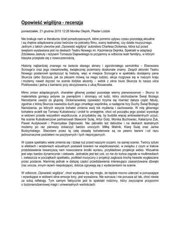 Opowieść wigilijna - recenzja poniedziałek, 21 grudnia 2015 12:26 Monika Olejnik, Plaster Łódzki Nie brakuje nam w literaturze dzieł ponadczasowych, które pomimo upływu czasu pozostają aktualne i są chętnie adaptowane przez twórców na potrzeby filmu, sceny teatralnej, czy dzieła muzycznego. Jednym z takich utworów jest „Opowieść wigilijna” autorstwa Charlesa Dickensa, która tuż przed świętami wystawiana jest na deskach Teatru Nowego im. Kazimierza Dejmka. Spektakl w adaptacji Zdzisława Jaskuły i reżyserii Tomasza Dajewskiego to przyjemny w odbiorze teatr familijny, w którym klasyka przeplata się z nowoczesnością. Historię najbardziej znanego na świecie starego sknery i zgorzkniałego samotnika – Ebenezera Scrooge’a oraz jego niesamowitej, świątecznej przemiany doskonale znamy. Zespół aktorski Teatru Nowego postanowił spolszczyć tę historię, więc w miejsce Scrooge’a w spektaklu dostajemy pana Skurcza (albo Szczura, jak za plecami mówią na niego ludzie), akcja rozgrywa się w naszym kraju i możemy nawet dojrzeć na scenie łódzkie akcenty – widok z okna biura Skurcza to nasza ulica Piotrkowska i jedna z kamienic przy skrzyżowaniu z ulicą Roosevelta. Mimo zmian adaptacyjnych, charakter głównej postaci pozostaje wierny pierwowzorowi – Skurcz to materialista goniący jedynie za pieniędzmi i stroniący od ludzi, który obchodzenie Świąt Bożego Narodzenie uważa za głupotę. Dickensowskiej opowieści trzyma się również dalsza część fabuły, zgodnie z którą Skurcza nawiedza duch jego zmarłego wspólnika, a następnie trzy Duchy Świąt Bożego Narodzenia, po których wizycie bohater zmienia swój tok myślenia i zachowanie. W rolę głównego bohatera wcielił się Tomasz Kubiatowicz i zrobił to umiejętnie, choć od początku jego postać wywołuje w widowni przede wszystkim współczucie, a przydałoby się, by budziła więcej ambiwalentnych uczuć. Na scenie Kubiatowiczowi partnerowali Sławomir Sulej, Artur Gotz, Monika Buchowiec, Katarzyna Żuk, Paweł Audykowski i Przemysław Dąbrowski. Nie zabrakło też debiutów i na deskach teatralnych możemy po raz pierwszy zobaczyć bardzo uroczych: Miłkę Mielnik, Klarę Sulej oraz Janka Budzyńskiego. Stworzeni przez tą całą obsadę bohaterowie są na pewno barwni i od razu jednoznacznie podzieleni na pozytywnych i tych nieprzyjaznych. W czasie spektaklu wiele zmienia się i dzieje tuż przed naszymi oczami, na samej scenie. Twórcy sztuki w efektach i wrażeniach wizualnych postawili bowiem na współczesność, w związku z czym w trakcie przedstawienia towarzyszą nam nowoczesne środki wyrazu, przykładowo projekcje wideo. Wizualnie jest więc bardzo dynamicznie i ciekawie. Jednakże jest też coś, co nie do końca zagrało w multimediach i, zwłaszcza w początkach spektaklu, podkład muzyczny z projekcji zagłusza trochę kwestie wygłaszane przez postacie. Niemniej jednak w dalszej części przedstawienia interesująco zaaranżowane dźwięki (raz urocze, innym razem niepokojące), dobrze zgrywają się z wydarzeniami na scenie. W odbiorze „Opowieść wigilijna”, choć wydawać by się mogło, że będzie mocno uderzać w poruszające i wywołujące w widowni silne emocje tony, jest wyważona. Nie wzrusza i nie porusza aż tak, choć niesie za sobą refleksję. Tym samym faktycznie jest to spektakl rodzinny, który zwyczajnie przypomni o bożonarodzeniowej magii i uniwersalnych wartościach.