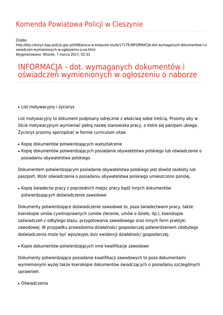 Komenda Powiatowa Policji w Cieszynie Źródło: http://bip.cieszyn.kpp.policja.gov.pl/008/praca-w-korpusie-sluzb/17179,INFORMACJA-dot-wymaganych-dokumentow-i-o swiadczen-wymienionych-w-ogloszeniu-o-na.html Wygenerowano: Wtorek, 7 marca 2017, 02:31 INFORMACJA - dot. wymaganych dokumentów i oświadczeń wymienionych w ogłoszeniu o naborze ● List motywacyjny i życiorys List motywacyjny to dokument podpisany odręcznie z właściwą sobie treścią. Prosimy aby w liście motywacyjnym wymieniać pełną nazwę stanowiska pracy, o które się pan/pani ubiega. Życiorys prosimy sporządzać w formie curriculum vitae. ● Kopię dokumentów potwierdzających wykształcenie ● Kopię dokumentów potwierdzających posiadanie obywatelstwa polskiego lub oświadczenie o posiadaniu obywatelstwa polskiego Dokumentem potwierdzającym posiadanie obywatelstwa polskiego jest dowód osobisty lub paszport. Wzór oświadczenia o posiadaniu obywatelstwa polskiego umieszczono poniżej. ● Kopię świadectw pracy z poprzednich miejsc pracy bądź innych dokumentów potwierdzających doświadczenie zawodowe Dokumenty potwierdzające doświadczenie zawodowe to, poza świadectwami pracy, także kserokopie umów cywilnoprawnych (umów zlecenie, umów o dzieło, itp.), kserokopie zaświadczeń z odbytego stażu, przygotowania zawodowego oraz innych form praktyki zawodowej. W przypadku prowadzenia działalności gospodarczej potwierdzeniem zdobytego doświadczenia może być wpis/wypis do/z ewidencji działalności gospodarczej. ● Kopie dokumentów potwierdzających inne kwalifikacje zawodowe Dokumenty potwierdzające posiadanie kwalifikacji zawodowych to poza dokumentami wymienionymi wyżej także kserokopie dokumentów świadczących o posiadaniu szczególnych uprawnień. ● Oświadczenia Każde oświadczenie powinno być opatrzone datą oraz uwiarygodnione odręcznym podpisem. Wzory oświadczeń: 1. Oświadczenie o wyrażeniu zgody na przetwarzanie danych osobowych dla celów rekrutacji: ………………………………………… …………………………………………. (imię, nazwisko, adres) (miejscowość, data) ……………………………………….. OŚWIADCZENIE Oświadczam, iż wyrażam zgodę na przetwarzanie moich danych osobowych do celów rekrutacji. ………………………………………………. (podpis) _______________________________________________________________________________________________ __________________________________________________ 1. Oświadczenie o nieskazaniu prawomocnym wyrokiem za umyślne przestępstwo lub umyślne przestępstwo skarbowe: ………………………………………… …………………………………………. (imię, nazwisko, adres) (miejscowość, data) ……………………………………….. OŚWIADCZENIE Oświadczam, iż nie byłem(am) skazany(a) prawomocnym wyrokiem za przestępstwo popełnione umyślnie lub przestępstwo skarbowe popełnione umyślnie. ………………………………………………. (podpis) _______________________________________________________________________________________________ __________________________________________________ 1. Oświadczenie o korzystaniu z pełni praw publicznych: ………………………………………… ………………………………………. (imię, nazwisko, adres) (miejscowość, data) ……………………………………….. OŚWIADCZENIE Oświadczam, iż korzystam z pełni praw publicznych. ……………………………………………. (podpis) _______________________________________________________________________________________________ _______________________________________________________ 1. Oświadczenie o posiadaniu obywatelstwa polskiego: ………………………………………… ………………………………………. (imię, nazwisko, adres) (miejscowość, data) ……………………………………….. OŚWIADCZENIE Oświadczam, iż posiadam obywatelstwo polskie. ……………………………………………. (podpis) Metryczka Data publikacji 07.05.2013 Data modyfikacji 13.05.2013 Rejestr zmian Podmiot udostępniający informację: Biuletyn Informacji Publicznej Osoba wytwarzająca/odpowiadająca za informację: Rafał Domagała Osoba udostępniająca informację: Rafał Domagała KPP Cieszyn Osoba modyfikująca informację: Rafał Domagała
