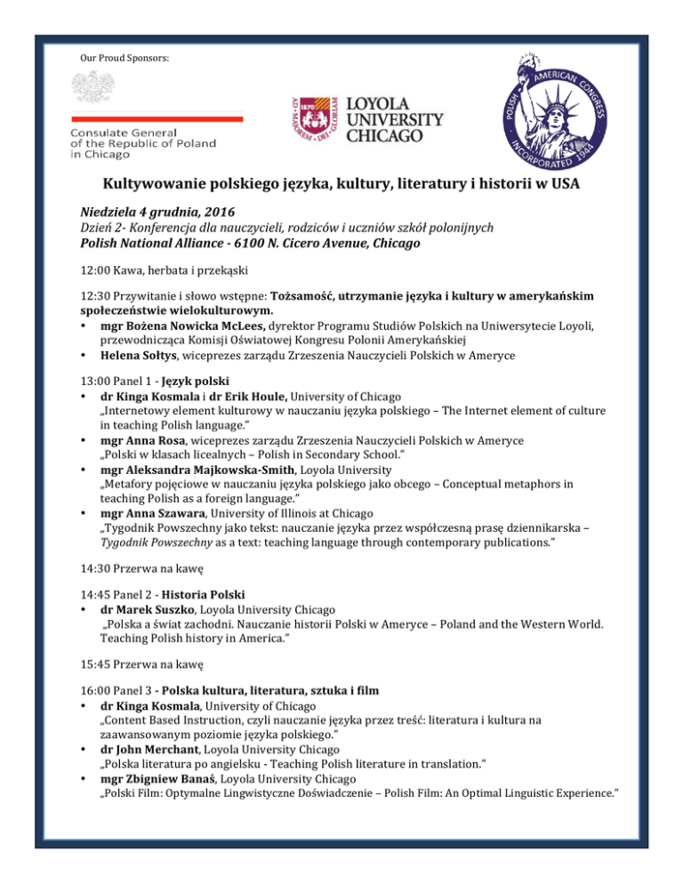 OurProudSponsors: Kultywowaniepolskiegojęzyka,kultury,literaturyihistoriiwUSA Niedziela4grudnia,2016 Dzień2-Konferencjadlanauczycieli,rodzicówiuczniówszkółpolonijnych PolishNationalAlliance-6100N.CiceroAvenue,Chicago 12:00Kawa,herbataiprzekąski 12:30Przywitanieisłowowstępne:Tożsamość,utrzymaniejęzykaikulturywamerykańskim społeczeństwiewielokulturowym. • mgrBożenaNowickaMcLees,dyrektorProgramuStudiówPolskichnaUniwersytecieLoyoli, przewodniczącaKomisjiOświatowejKongresuPoloniiAmerykańskiej • HelenaSołtys,wiceprezeszarząduZrzeszeniaNauczycieliPolskichwAmeryce 13:00Panel1-Językpolski • drKingaKosmalaidrErikHoule,UniversityofChicago „Internetowyelementkulturowywnauczaniujęzykapolskiego–TheInternetelementofculture inteachingPolishlanguage.” • mgrAnnaRosa,wiceprezeszarząduZrzeszeniaNauczycieliPolskichwAmeryce „Polskiwklasachlicealnych–PolishinSecondarySchool.” • mgrAleksandraMajkowska-Smith,LoyolaUniversity „Metaforypojęciowewnauczaniujęzykapolskiegojakoobcego–Conceptualmetaphorsin teachingPolishasaforeignlanguage.” • mgrAnnaSzawara,UniversityofIllinoisatChicago „TygodnikPowszechnyjakotekst:nauczaniejęzykaprzezwspółczesnąprasędziennikarska– TygodnikPowszechnyasatext:teachinglanguagethroughcontemporarypublications.” 14:30Przerwanakawę 14:45Panel2-HistoriaPolski • drMarekSuszko,LoyolaUniversityChicago „Polskaaświatzachodni.NauczaniehistoriiPolskiwAmeryce–PolandandtheWesternWorld. TeachingPolishhistoryinAmerica.” 15:45Przerwanakawę 16:00Panel3-Polskakultura,literatura,sztukaifilm • drKingaKosmala,UniversityofChicago „ContentBasedInstruction,czylinauczaniejęzykaprzeztreść:literaturaikulturana zaawansowanympoziomiejęzykapolskiego.” • drJohnMerchant,LoyolaUniversityChicago „Polskaliteraturapoangielsku-TeachingPolishliteratureintranslation.” • mgrZbigniewBanaś,LoyolaUniversityChicago „PolskiFilm:OptymalneLingwistyczneDoświadczenie–PolishFilm:AnOptimalLinguisticExperience.”