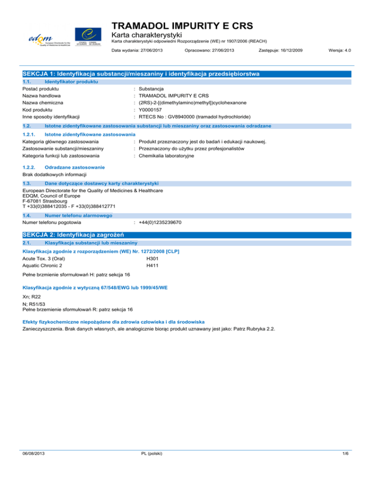 TRAMADOL IMPURITY E CRS Karta charakterystyki Karta charakterystyki odpowiedni Rozporządzenie (WE) nr 1907/2006 (REACH) Data wydania: 27/06/2013 Opracowano: 27/06/2013 Zastępuje: 16/12/2009 Wersja: 4.0 SEKCJA 1: Identyfikacja substancji/mieszaniny i identyfikacja przedsiębiorstwa 1.1. Identyfikator produktu Postać produktu : Substancja Nazwa handlowa : TRAMADOL IMPURITY E CRS Nazwa chemiczna : (2RS)-2-[(dimethylamino)methyl])cyclohexanone Kod produktu : Y0000157 Inne sposoby identyfikacji : RTECS No : GV8940000 (tramadol hydrochloride) 1.2. Istotne zidentyfikowane zastosowania substancji lub mieszaniny oraz zastosowania odradzane 1.2.1. Istotne zidentyfikowane zastosowania Kategoria głównego zastosowania : Produkt przeznaczony jest do badań i edukacji naukowej. Zastosowanie substancji/mieszaniny : Przeznaczony do użytku przez profesjonalistów Kategoria funkcji lub zastosowania : Chemikalia laboratoryjne 1.2.2. Odradzane zastosowanie Brak dodatkowych informacji 1.3. Dane dotyczące dostawcy karty charakterystyki European Directorate for the Quality of Medicines & Healthcare EDQM, Council of Europe F-67081 Strasbourg T +33(0)388412035 - F +33(0)388412771 1.4. Numer telefonu alarmowego Numer telefonu pogotowia : +44(0)1235239670 SEKCJA 2: Identyfikacja zagrożeń 2.1. Klasyfikacja substancji lub mieszaniny Klasyfikacja zgodnie z rozporządzeniem (WE) Nr. 1272/2008 [CLP] Acute Tox. 3 (Oral) H301 Aquatic Chronic 2 H411 Pełne brzmienie sformułowań H: patrz sekcja 16 Klasyfikacja zgodnie z wytyczną 67/548/EWG lub 1999/45/WE Xn; R22 N; R51/53 Pełne brzemienie sformułowań R: patrz sekcja 16 Efekty fizykochemiczne niepożądane dla zdrowia człowieka i dla środowiska Zanieczyszczenia. Brak danych własnych, ale analogicznie biorąc produkt uznawany jest jako: Patrz Rubryka 2.2. 06/08/2013 PL (polski) 1/6 TRAMADOL IMPURITY E CRS Karta charakterystyki Karta charakterystyki odpowiedni Rozporządzenie (WE) nr 1907/2006 (REACH) 2.2. Elementy oznakowania Oznakowanie zgodnie z rozporządzeniem (WE) nr. 1272/2008 [CLP] Piktogramy określające rodzaj zagrożenia (CLP) : GHS06 GHS09 Hasło ostrzegawcze (CLP) : Niebezpieczeństwo Zwroty wskazujące rodzaj zagrożenia (CLP) : H301 - Działa toksycznie po połknięciu H411 - Działa toksycznie na organizmy wodne, powodując długotrwałe skutki Zwroty wskazujące środki ostrożności (CLP) : P264 - Dokładnie umyć ręce oraz inne eksponowane okolice po użyciu P273 - Unikać uwolnienia do środowiska P301+P310 - W PRZYPADKU POŁKNIĘCIA: Natychmiast skontaktować się z OŚRODKIEM ZATRUĆ lub z lekarzem P330 - Wypłukać usta P391 - Zebrać wyciek P501 - Zawartość/pojemnik usuwać do : Odpady niebezpieczne. Należy przestrzegać obowiązujących rozporządzeń prawnych 2.3. Inne zagrożenia Inne zagrożenia mające wpływ na klasyfikację : Ekspozycja może spowodować reakcję alergiczną. SEKCJA 3: Skład/informacja o składnikach 3.1. Substancje Nazwa Identyfikator produktu TRAMADOL IMPURITY E % Klasyfikacja zgodnie z dyrektywą 67/548/EEC ≤ 100 Xn; R22 N; R51/53 % Klasyfikacja zgodnie z rozporządzeniem (WE) Nr. 1272/2008 [CLP] ≤ 100 Acute Tox. 3 (Oral), H301 Aquatic Chronic 2, H411 (Main constituent) Nazwa Identyfikator produktu TRAMADOL IMPURITY E (Main constituent) Brzmienie sformułowań R-, H- i EUH: patrz sekcja 16 3.2. Mieszanina Nie dotyczy SEKCJA 4: Środki pierwszej pomocy 4.1. Opis środków pierwszej pomocy Pierwsza pomoc - środki ogólnie : W przypadku złego samopoczucia, należy zasięgnąć porady lekarza (pokazać etykietę, jeżeli to możliwe). Pierwsza pomoc - środki po zainhalowaniu : W razie przypadkowej inhalacji, wyprowadzić poszkodowanego na świeże powietrze. Zapewnić oddychanie świeżym powietrzem. Zasięgnąć porady lekarza w przypadku utrzymywania się trudności w oddychaniu. Pierwsza pomoc - środki po kontakcie ze skórą : Spłukać skórę pod strumieniem wody/prysznicem. Umyć dużą ilością wody z mydłem. Pierwsza pomoc - środki po kontakcie z oczami : Płukanie w wodzie trzymając powieki szeroko rozwarte. Zdjąć soczewki kontaktowe. Zasięgnąć porady lekarza w przypadku utrzymywania się bólu lub zaczerwienienia. Pierwsza pomoc - środki po połknięciu : Przepłukać usta wodą. Mogą występować następujące objawy: (patrz sekcja/sekcje: 2). W przypadku złego samopoczucia, należy zasięgnąć porady lekarza. 4.2. Najważniejsze ostre i opóźnione objawy oraz skutki narażenia Symptomy/urazy 4.3. : Patrz Rubryka 2. Wskazania dotyczące wszelkiej natychmiastowej pomocy lekarskiej i szczególnego postępowania z poszkodowanym Brak dostępnych danych. Leczenie objawowe. SEKCJA 5: Postępowanie w przypadku pożaru 5.1. Środki gaśnicze Odpowiednie środki gaśnicze 5.2. : Małe ilości: Stosować odpowiednie środki do zwalczania pożaru w sąsiedztwie. Dwutlenek węgla. Suchy proszek. Duże ilości: Nie dotyczy. Szczególne zagrożenia związane z substancją lub mieszaniną Brak dodatkowych informacji 06/08/2013 PL (polski) 2/6 TRAMADOL IMPURITY E CRS Karta charakterystyki Karta charakterystyki odpowiedni Rozporządzenie (WE) nr 1907/2006 (REACH) 5.3. Informacje dla straży pożarnej Środki zapobiegawcze celem uniknięcia pożaru : Małe ilości: Stosować zwykły, indywidualny sprzęt ochrony przeciwpożarowej. Duże ilości: Nie dotyczy. SEKCJA 6: Postępowanie w przypadku niezamierzonego uwolnienia do środowiska 6.1. Indywidualne środki ostrożności, wyposażenie ochronne i procedury w sytuacjach awaryjnych Ogólne środki zaradcze 6.1.1. Dla osób nienależących do personelu udzielającego pomocy Wyposażenie ochronne 6.1.2. : Nosić odpowiednią odzież ochronną, odpowiednie rękawice i okulary ochronne lub osłonę twarzy. Duże ilości: Nie dotyczy. : Patrz Nagłówek 7/8. Dla osób udzielających pomocy Brak dodatkowych informacji 6.2. Środki ostrożności w zakresie ochrony środowiska Brak dodatkowych informacji 6.3. Metody i materiały zapobiegające rozpr