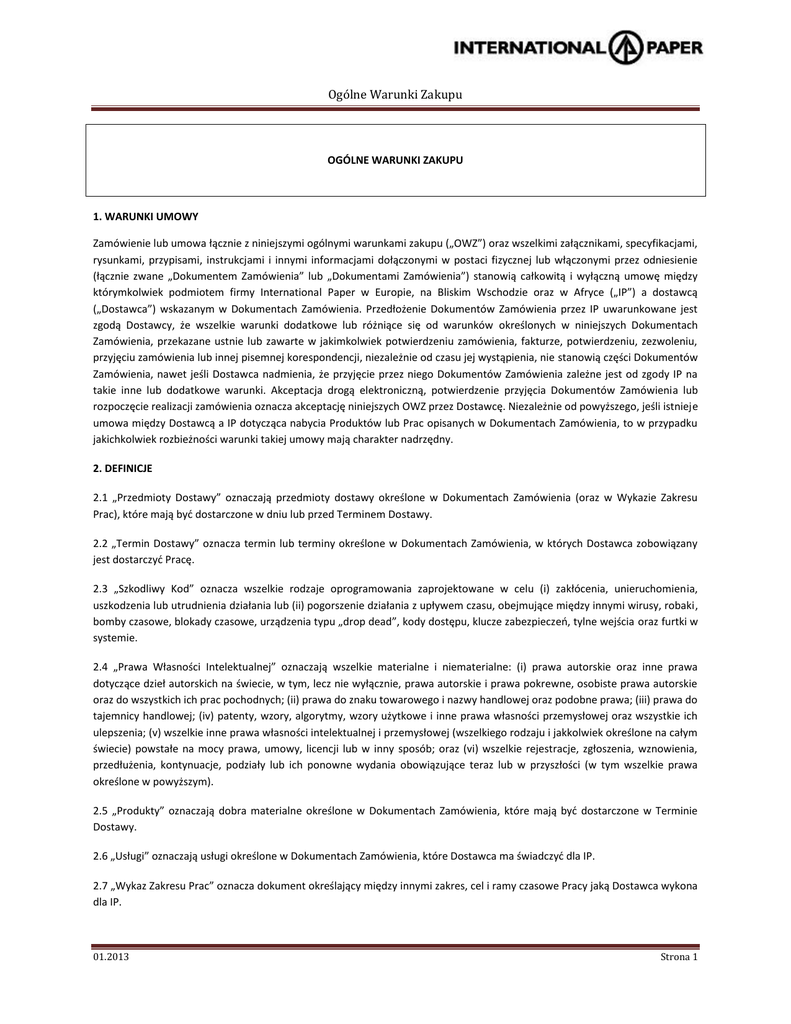 Ogólne Warunki Zakupu OGÓLNE WARUNKI ZAKUPU 1. WARUNKI UMOWY Zamówienie lub umowa łącznie z niniejszymi ogólnymi warunkami zakupu („OWZ”) oraz wszelkimi załącznikami, specyfikacjami, rysunkami, przypisami, instrukcjami i innymi informacjami dołączonymi w postaci fizycznej lub włączonymi przez odniesienie (łącznie zwane „Dokumentem Zamówienia” lub „Dokumentami Zamówienia”) stanowią całkowitą i wyłączną umowę między którymkolwiek podmiotem firmy International Paper w Europie, na Bliskim Wschodzie oraz w Afryce („IP”) a dostawcą („Dostawca”) wskazanym w Dokumentach Zamówienia. Przedłożenie Dokumentów Zamówienia przez IP uwarunkowane jest zgodą Dostawcy, że wszelkie warunki dodatkowe lub różniące się od warunków określonych w niniejszych Dokumentach Zamówienia, przekazane ustnie lub zawarte w jakimkolwiek potwierdzeniu zamówienia, fakturze, potwierdzeniu, zezwoleniu, przyjęciu zamówienia lub innej pisemnej korespondencji, niezależnie od czasu jej wystąpienia, nie stanowią części Dokumentów Zamówienia, nawet jeśli Dostawca nadmienia, że przyjęcie przez niego Dokumentów Zamówienia zależne jest od zgody IP na takie inne lub dodatkowe warunki. Akceptacja drogą elektroniczną, potwierdzenie przyjęcia Dokumentów Zamówienia lub rozpoczęcie realizacji zamówienia oznacza akceptację niniejszych OWZ przez Dostawcę. Niezależnie od powyższego, jeśli istnieje umowa między Dostawcą a IP dotycząca nabycia Produktów lub Prac opisanych w Dokumentach Zamówienia, to w przypadku jakichkolwiek rozbieżności warunki takiej umowy mają charakter nadrzędny. 2. DEFINICJE 2.1 „Przedmioty Dostawy” oznaczają przedmioty dostawy określone w Dokumentach Zamówienia (oraz w Wykazie Zakresu Prac), które mają być dostarczone w dniu lub przed Terminem Dostawy. 2.2 „Termin Dostawy” oznacza termin lub terminy określone w Dokumentach Zamówienia, w których Dostawca zobowiązany jest dostarczyć Pracę. 2.3 „Szkodliwy Kod” oznacza wszelkie rodzaje oprogramowania zaprojektowane w celu (i) zakłócenia, unieruchomienia, uszkodzenia lub utrudnienia działania lub (ii) pogorszenie działania z upływem czasu, obejmujące między innymi wirusy, robaki, bomby czasowe, blokady czasowe, urządzenia typu „drop dead”, kody dostępu, klucze zabezpieczeń, tylne wejścia oraz furtki w systemie. 2.4 „Prawa Własności Intelektualnej” oznaczają wszelkie materialne i niematerialne: (i) prawa autorskie oraz inne prawa dotyczące dzieł autorskich na świecie, w tym, lecz nie wyłącznie, prawa autorskie i prawa pokrewne, osobiste prawa autorskie oraz do wszystkich ich prac pochodnych; (ii) prawa do znaku towarowego i nazwy handlowej oraz podobne prawa; (iii) prawa do tajemnicy handlowej; (iv) patenty, wzory, algorytmy, wzory użytkowe i inne prawa własności przemysłowej oraz wszystkie ich ulepszenia; (v) wszelkie inne prawa własności intelektualnej i przemysłowej (wszelkiego rodzaju i jakkolwiek określone na całym świecie) powstałe na mocy prawa, umowy, licencji lub w inny sposób; oraz (vi) wszelkie rejestracje, zgłoszenia, wznowienia, przedłużenia, kontynuacje, podziały lub ich ponowne wydania obowiązujące teraz lub w przyszłości (w tym wszelkie prawa określone w powyższym). 2.5 „Produkty” oznaczają dobra materialne określone w Dokumentach Zamówienia, które mają być dostarczone w Terminie Dostawy. 2.6 „Usługi” oznaczają usługi określone w Dokumentach Zamówienia, które Dostawca ma świadczyć dla IP. 2.7 „Wykaz Zakresu Prac” oznacza dokument określający między innymi zakres, cel i ramy czasowe Pracy jaką Dostawca wykona dla IP. 01.2013 Strona 1 Ogólne Warunki Zakupu 2.8 „Podwykonawca” oznacza osobę trzecią wykonującą pracę na mocy umowy („Podwykonawstwo”) z Dostawcą. 2.9 „Personel Dostawcy” oznacza pracowników, konsultantów, agentów, wykonawców niezależnych oraz Podwykonawców podlegających nadzorowi Dostawcy, który ponosi za nich odpowiedzialność. 2.10 „Własność Intelektualna Osób Trzecich” oznacza Prawa Własności Intelektualnej osób trzecich, z których usług korzysta Dostawca lub które Dostawca włącza do Pracy. 2.11 „Praca” oznacza Przedmioty Dostawy, Produkty i Usługi określone w Dokumentach Zamówienia, w tym we wszelkich Wykazach Zakresu Prac. 3. DOSTAWA 3.1 Czas ma istotne znaczenie, jeśli chodzi o wykonanie zobowiązań przez Dostawcę, dlatego Dostawca zobowiązuje się dotrzymać Terminu Dostawy określonego w Dokumentach Zamówienia. Dostawca niezwłocznie powiadomi IP, jeśli terminowe wykonanie zobowiązań zgodnie z Dokumentami Zamówienia jest lub może być opóźnione. Przyjęcie przez IP powiadomienia od Dostawcy nie będzie stanowić zrzeczenia się przez IP prawa do roszczenia o odszkodowanie z tytułu wszelkich szkód lub zwolnienia Dostawcy z obowiązku wykonania ciążących na nim zobowiązań. 3.2 IP może odmówić przyjęcia Pracy, jeżeli Dostawca wykona ją po upływie Terminu Dostawy. 3.3 Odrzucona na mocy Dokumentów Zamówienia Praca będzie przechowywana przez IP na ryzyko i koszt Dostawcy, łącznie z kosztami składowania, w oczekiwaniu na dostarczenie przez Dostawcę instrukcji dotyczących zwrotu. Dostawca pokryje wszystkie koszty wysyłki zwrotnej, w tym, lecz nie wyłącznie, koszty ubezpieczenia poniesione w imieniu Dostawcy przez IP. Jeśli IP nie otrzyma żadnych instrukcji dotyczących zwrotu w ciągu 5 (pięciu) dni roboczych od powiadomienia Dostawcy zgodnie z Rozdziałem 6 niniejszych OWZ, IP może według własnego uznania zniszczyć lub sprzedać w drodze licytacji lub z wolnej ręki wszelką odrzuconą Pracę. 3.4 Przedmioty Dostawy oraz Produkty będą zabezpieczane, pakowane i przenoszone przez Dostawcę w taki sposób, aby uchronić je przed utratą lub uszkodzeniem, oraz, w razie braku instrukcji ze strony IP, zgodnie z najlepszymi praktykami handlowymi. Bez naruszenia powyższ