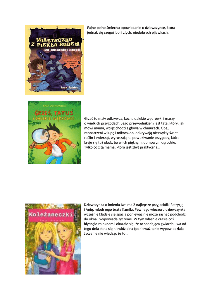 Fajne pełne śmiechu opowiadanie o dziewczynce, która jednak się czegoś boi i złych, niedobrych pijawkach. Grześ to mały odkrywca, kocha dalekie wędrówki i marzy o wielkich przygodach. Jego przewodnikiem jest tata, który, jak mówi mama, wciąż chodzi z głową w chmurach. Obaj, zaopatrzeni w lupę i mikroskop, odkrywają niezwykły świat roślin i zwierząt, wyruszają na poszukiwanie przygody, która kryje się tuż obok, bo w ich pięknym, domowym ogrodzie. Tylko co z tą mamą, która jest zbyt praktyczna... Dziewczynka o imieniu Iwa ma 2 najlepsze przyjaciółki Patrycję i Anię, młodszego brata Kamila. Pewnego wieczoru dziewczynka wcześnie kładzie się spać a ponieważ nie może zasnąć podchodzi do okna i wypowiada życzenie. W tym właśnie czasie coś błysnęło za oknem i okazało się, że to spadająca gwiazda. Iwa od tego dnia stała się niewidzialna (ponieważ takie wypowiedziała życzenie nie wiedząc że to...