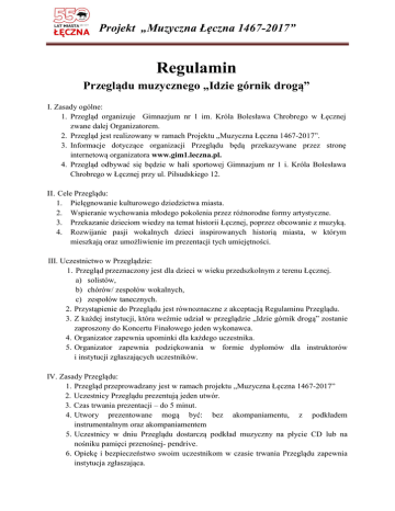 Projekt „Muzyczna Łęczna 1467-2017” Regulamin Przeglądu muzycznego „Idzie górnik drogą” I. Zasady ogólne: 1. Przegląd organizuje Gimnazjum nr 1 im. Króla Bolesława Chrobrego w Łęcznej zwane dalej Organizatorem. 2. Przegląd jest realizowany w ramach Projektu „Muzyczna Łęczna 1467-2017”. 3. Informacje dotyczące organizacji Przeglądu będą przekazywane przez stronę internetową organizatora www.gim1.leczna.pl. 4. Przegląd odbywać się będzie w hali sportowej Gimnazjum nr 1 i. Króla Bolesława Chrobrego w Łęcznej przy ul. Piłsudskiego 12. II. Cele Przeglądu: 1. Pielęgnowanie kulturowego dziedzictwa miasta. 2. Wspieranie wychowania młodego pokolenia przez różnorodne formy artystyczne. 3. Przekazanie dzieciom wiedzy na temat historii Łęcznej, poprzez obcowanie z muzyką. 4. Rozwijanie pasji wokalnych dzieci inspirowanych historią miasta, w którym mieszkają oraz umożliwienie im prezentacji tych umiejętności. III. Uczestnictwo w Przeglądzie: 1. Przegląd przeznaczony jest dla dzieci w wieku przedszkolnym z terenu Łęcznej. a) solistów, b) chórów/ zespołów wokalnych, c) zespołów tanecznych. 2. Przystąpienie do Przeglądu jest równoznaczne z akceptacją Regulaminu Przeglądu. 3. Z każdej instytucji, która weźmie udział w przeglądzie „Idzie górnik drogą” zostanie zaproszony do Koncertu Finałowego jeden wykonawca. 4. Organizator zapewnia upominki dla każdego uczestnika. 5. Organizator zapewnia podziękowania w formie dyplomów dla instruktorów i instytucji zgłaszających uczestników. IV. Zasady Przeglądu: 1. Przegląd przeprowadzany jest w ramach projektu „Muzyczna Łęczna 1467-2017” 2. Uczestnicy Przeglądu prezentują jeden utwór. 3. Czas trwania prezentacji – do 5 minut. 4. Utwory prezentowane mogą być: bez akompaniamentu, z podkładem instrumentalnym oraz akompaniamentem 5. Uczestnicy w dniu Przeglądu dostarczą podkład muzyczny na płycie CD lub na nośniku pamięci przenośnej- pendrive. 6. Opiekę i bezpieczeństwo swoim uczestnikom w czasie trwania Przeglądu zapewnia instytucja zgłaszająca. Projekt „Muzyczna Łęczna 1467-2017” 7. Organizator zapewnia pełną obsługę sceniczną i sprzęt nagłaśniający (mikrofony, odsłuchy, odtwarzacze płyt i nośników pamięci). V. Przebieg Przeglądu: 1. Instytucja zgłasza udział w Przeglądzie poprzez wypełnienie formularza zgłoszeniowego i przesyłanie go w terminie do 30 listopada 2016r. na adres szkoły: Gimnazjum nr 1 im. Króla Bolesława Chrobrego w Łęcznej, ul. Piłsudskiego 12, 21-010 Łęczna. 2. Organizator przed dniem 10 grudnia przekaże uczestnikom Program Przeglądu. 3. Przegląd rozpocznie się dnia 10 grudnia 2016 r., o godz. 10.00. VI. Ochrona danych osobowych. 1. Dane osobowe uczestników Przeglądu są chronione zgodnie z ustawą z dnia 29 sierpnia 1997 r. o ochronie danych osobowych (Dz. U. z 2002 r. Nr 101, poz. 926 z późn. zm.). Opiekun prawny akceptując regulamin wyraża zgodę na przetwarzanie danych osobowych w sprawach związanych z przeprowadzeniem Przeglądu oraz na wykorzystanie nazwiska i wizerunku uczestnika w akcjach informacyjnych i promocyjnych związanych z Przeglądem zgodnie z ustawą z dnia 29 sierpnia 1997 r. o ochronie danych osobowych (Dz. U z 2004 r. poz. 1182). VII. Postanowienia końcowe. 1. W sprawach nieuregulowanych niniejszym Regulaminem decyduje Organizator Przeglądu. 2. Organizatorowi przysługuje prawo do wprowadzania zmian w niniejszym Regulaminie. Wszelkie zmiany stają się obowiązujące po opublikowaniu ich na stronie internetowej organizatora. 3. Dodatkowych informacji udziela Pan Mirosław Kozera i sekretariat Gimnazjum nr 1 im. Króla Bolesława Chrobrego, tel. 81-752-00-3 2 3