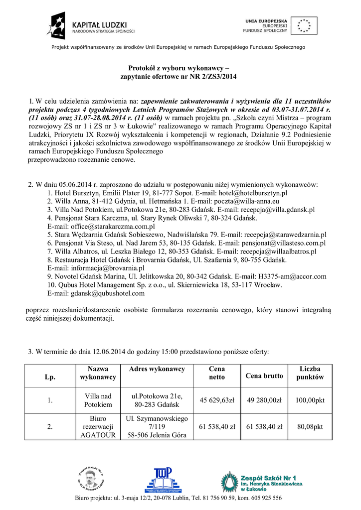 Projekt współfinansowany ze środków Unii Europejskiej w ramach Europejskiego Funduszu Społecznego Protokół z wyboru wykonawcy – zapytanie ofertowe nr NR 2/ZS3/2014 1. W celu udzielenia zamówienia na: zapewnienie zakwaterowania i wyżywienia dla 11 uczestników projektu podczas 4 tygodniowych Letnich Programów Stażowych w okresie od 03.07-31.07.2014 r. (11 osób) oraz 31.07-28.08.2014 r. (11 osób) w ramach projektu pn. „Szkoła czyni Mistrza – program rozwojowy ZS nr 1 i ZS nr 3 w Łukowie” realizowanego w ramach Programu Operacyjnego Kapitał Ludzki, Priorytetu IX Rozwój wykształcenia i kompetencji w regionach, Działanie 9.2 Podniesienie atrakcyjności i jakości szkolnictwa zawodowego współfinansowanego ze środków Unii Europejskiej w ramach Europejskiego Funduszu Społecznego przeprowadzono rozeznanie cenowe. 2. W dniu 05.06.2014 r. zaproszono do udziału w postępowaniu niżej wymienionych wykonawców: 1. Hotel Bursztyn, Emilii Plater 19, 81-777 Sopot. E-mail: [email protected] 2. Willa Anna, 81-412 Gdynia, ul. Hetmańska 1. E-mail: [email protected] 3. Villa Nad Potokiem, ul.Potokowa 21e, 80-283 Gdańsk. E-mail: [email protected] 4. Pensjonat Stara Karczma, ul. Stary Rynek Oliwski 7, 80-324 Gdańsk. E-mail: [email protected] 5. Stara Wędzarnia Gdańsk Sobieszewo, Nadwiślańska 79. E-mail: [email protected] 6. Pensjonat Via Steso, ul. Nad Jarem 53, 80-135 Gdańsk. E-mail: [email protected] 7. Willa Albatros, ul. Leszka Białego 12, 80-353 Gdańsk. E-mail: [email protected] 8. Restauracja Hotel Gdańsk i Brovarnia Gdańsk, Ul. Szafarnia 9, 80-755 Gdańsk. E-mail: [email protected] 9. Novotel Gdańsk Marina, Ul. Jelitkowska 20, 80-342 Gdańsk. E-mail: [email protected] 10. Qubus Hotel Management Sp. z o.o., ul. Skierniewicka 18, 53-117 Wrocław. E-mail: [email protected] poprzez rozesłanie/dostarczenie osobiste formularza rozeznania cenowego, który stanowi integralną część niniejszej dokumentacji. 3. W terminie do dnia 12.06.2014 do godziny 15:00 przedstawiono poniższe oferty: Nazwa wykonawcy Adres wykonawcy 1. Villa nad Potokiem 2. Biuro rezerwacji AGATOUR Lp. Cena netto Cena brutto Liczba punktów ul.Potokowa 21e, 80-283 Gdańsk 45 629,63zł 49 280,00zł 100,00pkt Ul. Szymanowskiego 7/119 58-506 Jelenia Góra 61 538,40 zł 61 538,40 zł 80,08pkt Biuro projektu: ul. 3-maja 12/2, 20-078 Lublin, Tel. 81 756 90 59, kom. 605 925 556 Projekt współfinansowany ze środków Unii Europejskiej w ramach Europejskiego Funduszu Społecznego 4. Uzasadnienie wyboru oferty najkorzystniejszej Wybrano ofertę najkorzystniejszą cenowo – nr 1, oferta jest najkorzystniejsza cenowo i mieści się w kwocie jaką Zamawiający posiada na sfinansowanie zamówienia. Łuków, dnia 16 06 2014r, ..................................................... (podpis prowadzącego postępowanie) Zatwierdzam/nie zatwierdzam ................................................................ Data i podpis osoby upoważnionej Biuro projektu: ul. 3-maja 12/2, 20-078 Lublin, Tel. 81 756 90 59, kom. 605 925 556