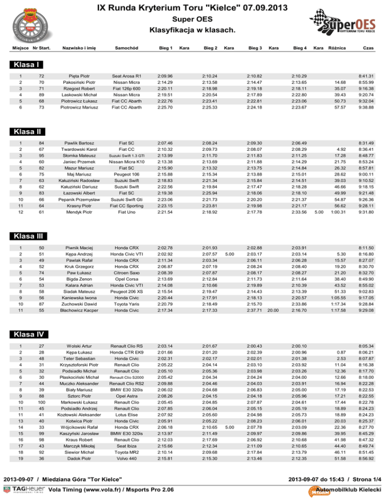 IX Runda Kryterium Toru "Kielce" 07.09.2013 Super OES Klasyfikacja w klasach. Miejsce Nr Start. Nazwisko i imię Samochód Bieg 1 Kara Bieg 2 Kara Bieg 3 Kara Bieg 4 Kara Różnica Czas Klasa I 1 72 Pięta Piotr Seat Arosa R1 2:09.96 2:10.24 2:10.82 2:10.29 2 70 Pakosiński Piotr Nissan Micra 2:14.29 2:13.58 2:14.47 2:13.65 14.68 8:41.31 8:55.99 3 71 Rzegost Robert Fiat 126p 600 2:20.11 2:18.98 2:19.18 2:18.11 35.07 9:16.38 4 89 Laskowski Michał Nissan Micra 2:19.51 2:20.54 2:17.89 2:22.80 39.43 9:20.74 5 68 Piotrowicz Łukasz Fiat CC Abarth 2:22.76 2:23.41 2:22.81 2:23.06 50.73 9:32.04 6 73 Piotrowicz Mariusz Fiat CC Abarth 2:25.70 2:25.33 2:24.18 2:23.67 57.57 9:38.88 Klasa II 1 84 Pawlik Bartosz Fiat SC 2:07.46 2:08.24 2:09.30 2:06.49 2 67 Twardowski Karol Fiat CC 2:10.32 2:09.73 2:08.07 2:08.29 4.92 8:31.49 8:36.41 3 95 Słomka Mateusz Suzuki Swift 1.3 GTI 2:13.99 2:11.70 2:11.83 2:11.25 17.28 8:48.77 4 60 Janiec Przemek Nissan Micra K10 2:13.38 2:13.69 2:11.88 2:14.29 21.75 8:53.24 5 82 Mazur Mariusz Fiat SC 2:15.90 2:13.32 2:13.75 2:14.84 26.32 8:57.81 6 75 Maj Mariusz Peugeot 106 2:15.88 2:15.34 2:13.88 2:15.01 28.62 9:00.11 7 63 Kałuziński Radosław Suzuki Swift 2:18.83 2:21.34 2:15.84 2:14.51 39.03 9:10.52 8 62 Kałuziński Dariusz Suzuki Swift 2:22.56 2:19.84 2:17.47 2:18.28 46.66 9:18.15 9 83 Łazowski Albert Fiat SC 2:19.38 2:25.94 2:18.06 2:18.10 49.99 9:21.48 10 66 Pepanik Przemysław Suzuki Swift Gti 2:23.06 2:21.73 2:20.20 2:21.37 54.87 9:26.36 11 64 Krasny Piotr Fiat CC Sporting 2:23.15 2:23.81 2:19.98 2:21.17 56.62 9:28.11 12 61 Mendyk Piotr Fiat Uno 2:21.54 2:18.92 2:17.78 2:33.56 1:00.31 9:31.80 2:02.88 2:03.91 2:03.17 2:03.14 5.30 8:16.80 5.00 Klasa III 1 50 Piwnik Maciej Honda CRX 2:02.78 2:01.93 2 51 Kępa Andrzej Honda Civic VTI 2:02.92 2:07.57 3 49 Pawlak Rafał Honda CRX 2:11.34 2:03.34 2:06.11 2:06.28 15.57 8:27.07 4 52 Kruk Grzegorz Honda CRX 2:06.87 2:07.19 2:08.24 2:08.40 19.20 8:30.70 5 74 Paw Łukasz Citroen Saxo 2:08.39 2:07.87 2:08.17 2:08.27 21.20 8:32.70 6 54 Bigda Zenon Opel Corsa 2:13.69 2:12.84 2:11.73 2:11.64 38.40 8:49.90 7 53 Kalara Adrian Honda Civic VTI 2:14.08 2:10.66 2:19.89 2:10.39 43.52 8:55.02 8 58 Siadak Mateusz Peugeot 206 XS 2:15.54 2:19.47 2:14.43 2:13.39 51.33 9:02.83 9 56 Kaniewska Iwona Honda Civic 2:20.44 2:17.91 2:18.13 2:20.57 1:05.55 9:17.05 10 87 Zuchowski Dawid Toyota Yaris 2:20.79 2:18.49 2:15.70 2:33.86 1:17.34 9:28.84 11 55 Błachowicz Kacper Honda Civic 2:17.34 2:17.33 2:37.71 2:16.70 1:17.58 9:29.08 5.00 20.00 8:11.50 Klasa IV 1 27 Wolski Artur Renault Clio RS 2:03.14 2:01.67 2:00.43 2:00.10 2 28 Kępa Łukasz Honda CTR EK9 2:01.66 2:01.20 2:02.39 2:00.96 0.87 8:06.21 3 48 Teter Sebastian Honda Civic 2:02.31 2:02.17 2:02.01 2:01.38 2.53 8:07.87 4 31 Krzysztoforski Piotr Renault Clio 2:05.22 2:04.14 2:03.10 2:03.92 11.04 8:16.38 5 32 Podsiadło Michał Renault Clio 2:05.10 2:05.36 2:03.98 2:03.26 12.36 8:17.70 6 30 Płaskociński Michał Renault Clio S2000 2:05.42 2:04.34 2:04.24 2:04.00 12.66 8:18.00 7 44 Muczko Aleksander Renault Clio RS2 2:09.88 2:04.46 2:04.03 2:03.91 16.94 8:22.28 8 39 Biały Mariusz BMW E30 320is 2:06.02 2:04.68 2:06.83 2:05.00 17.19 8:22.53 9 88 Sztorc Piotr Opel Astra 2:08.26 2:04.15 2:04.18 2:05.96 17.21 8:22.55 10 100 Markowski Łukasz Renault Clio 2:05.45 2:04.85 2:07.87 2:04.61 17.44 8:22.78 11 45 Podsiadło Andrzej Renault Clio 2:07.85 2:06.04 2:05.15 2:05.19 18.89 8:24.23 11 41 Kozłowski Aleksander Lotus Elise 2:07.92 2:05.60 2:04.98 2:05.73 18.89 8:24.23 13 40 Kotwica Piotr Honda Civic 2:05.91 2:05.22 2:08.23 2:06.01 20.03 8:25.37 14 33 Wójcikowski Rafał Honda CRX 2:06.18 2:10.65 2:07.78 2:03.09 22.36 8:27.70 15 99 Kaszyński Jarosław BMW E30 320is 2:13.97 2:11.49 2:09.97 2:09.86 39.95 8:45.29 16 98 Kraus Robert Renault Clio 2:12.03 2:17.69 2:06.92 2:10.68 41.98 8:47.32 17 43 Marczyk Mikołaj Seat Ibiza 2:15.66 2:12.34 2:11.09 2:10.65 44.40 8:49.74 18 92 Siewior Michał Toyota MR2 2:10.14 2:09.68 2:17.84 2:13.79 46.11 8:51.45 19 36 Dadok Piotr Volvo 440 2:15.81 2:15.30 2:13.46 2:12.35 51.58 8:56.92 2013-09-07 / Miedziana Góra "Tor Kielce" Vola Timing (www.vola.fr) / Msports Pro 2.06 5.00 8:05.34 2013-09-07 do 15:43 / Strona 1/4 VolaSoftControlPdf Automobilklub Kielecki IX Runda Kryterium Toru "Kielce" 07.09.2013 Super OES Klasyfikacja w klasach. Miejsce Nr Start. Nazwisko i imię Samochód Bieg 1 Kara Bieg 2 Kara Bieg 3 Kara Kara Różnica Czas 2:14.94 52.77 8:58.11 2:08.05 53.26 8:58.60 2:13.75 53.55 8:58.89 2:14.65 1:01.26 9:06.60 20 80 Barcicki Łukasz BMW E36 2:14.85 2:14.42 21 35 Niewiadomy Piotr Honda Civic ITR 2:09.66 2:27.96 22 42 Lokajczyk Piotr Renault Clio 2:15.61 2:16.93 2:12.60 23 37 Kosiński Marek Citroen Xsara 2:16.19 2:15.65 2:20.11 24 47 Szumiec Rafał Subaru Justy 2:18.18 2:18.10 2:17.54 2:17.55 1:06.03 9:11.37 25 93 Zalewski Mateusz Renault Clio 2:22.63 2:17.37 2:16.94 2:15.30 1:06.90 9:12.24 26 77 Wójcik Hubert Renault Clio 2:16.15 2:30.89 2:15.09 2:13.77 1:10.56 9:15.90 27 22 Pniok Andrzej Renault Clio 2:26.27 2:23.07 2:18.98 2:16.95 1:19.93 9:25.27 28 38 Tochowicz Michał Peugeot 205 Rallye GTI 2:37.38 2:18.98 2:16.24 2:14.83 1:22.09 9:27.43 5.00 2:13.90 Bieg 4 20.00 20.00 2:12.93 5.00 5.00 Klasa V 1 16 Widawski Paweł Lotus Exige 1:58.70 1:56.13 1:54.27 1:52.57 2 94 Ostrowski Piotr BMW M3 1:58.00 1:58.68 1:57.50 1:56.72 9.23 7:50.90 3 97 Szebla Rafał BMW M3 1:58.34 1:57.43 1:58.13 1:57.74 9.97 7:51.64 4 25 Pieniążek Przemysław BMW M3 2:00.79 1:58.21 1:56.99 1:56.17 10.49 7:52.16 5 23 Fedorowicz Rafał BMW E46 M3 2:03.26 2:02.88 2:00.46 2:00.00 24.93 8:06.60 6 24 Morengiel Tomasz BMW 336i 2:06.33 2:01.63 1:59.70 1:59.98 25.97 8:07.64 7 15 Kita Rafał BMW E30 M Power 2:00.82 2:01.99 2:03.05 2:01.94 26.13 8:07.80 8 26 Wołoszyn Szymon BMW E36 2:09.14 2:08.19 2:06.16 2:06.43 48.25 8:29.92 9 18 Januszewicz Łukasz BMW Coupe E36 2:12.22 2:11.09 2:09.62 2:09.43 1:00.69 8:42.36 10 19 Turek Marcin Abarth 500 SS 2:14.03 2:14.18 2:13.08 2:14.00 1:13.62 8:55.29 11 21