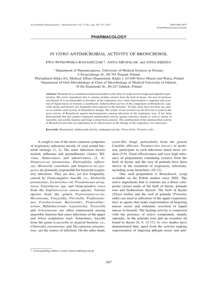 Acta Poloniae Pharmaceutica ñ Drug Research, Vol. 72 No. 2 pp. 367ñ375, 2015 ISSN 0001-6837 Polish Pharmaceutical Society PHARMACOLOGY IN VITRO ANTIMICROBIAL ACTIVITY OF BRONCHOSOL EWA WITKOWSKA-BANASZCZAK1*, ANNA MICHALAK1 and ANNA K DZIA3 Department of Pharmacognosy, University of Medical Sciences in Poznan, 4 åwiÍcickiego St., 60-781 PoznaÒ, Poland 2 Phytopharm KlÍka SA, Medical Affairs Department, KlÍka 1, 63-040 Nowe Miasto nad Wartπ, Poland c Department of Oral Microbiology at Chair of Microbiology of Medical University of Gdansk, 38 Do Studzienki St., 80-227 GdaÒsk, Poland 1 Abstract: Bronchosol is a traditional medicinal product in the form of syrup used in cough and impeded expectoration. The active ingredients that it contains include extracts from the herb of thyme, the root of primrose and thymol. It is recommended in disorders of the respiratory tract when expectoration is impeded and secretion of liquid mucus in bronchi is insufficient. Antimicrobial activity of the components of Bronchosol, especially thyme and thymol, has frequently been reported in the literature. To date, there have not been any studies to confirm such activity of Bronchosol, though. The results of our research are the first one to point to the great activity of Bronchosol against microorganisms causing infections of the respiratory tract. It has been demonstrated that this product displayed antimicrobial activity against reference strains as well as strains of anaerobic and aerobic bacteria and fungi isolated from patients. The confirmation of the antimicrobial activity of Bronchosol provides an explanation of its effectiveness in the therapy of the respiratory tract infections. Keywords: Bronchosol, antibacterial activity, antifungal activity, Thymi herba, Primulae radix yeast-like fungi, particularly from the genera Candida albicans, Pneumocistis jiroveci or protozoa, participate in such infections much more seldom (5-9). Great effectiveness and very high tolerance of preparations containing extracts from the herb of thyme and the root of primula have been shown in the treatment of respiratory infections, including acute bronchitis (10-12). One such preparation is Bronchosol, syrup available on the Polish market since 2002. The active ingredients that it contains are a dense composite extract made of the herb of thyme, primula root and furthermore thymol. The herb of thyme (Thymi herba) and the root of primula (Primulae radix) are used in infections of the upper respiratory tract as agents that make expectoration of lingering mucus easier and stimulate secretion of liquid mucus in bronchi. The healing activity is connected with the presence of active compounds, mainly saponins, in the primula root and an essential oil found in thyme (8, 9, 13-17). In vitro studies have demonstrated that, apart from the activity making expectoration of lingering phlegm easier and anti- A cough is one of the most common symptoms of respiratory infections mostly of viral or/and bacterial etiology (1, 2). The main infectious factors include influenza and parainfluenza viruses, RSvirus, rhinoviruses and adenoviruses (3, 4). Streptococcus pneumoniae, Haemophilus influenzae, Moraxella catarrhalis and Streptococcus pyogenes are primarily responsible for bacterial respiratory infections. They are also, yet less frequently, caused by Gram-negative baccilli, i.e., Klebsiella pneumoniae, Escherichia coli, Pseudomonas aeruginosa, Enterobacter spp. and Gram-positive cocci from the Staphylococcus aureus species. Various species from the genera Peptostreptococcus, Micromonas, Finegoldia, Prevotella, Porphyromonas, Fusobacterium, Bacteroides, Propionibacterium, Bifidobacterium, Leptotrichia, Tissierella and Selenomonas are often enumerated among anaerobic bacteria that cause infections of the upper and lower respiratory tract. Sometimes, baccilli from the genus Legionella or atypical bacteria, i.e., Chlamydia pneumoniae and Mycoplasma pneumoniae, are the source of infection. On the other hand, * Corresponding author: e-mail: [email protected] 367 368 EWA WITKOWSKA-BANASZCZAK et al. inflammatory activity (18, 19), the saponins from primula root show immunostimulant activity (8, 13, 15, 19, 20). Moreover, antimicrobial activity of extracts from primula root has been proven (19), but reports on this topic are sporadic. The essential oil as well as extracts from thyme show expectorant activity. It has been demonstrated that extracts from thyme and thyme oil decrease tension of bronchial smooth muscles and have anti-inflammatory activity (19, 21-24). A number of studies have concerned the antimicrobial activity of the extracts and essential oil from thyme. This activity is connected to a large extent with the presence of thymol, the main component of the essential oil (16, 20, 25, 26). It has been proven that perforation of bacterial cell membrane may be the key way of the antimicrobial activity of thymol. The measurement of the cell content outflow resulting from the activity of thymol has been made for bacteria found in the oral cavity, such as Porphyromonas gingivalis, Selenomonas artemidis, Streptococcus sorbinus. The decrease in intracellular ATP observed in S. sobrinus and P. gingivalis as well as the inhibition of ATP generation in P. gingivalis have been associated with the leak of the cell content (27). Great antimicrobial activity of the essential oil from the herb of thyme against bacteria causing respiratory infections most frequently, i.e., Streptococcus pyogenes (62 strains), Streptococcus agalactiae (20 strains), Streptococcus pneumoniae (6 strains) Klebsiella pneumoniae (6 strains), Haemophilus influenzae (25 strains), Staphylococcus aureus (5 strains), Stenotrophomonas maltophilia (5 strains), obtained from patients suffering from respiratory infections, has been demonstrated. Haemophilus influenzae and Stenotrophomonas maltophilia have been most susceptible to the activity of the oil from Thymus vulgaris, follow