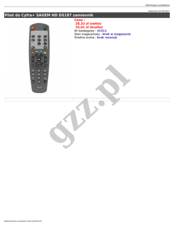 Informacje o produkcie Utworzono 07-03-2017 Pilot do Cyfra+ SAGEM HD DS187 zamiennik Cena : 20,33 zł (netto) 25,01 zł (brutto) gz z .p l Nr katalogowy : 41511 Stan magazynowy : brak w magazynie Średnia ocena : brak recenzji Wygenerowano w programie www.oscGold.com