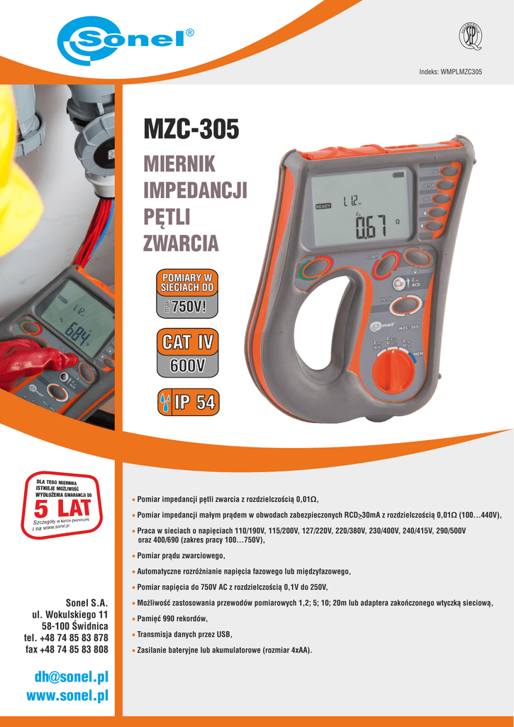 Indeks: WMPLMZC305 MZC-305 MIERNIK IMPEDANCJI PĘTLI ZWARCIA max. POMIARY W SIECIACH DO 750V! IP 54 ! Pomiar impedancji pętli zwarcia z rozdzielczością 0,01Ω, ! Pomiar impedancji małym prądem w obwodach zabezpieczonych RCD>30mA z rozdzielczością 0,01Ω (100…440V), ! Praca w sieciach o napięciach 110/190V, 115/200V, 127/220V, 220/380V, 230/400V, 240/415V, 290/500V oraz 400/690 (zakres pracy 100…750V), ! Pomiar prądu zwarciowego, ! Automatyczne rozróżnianie napięcia fazowego lub międzyfazowego, ! Pomiar napięcia do 750V AC z rozdzielczością 0,1V do 250V, Sonel S.A. ul. Wokulskiego 11 58-100 Świdnica tel. +48 74 85 83 878 fax +48 74 85 83 808 [email protected] www.sonel.pl ! Możliwość zastosowania przewodów pomiarowych 1,2; 5; 10; 20m lub adaptera zakończonego wtyczką sieciową, ! Pamięć 990 rekordów, ! Transmisja danych przez USB, ! Zasilanie bateryjne lub akumulatorowe (rozmiar 4xAA). MZC-305 Wyposażenie standardowe miernika MZC-305: Pomiar impedancji pętli zwarcia (ZL-PE oraz ZL-N, L-L) Zakres pomiarowy wg IEC61557 dla przewodów 1,2m: 0,13...1999Ω, dla wtyczki Uni-Schuko 0,25...1999Ω Zakres Rozdzielczość Błąd podstawowy 0,00...19,99Ω 0,01Ω ±(5% w.m. + 3 cyfry) 20,0...199,9Ω 0,1Ω ±(4% w.m. + 3 cyfry) 200...1999Ω 1Ω ±(4% w.m. + 3 cyfry) - przewód 1,2m żółty zakończony wtykami bananowymi WAPRZ1X2YEBB - przewód 1,2m niebieski zakończony wtykami bananowym WAPRZ1X2BUBB - przewód 1,2m czerwony zakończony wtykami bananowym WAPRZ1X2REBB - krokodylek niebieski K02 WAKROBU20K02 - krokodylek czerwony K02 WAKRORE20K02 - sonda ostrzowa niebieska z gniazdem bananowym WASONBUOGB1 ! napięcia nominalne sieci: 110/190V, 115/200V, 127/220V, 220/380V, 230/400V, 240/415V, - sonda ostrzowa czerwona z gniazdem bananowym WASONREOGB1 290/500V oraz 400/690, ! zakres napięć dla pomiaru pętli: 100…440V dla ZL-PE, ZL-N, 100…750V dla ZL-L, ! pomiar dużym prądem (max. 30A), ! częstotliwość pracy 45…65Hz, ! kontrola poprawności podłączenia zacisku PE przy pomocy elektrody dotykowej (dotyczy ZL-PE), ! pomiar odbywa się rownież przy zamienionych przewodach L i N, ! pomiar składowej rezystancyjnej i reaktancyjnej, ! obliczanie prądu zwarciowego. - sonda ostrzowa zółta z gniazdem bananowym WASONYEOGB1 WAFUTL4 - futerał L-4 na miernik i jego wyposażenie WAPRZUSB - przewód do transmisji danych USB WAPOZSZE2 - szelki do noszenia miernika - komplet baterii - karta gwarancyjna - certyfikat kalibracji - instrukcja obsługi Pomiar impedancji pętli zwarcia (ZL-PE RCD ) Zakres pomiarowy wg IEC61557 dla przewodów 1,2m: 0,43...1999Ω,dla wtyczki Uni-Schuko: 0,50...1999Ω Zakres Rozdzielczość 0,00...19,99Ω 0,01Ω 20,0...199,9Ω 0,1Ω 200...1999Ω 1Ω Błąd podstawowy ±(6% w.m. + 10 cyfr) ±(6% w.m. + 5 cyfr) ! roboczy zakres napięć dla pomiaru pętli: 100…440V ! napięcia nominalne sieci: 110V, 115V, 127V, 220V, 230V, 240V, 290V, 400V, ! kontrola poprawności podłączenia zacisku PE przy pomocy elektrody dotykowej, ! pomiar odbywa się rownież przy zamienionych przewodach L i N, ! pomiar składowej rezystancyjnej i reaktancyjnej, ! obliczanie prądu zwarciowego. Pomiar napięć przemiennych Zakres Rozdzielczość Błąd podstawowy 0,0...249,9V 0,1V ±(2% w.m. + 4 cyfry) 250...750V 1V ±(2% w.m. + 2 cyfry) ! pomiar dostępny dla każdej funkcji pomiaru pętli zwarcia (ZL-PE, ZL-PE RCD oraz ZL-N,L-L), ! częstotliwość pracy 45…65Hz, ! przekroczenie zakresu sygnalizowane sygnałem dźwiękowym. Bezpieczeństwo elektryczne: - rodzaj izolacji - przewody pomiarowe - kategoria pomiarowa - stopień ochrony obudowy Wyposażenie dodatkowe miernika MZC-305: - adapter WS-05 z kątowym wtykiem UNI-Schuko WAADAWS05 - adapter WS-01 z przyciskiem wyzwalającym pomiar (wtyk UNI-Schuko) WAADAWS01 - Program do tworzenia protokołów pomiarowych „SONEL Pomiary Elektryczne PE4” WAPROSONPE4 - AGT-16P (adapter gniazd trójfazowych) WAADAAGT16P - AGT-32P (adapter gniazd trójfazowych) WAADAAGT32P - AGT-63P (adapter gniazd trójfazowych) WAADAAGT63P - AGT-16C (adapter gniazd trójfazowych) WAADAAGT16C - AGT-32C (adapter gniazd trójfazowych) WAADAAGT32C - AGT-16T (adapter gniazd wysokoprądowych) WAADAAGT16T - AGT-32T (adapter gniazd wysokoprądowych) WAADAAGT32T - przewód 5m czerwony zakończony wtykami bananowym WAPRZ005REBB - przewód 10m czerwony zakończony wtykami bananowym WAPRZ010REBB - przewód 20m czerwony zakończony wtykami bananowym WAPRZ020REBB - świadectwo wzorcowania podwójna, zgodnie z PN-EN 61010-1 PN-EN 61010-2-031 CAT IV 600V (CAT III 1000V) IP54 Pozostałe dane techniczne: - zasilanie miernika pakiet akumulatorów lub baterii alkalicznych (rozmiar AA, 4 szt.) - wydajność akumulatorów lub baterii alkalicznych min. 3000 pomiarów - wykrywanie zmiany baterii wybór bateria/akululator w menu - funkcja automatycznego wyłączenia (auto-off) - złącze komunikacyjne USB - pamięć 10 banków po 99 rekordów - wyświetlacz podświetlany LED - wymiary 260x190x60mm - masa ok. 2,2 kg Nominalne warunki użytkowania: - temperatura pracy -temperatura przechowywania - wilgotność 0...+45°C -20...60°C 20-80% Przyrząd spełnia wymagania EMC. Zawartość niniejszego folderu nie stanowi oferty w rozumieniu prawa i jest publikowany dla celów informacyjnych bez odpowiedzialności prawnej. v.2