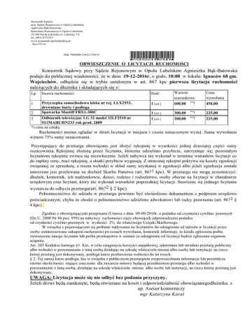 Komornik Sądowy przy Sądzie Rejonowym w Opolu Lubelskim Agnieszka Bąk-Batowska Kancelaria Komornicza w Opolu Lubelskim 24-300 Opole Lubelskie ul. Lubelska 7/4 tel. (081) 8272315 www.komornik-opolelubelskie.pl Km 675/16 #KK *0020001150121*/0419/ *0020001150121* OBWIESZCZENIE O LICYTACJI RUCHOMOŚCI Komornik Sądowy przy Sądzie Rejonowym w Opolu Lubelskim Agnieszka Bąk-Batowska podaje do publicznej wiadomości, że w dniu 19-12-2016r. o godz. 10:00 w lokalu: Ignaców 68 gm. Wojciechów, odbędzie się w trybie ustalonym w art. 867 kpc pierwsza licytacja ruchomości należących do dłużnika i składających się z: Lp. Nazwa ruchomości Przyczepka samochodowa lekka nr rej. LLX2553, drewniane burty i podłoga Spawarka Mastiff FBX1-300C 2 Odbiornik telewizyjny LG 32 model 32LF2510 nr 3 911MAHUHN233 rok prod. 2009 *) cena za sztukę 1 1 [szt.] Wartość szacunkowa 600,00 **) 1 [szt.] 1 [szt.] 300,00 300,00 Ilość **) **) Cena wywołania 450,00 225,00 225,00 Ruchomości można oglądać w dzień licytacji w miejscu i czasie oznaczonym wyżej. Suma wywołania wynosi 75% sumy oszacowania. Przystępujący do przetargu obowiązany jest złożyć rękojmię w wysokości jednej dziesiątej części sumy oszacowania. Rękojmię złożoną przez licytanta, któremu udzielono przybicia, zatrzymuje się; pozostałym licytantom rękojmię zwraca się niezwłocznie. Jeżeli nabywca nie wykonał w terminie warunków licytacji co do zapłaty ceny, traci rękojmię, a skutki przybicia wygasają. Z utraconej rękojmi pokrywa się koszty egzekucji związanej ze sprzedażą, a reszta wchodzi w skład sumy uzyskanej w egzekucji albo jeżeli egzekucja została umorzona jest przelewana na dochód Skarbu Państwa (art. 8671 kpc). W przetargu nie mogą uczestniczyć: dłużnik, komornik, ich małżonkowie, dzieci, rodzice i rodzeństwo, osoby obecne na licytacji w charakterze urzędowym oraz licytant, który nie wykonał warunków poprzedniej licytacji. Stawienie się jednego licytanta wystarcza do odbycia przetargu(art. 8672 § 2 kpc). Pełnomocnictwo do udziału w przetargu powinno być stwierdzone dokumentem z podpisem urzędowo poświadczonym, chyba że chodzi o pełnomocnictwo udzielone adwokatowi lub radcy prawnemu (art. 8672 § 4 kpc) Zgodnie z obowiązującymi przepisami (Ustawa z dnia 09-09-2010r. o podatku od czynności cywilno- prawnych (Dz.U. 2000 Nr 86 poz. 959) na nabywcy ruchomości ciąży obowiązek odprowadzenia podatku od czynności cywilno-prawnych w wyskości 2% do właściwego Urzędu Skarbowego. W związku z pojawiającymi się próbami wpływania na licytantów do odstąpienia od udziału w licytacji przez osoby zainteresowane zakupem ruchomości po cenach wywołania, komornik informuje, że każda zgłoszona próba zastraszenia innego licytanta lub próba przekupstwa w zamian za odstąpienie od licytacji będzie zgłaszana organom ścigania. Art. 305 Kodeksu karnego §1. Kto, w celu osiągnięcia korzyści majątkowej, udaremnia lub utrudnia przetarg publiczny albo wchodzi w porozumienie z inną osobą działając na szkodę właściciela mienia albo osoby lub instytucji, na rzecz której przetarg jest dokonywany, podlega karze pozbawienia wolności do lat trzech. § 2. Tej samej karze podlega, kto w związku z publicznym przetargiem rozpowszechania informacje lub przemilcza istotne okoliczności mające znaczenie dla zawarcia umowy będącej przedmiotem przetargu albo wchodzi w porozumienie z inną osobą, działając na szkodę właściciela mienia albo osoby lub instytucji, na rzecz której przetarg jest dokonywany. UWAGA: Licytacja może się nie odbyć bez podania przyczyny. Jeżeli drzwi będą zamknięte, będą otwierane na koszt i odpowiedzialność obowiązanegodłużnika. z up. Asesor komorniczy mgr Katarzyna Karaś