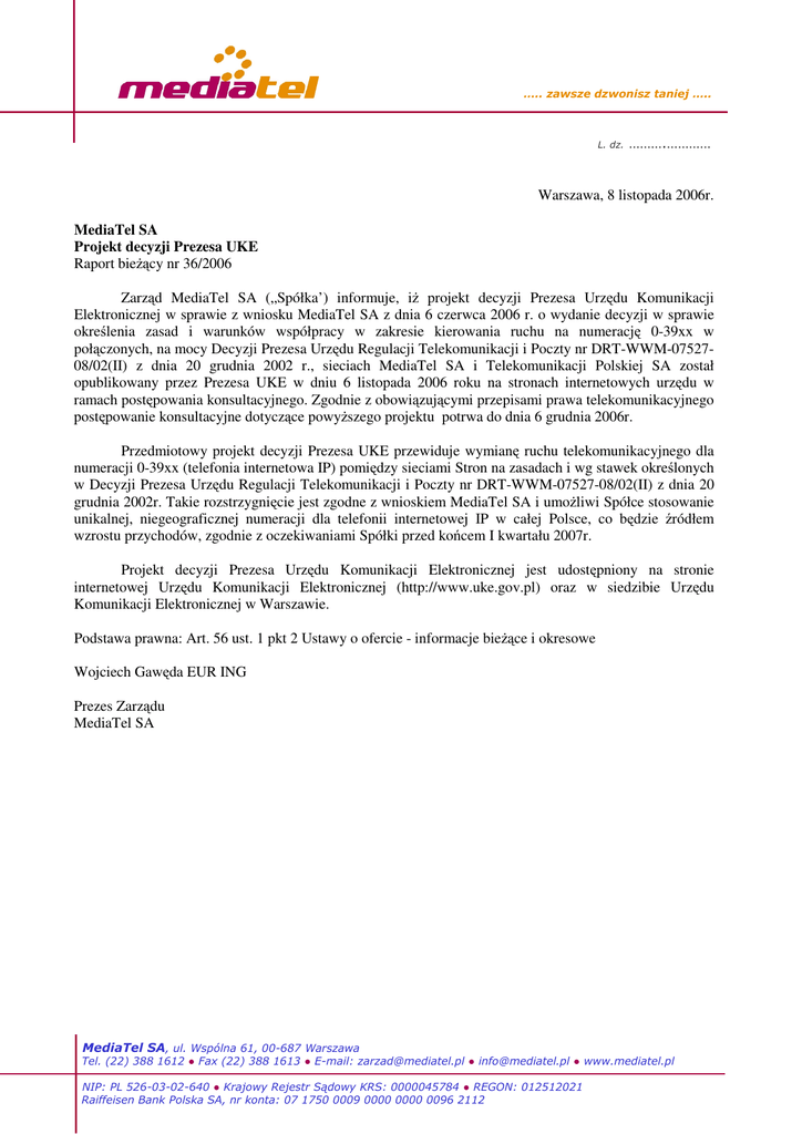 Warszawa, 8 listopada 2006r. MediaTel SA Projekt decyzji Prezesa UKE Raport bie cy nr 36/2006 Zarz d MediaTel SA („Spółka’) informuje, i projekt decyzji Prezesa Urz du Komunikacji Elektronicznej w sprawie z wniosku MediaTel SA z dnia 6 czerwca 2006 r. o wydanie decyzji w sprawie okre lenia zasad i warunków współpracy w zakresie kierowania ruchu na numeracj 0-39xx w poł czonych, na mocy Decyzji Prezesa Urz du Regulacji Telekomunikacji i Poczty nr DRT-WWM-0752708/02(II) z dnia 20 grudnia 2002 r., sieciach MediaTel SA i Telekomunikacji Polskiej SA został opublikowany przez Prezesa UKE w dniu 6 listopada 2006 roku na stronach internetowych urz du w ramach post powania konsultacyjnego. Zgodnie z obowi zuj cymi przepisami prawa telekomunikacyjnego post powanie konsultacyjne dotycz ce powy szego projektu potrwa do dnia 6 grudnia 2006r. Przedmiotowy projekt decyzji Prezesa UKE przewiduje wymian ruchu telekomunikacyjnego dla numeracji 0-39xx (telefonia internetowa IP) pomi dzy sieciami Stron na zasadach i wg stawek okre lonych w Decyzji Prezesa Urz du Regulacji Telekomunikacji i Poczty nr DRT-WWM-07527-08/02(II) z dnia 20 grudnia 2002r. Takie rozstrzygni cie jest zgodne z wnioskiem MediaTel SA i umo liwi Spółce stosowanie unikalnej, niegeograficznej numeracji dla telefonii internetowej IP w całej Polsce, co b dzie ródłem wzrostu przychodów, zgodnie z oczekiwaniami Spółki przed ko cem I kwartału 2007r. Projekt decyzji Prezesa Urz du Komunikacji Elektronicznej jest udost pniony na stronie internetowej Urz du Komunikacji Elektronicznej (http://www.uke.gov.pl) oraz w siedzibie Urz du Komunikacji Elektronicznej w Warszawie. Podstawa prawna: Art. 56 ust. 1 pkt 2 Ustawy o ofercie - informacje bie ce i okresowe Wojciech Gaw da EUR ING Prezes Zarz du MediaTel SA ! "# ()*# * + 0 "&& " 5 , 6 *' 6 17 .' / 0 . 6' % # % 12 ' / -01# + 8 $! " % ,+ , 8 " &'$! " % 0 34(# + ! " %