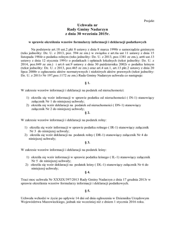 Projekt Uchwała nr Rady Gminy Nadarzyn z dnia 30 września 2015r. w sprawie określenia wzorów formularzy informacji i deklaracji podatkowych Na podstawie art.18 ust.2 pkt 8 ustawy z dnia 8 marca 1990r o samorządzie gminnym (teks jednolity: Dz. U. z 2013, poz. 594 ze zm.) w związku z art.6a ust 11 ustawy z dnia 15 listopada 1984r o podatku rolnym (teks jednolity: Dz. U. z 2013, poz.1381 ze zm.), art6 ust.13 ustawy z dnia 12 stycznia 1991r o podatkach i opłatach lokalnych (tekst jednolity: Dz. U. z 2014, poz.849 ze zm.) i art.6 ust.9 ustawy z dnia 30 października 2002r o podatku leśnym (tekst jednolity: Dz. U. z 2013, poz.465 ze zm.) oraz art.4 ust.1, art.13 pkt.2 ustawy z dnia 20 lipca 2000r o ogłaszaniu aktów normatywnych i niektórych aktów prawnych (tekst jednolity: Dz. U. z 2011r Nr 197,poz.1172 ze zm.) Rada Gminy Nadarzyn uchwala co następuje: § 1. W zakresie wzorów informacji i deklaracji na podatek od nieruchomości: 1) określa się wzór informacji w sprawie podatku od nieruchomości ( IN-1) stanowiący załącznik Nr 1 do niniejszej uchwały; 2) określa się wzór deklaracji na podatek od nieruchomości ( DN-1) stanowiący załącznik Nr 2 do niniejszej uchwały; § 2. W zakresie wzorów informacji i deklaracji na podatek rolny: 1) określa się wzór informacji w sprawie podatku rolnego ( IR-1) stanowiący załącznik Nr 3 do niniejszej uchwały; 2) określa się wzór deklaracji na podatek rolny ( DR-1) stanowiący załącznik Nr 4 do niniejszej uchwały; § 3. W zakresie wzorów informacji i deklaracji na podatek leśny: 1) określa się wzór informacji w sprawie podatku leśnego ( IL-1) stanowiący załącznik Nr 5 do niniejszej uchwały; 2) określa się wzór deklaracji na podatek leśny ( DL-1) stanowiący załącznik Nr 6 do niniejszej uchwały; § 4. Traci moc uchwała Nr XXXIX/397/2013 Rady Gminy Nadarzyn z dnia 17 grudnia 2013r w sprawie określenia wzorów formularzy informacji i deklaracji podatkowych. § 5. Uchwała wchodzi w życie po upływie 14 dni od dnia ogłoszenia w Dzienniku Urzędowym Województwa Mazowieckiego, jednak nie wcześniej niż z dniem 1 stycznia 2016 roku.