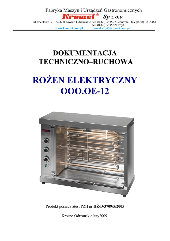 Fabryka Maszyn i Urządzeń Gastronomicznych R Sp z o.o. ul.Pocztowa 30 66-600 Krosno Odrzańskie tel. (0-68) 3835273 centrala fax (0-68) 3835461 tel. (0-68) 3835324 zbyt www.kromet.com.pl e-mail [email protected] DOKUMENTACJA TECHNICZNO–RUCHOWA ROŻEN ELEKTRYCZNY OOO.OE-12 Produkt posiada atest PZH nr HŻ/D/3709/5/2005 Krosno Odrzańskie luty2009. Dokumentacja Techniczno - Ruchowa Rożen El. 000.OE-12. Spis Treści Skrócona instrukcja obsługi. 1. Charakterystyka ogólna. 2. Charakterystyka techniczna. 3. Instrukcja eksploatacji. 4. Instrukcja obsługi. 5. Wskazania Bezpieczeństwa i Higieny Pracy. 6. Instrukcja konserwacji i remontu. 7. Wykaz części zamiennych. 8. Schemat elektryczny Rożna. 3 Dokumentacja Techniczno - Ruchowa Rożen El. 000.OE-12. 4 DO NABYWCÓW I UŻYTKOWNIKÓW ROŻNA ELEKTRYCZNEGO Szanowni Państwo! Staliście się Państwo posiadaczami nowego typu rożna Elektrycznego, zaprojektowanego specjalnie z myślą o spełnieniu Państwa oczekiwań. Mamy nadzieję, że dzięki swoim zaletom Rożen Elektryczny będzie Państwu długo i dobrze służyć. Aby nasz wyrób dał Państwu wiele zadowolenia prosimy zapoznać się z niniejszą Instrukcją Obsługi. Przestrzeganie instrukcji zapewni długotrwałe i niezawodne działanie Rożna, a tym samym przyniesie korzyści i zadowolenie z nabytego urządzenia. Producent zastrzega sobie prawo do wprowadzenia zmian w konstrukcji wpływających na podwyższenie walorów eksploatacyjnych. Życzymy zadowolenia z użytkowania naszego wyrobu. UWAGA ! Tylko osoba mająca uprawnienia może dokonać podłączenia Rożna do sieci elektrycznej. Korzystajcie Państwo z usług fachowców z uprawnieniami. Dokumentacja Techniczno - Ruchowa Rożen El. 000.OE-12. 5 Skrócona Instrukcja Obsługi Rożna Elektrycznego 1. Sposób uruchomienia rożna. wtyczkę kabla zasilającego włożyć w gniazdo. umieścić wsad w przestrzeni roboczej a następnie przełącznikami włączyć odpowiednie grzałki, wraz z rozpoczęciem grzania należy uruchomić napęd (każdy widelec posiada niezależne grzanie), gdy proces grzania zostanie zakończony należy nastawić przełącznik grzałek w pozycję „0”. 2. Czynności po zakończeniu pracy w urządzeniu. wyłączyć grzałki, silnik, wyciągnąć wtyczkę z gniazdka, po ostygnięciu wysunąć szufladę, opróżnić ją z zanieczyszczeń powstałych podczas procesu opiekania, a następnie umyć w ciepłej wodzie z dodatkiem środków czyszczących. UWAGA! 1. Mycie i czyszczenie urządzenia dokonujemy po uprzednim odłączeniu urządzenia od źródła zasilania. 2. Przed zainstalowaniem i uruchomieniem Rożna użytkownik zobowiązany jest zapoznać się z treścią niniejszej DTR. 3. Przestrzeganie zaleceń instrukcji obsługi i użytkowania urządzenia zgodnie z przeznaczeniem zapewni bezpieczną i długotrwałą eksploatację rożna. 4. Skróconą instrukcję obsługi umieszczoną na początku DTR należy wyjąć, odpowiednio oprawić i umieścić w widocznym miejscu 1. Charakterystyka ogólna. Rożna Elektryczne typu OE przeznaczone są do pieczenia (przez opiekanie) drobiu i innych gatunków mięs. Urządzenia mogą być wykorzystywane w małych zakładach gastronomicznych jak też dużych restauracjach, placówkach gastronomicznych itp. Dokumentacja Techniczno - Ruchowa Rożen El. 000.OE-12. Rys.1. Widok ogólny Rożna Elektrycznego 000.OE-12. Ogólny podział na podzespoły. 6 Dokumentacja Techniczno - Ruchowa Rożen El. 000.OE-12. Rys.2. Podstawowa budowa Rożna Elektrycznego OE-12 . Wykaz części zamiennych w tabeli 2 2. Charakterystyka techniczna. Tabela 1. Charakterystyka techniczna Rożny Elektrycznego 7 Dokumentacja Techniczno - Ruchowa Dane techniczne Wym gab. AxBxH mm Moc kW Napięcie zasilające V Stopień ochronny Klasa ochrony Wsad kurczaków szt. Max. czas opiekania min Masa urządzenia kg Rożen El. 000.OE-12. 8 000.OE-12 1000x408x772 7,5 3NPE-230/400 IP21 I 12-15 78 90 Opis wyglądu ważniejszych zespołów. Rożna typu OE posiadają konstrukcje samonośną. Obudowa oraz części stykające się bezpośrednio z produktami żywnościowymi wykonane są ze stali nierdzewnej-kwasoodpornej. Przestrzeń robocza osłonięta jest szybą hartowaną (9), umożliwiającą obserwowanie procesu pieczenia, wewnątrz umieszczone są grzałki (7). Każdy widelec (15) posiada niezależne grzanie. Pracą urządzenia steruje przełącznik grzałek (13) oraz łącznik klawiszowy (14), sygnalizują lampki (16). Zastosowany napęd zapewnia obrót widelców wokół własnej osi. Powstające podczas opiekania zanieczyszczenia zbierają się w szufladzie (17). Na życzenie odbiorcy do wyrobu dołączane mogą być koszyczki umożliwiające opiekanie kotletów mięsnych, kiełbasek itp. 3. Instrukcja eksploatacji. Pakowanie, ładowanie, transport . Rożen ładowany jest w karton. Ładownie Rożny na środki transportu, rozładowanie oraz przenoszenie powinno się odbywać odpowiednimi urządzeniami dźwigowymi. Przewóz urządzenia powinien odbywać się krytymi środkami transportu. Należy je zabezpieczyć przed przesuwaniem, przewracaniem, silnymi wstrząsami oraz innymi uszkodzeniami mechanicznymi. Po otrzymaniu Opiekacza należy go rozpakować, usunąć folię zabezpieczającą, przetrzeć wilgotną szmatką z dodatkiem środków czyszczących. Dokumentacja Techniczno - Ruchowa Rożen El. 000.OE-12. 9 Instalowanie Rożna Elektrycznego. Ustawić Rożen w pomieszczeniu dla niego przeznaczonym na podłożu twardym, niepalnym, w odległości minimum 50 mm od ścian (niepalnych) i innych urządzeń. Rożen wyposażony jest w giętki przewód przyłączeniowy z wtyczką N+Z 3 x 16A, która musi być podłączona do gniazda tego samego typu zasilanego przewodem 5 x 2,5mm2 zabezpieczonego wyłącznikiem instalacyjnym S 303B 20A z wyłącznikiem różnicowoprądowy In = 25A, IΔn = 30mA. UWAGA ! Gniazdo przyłączeniowe musi posiadać ważne pomiary skuteczności ochrony od porażeń elektrycznych. Jeżeli przewó
