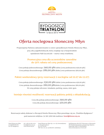 Oferta noclegowa Słoneczny Młyn Proponujemy Państwu zakwaterowanie w cztero-gwiazdkowym Hotelu Słoneczny Młyn, przy ulicy Jagiellońskiej 96, który znajduje się w bezpośrednim sąsiedztwie Hali Łuczniczki – startu i mety triathlonu. Promocyjna cena dla uczestników zawodów do 50% rabatu od ceny podstawowej. Cena pokoju jednoosobowego: 240,00 pln /doba [cena podstawowa 430,00 pln] Cena pokoju dwuosobowego: 280,00 pln /doba [cena podstawowa 560,00 pln] Pakiet weekendowy (przy rezerwacji 2 noclegów od 10.07 do 12.07) Cena pokoju jednoosobowego: 230,00 pln /doba [cena podstawowa 430,00 pln] Cena pokoju dwuosobowego: 260,00 pln/doba [cena podstawowa 560,00 pln] W cenę pokoju wliczone: śniadanie, parking, sauna, mini-gym. Istnieje również możliwość rezerwacji pakietu pokój z obiadokolacją Cena dla pokoju jednoosobowego: 290,00 pln Cena dla pokoju dwuosobowego: 320,00 pln Rezerwacje należy dokonać w Recepcji Hotelu Słoneczny Młyn powołując się na: „Triathlon Bydgoszcz” pod numerem telefonu: 52 561 3160 lub mailowo: [email protected] Hotel Słoneczny Młyn ul. Jagiellońska 96 85-027 Bydgoszcz tel. (+48 52) 561 31 00 [email protected] www.sloneczny.eu Hotel Słoneczny Młyn Sp. z o.o. Sp. komandytowa ul. Świętokrzyska 6 96-515 Teresin NIP: 837-173-24-34 REGON: 140808593 Sąd Rejonowy dla M.ST. Warszawy w Warszawie XIV Wydział Gospodarczy Krajowego Rejestru Sądowego, KRS nr 0000268895, Suma komandytowa 18 210.500