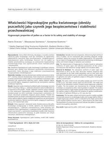 Ocieczek Probl HigAEpidemiol i wsp. Właściwości 2015, 96(4): higroskopijne 821-826 pyłku kwiatowego (obnóży pszczelich) jako czynnik jego bezpieczeństwa ... 821 Właściwości higroskopijne pyłku kwiatowego (obnóży pszczelich) jako czynnik jego bezpieczeństwa i stabilności przechowalniczej Hygroscopic properties of pollen as a factor in its safety and stability of storage Aneta Ocieczek 1/, Magdalena Skotnicka 2/, Katarzyna Kłopotek 1/ 1/ 2/ Katedra Organizacji Usług Turystyczno-Hotelarskich, Akademia Morska w Gdyni Zakład Chemii Ekologii i Towaroznawstwa Żywności, Gdański Uniwersytet Medyczny Wprowadzenie. Cenny skład chemiczny, decydujący o wysokiej wartości odżywczej pyłku kwiatowego, może być zachowany po zapewnieniu odpowiednich warunków jego przechowywania, uwzględniających higroskopijność pyłku kwiatowego. Parametr ten ma wpływ na trwałość przechowalniczą wyrażającą się zachowaniem bezpieczeństwa mikrobiologicznego oraz ograniczeniem zmian hydratacyjnych i oksydacyjnych. Cel. Określenie higroskopijności pyłku kwiatowego na podstawie izotermy adsorpcji pary wodnej oraz wybranych parametrów mikrostruktury powierzchni, które decydują o jego stabilności przechowalniczej i bezpieczeństwie mikrobiologicznym. Materiały i metody. Izotermę adsorpcji pary wodnej wyznaczono w temp. 20°C metodą statyczno-eksykatorową. Dane empiryczne przedstawiono w postaci parametrów modelu GAB, a na ich podstawie oszacowano takie parametry jak: powierzchnię właściwą sorpcji, ogólną objętość kapilar oraz promień kapilar ulegających wypełnieniu po zainicjowaniu zjawiska kondensacji kapilarnej. Wyniki. Zawartość wody w badanych próbkach pyłku kwiatowego wynosiła 10,577±0,278 g/100 g s.s., natomiast aktywność wody kształtowała się na poziomie 0,443±0,001. Kształt i położenie izotermy sorpcji wskazują na silne właściwości higroskopijne pyłku kwiatowego. Badany produkt charakteryzował się silnie rozwiniętą monowarstwą w porównaniu do innych naturalnych produktów mających postać proszku. Produkt ten charakteryzował się bardzo rozwiniętą powierzchnią właściwą sorpcji przy niskiej ogólnej objętości kapilar, ulegających wypełnieniu po zainicjowaniu kondensacji kapilarnej. Wartość promienia kapilar ulegających wypełnieniu przy aw=0,5 również była niska. Wnioski. Niska zawartość i aktywność wody charakterystyczna dla pyłku kwiatowego występującego w handlu zapewnia mu bezpieczeństwo mikrobiologiczne i stabilność przechowalniczą. Pyłek kwiatowy jest produktem silnie higroskopijnym, co pokazuje kształt i położenie izotermy sorpcji oraz wartość vm wyznaczona na podstawie modelu GAB. Parametry mikrostruktury powierzchni wskazują, że pyłek kwiatowy jest silnym naturalnym adsorbentem mikrokapilarnym. Introduction. Valuable chemical composition, determining high nutritional value of pollen, can be maintained after providing adequate storage conditions, taking into account the pollen hygroscopicity. This parameter has an impact on storage stability, expressed by maintaining microbiological safety and limited changes in hydration and oxidation. Aim. The determination of hygroscopicity of pollen based on adsorption isotherms of water vapor and selected parameters of the surface microstructure that determine storage stability and microbial safety. Material & Method. The adsorption isotherm of water vapor was determined at 20°C by the static desiccator method. Empirical data were presented as the GAB model parameters and on their basis were estimated the parameters such as: specific surface sorption, total capacity of capillaries and radius of capillaries subject to filling after initiating the capillary condensation. Results. The water content in the test pollen samples was 10.577±0.278 g/100 g d.m. and water activity stood at 0.443±0.001. The shape and position of the adsorption isotherm showed strong hygroscopic properties of pollen. The test product was characterized by a strongly developed monolayer, as compared to other natural products in powder. The product was characterized by a high sorption specific surface at low total capacity of the capillary, subject to filling after the initiation of capillary condensation. The radius of capillaries filling at aw=0.5 was also low. Conclusion. The low water content and activity specific to pollen available commercially assures its microbiological safety and storage stability. Pollen is a highly hygroscopic product, which is indicated by the shape and location of the sorption isotherm and the value vm determined by the GAB model. The parameters of surface microstructure indicate that pollen is a powerful natural microcapillary adsorbent. Key words: hygroscopicity, pollen, GAB model, storage stability Słowa kluczowe: higroskopijność, pyłek kwiatowy, model GAB, trwałość przechowalnicza © Probl Hig Epidemiol 2015, 96(4): 821-826 www.phie.pl Nadesłano: 01.04.2015 Zakwalifikowano do druku: 25.11.2015 Adres do korespondencji / Address for correspondence dr hab. inż. Aneta Ocieczek Katedra Organizacji Usług Turystyczno-Hotelarskich, Akademia Morska w Gdyni ul. Morska 83, 81-225 Gdynia tel. 586 90 13 45, e-mail: [email protected] 822 Wprowadzenie Choroby cywilizacyjne, takie jak: miażdżyca, choroba wieńcowa, nadciśnienie tętnicze, cukrzyca, otyłość, próchnica zębów i osteoporoza, choroby nowotworowe, alergie, depresje, stanowią poważne zagrożenie dla jakości życia człowieka. Dodatkowymi czynnikami ryzyka są: permanentne napięcie nerwowe (stres), hałas, palenie tytoniu, picie alkoholu, niewłaściwa dieta oraz infekcje [1]. Współczesny człowiek korzysta ze stosunkowo ograniczonej puli gatunków przeznaczonych do spożycia. W przetwórstwie żywności natomiast wykorzystuje się kilkaset różnych związków chemicznych o działaniu konserwującym, teksturotwórczym, kształtującym cechy sensoryczne, a konsekwencją tego t