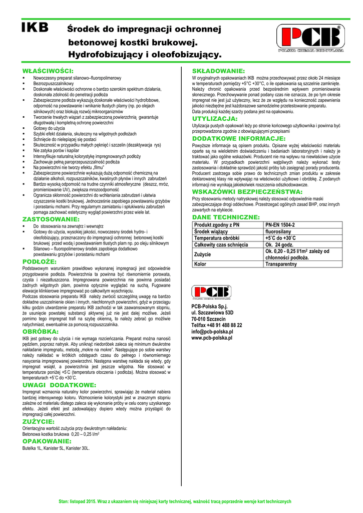 IKB Środek do impregnacji ochronnej betonowej kostki brukowej. Hydrofobizujący i oleofobizujący. WŁAŚCIWOŚCI: Nowoczesny preparat silanowo–fluoropolimerowy Bezrozpuszczalnikowy Doskonałe właściwości ochronne o bardzo szerokim spektrum działania, doskonała zdolność do penetracji podłoża Zabezpieczone podłoża wykazują doskonałe właściwości hydrofobowe, odporność na powstawanie i wnikanie tłustych plamy (np. po olejach silnikowych) oraz blokują rozwój mikroorganizmów Tworzenie trwałych wiązań z zabezpieczoną powierzchnią gwarantuje długotrwałą i kompletną ochronę powierzchni Gotowy do użycia Szybki efekt działania, skuteczny na wilgotnych podłożach Schnięcie do nielepiącej się postaci Skuteczność w przypadku małych pęknięć i szczelin (dezaktywacja rys) Nie zatyka porów i kapilar Intensyfikuje naturalną kolorystykę impregnowanych podłoży Zachowuje pełną paroprzepuszczalność podłoża Na powierzchni nie tworzy efektu „filmu” Zabezpieczone powierzchnie wykazują dużą odporność chemiczną na działanie alkoholi, rozpuszczalników, kwaśnych płynów i innych zabrudzeń Bardzo wysoką odporność na trudne czynniki atmosferyczne (deszcz, mróz, promieniowanie UV), zwiększa mrozoodporność Ogranicza skłonność powierzchni do wchłaniania zabrudzeń i ułatwia czyszczenie kostki brukowej. Jednocześnie zapobiega powstawaniu grzybów i porastaniu mchami. Przy regularnym zamiataniu i spłukiwaniu zabrudzeń pomaga zachować estetyczny wygląd powierzchni przez wiele lat. ZASTOSOWANIE: Do stosowania na zewnątrz i wewnątrz Gotowy do użycia, wysokiej jakości, nowoczesny środek hydro- i oleofobizujący, przeznaczony do impregnacji ochronnej betonowej kostki brukowej przed wodą i powstawaniem tłustych plam np. po oleju silnikowym Silanowo – fluoropolimerowy środek zapobiega dodatkowo powstawaniu grzybów i porastaniu mchami PODŁOŻE: Podstawowym warunkiem prawidłowo wykonanej impregnacji jest odpowiednie przygotowanie podłoża. Powierzchnia ta powinna być równomiernie porowata, czysta i niezatłuszczona. Impregnowana powierzchnia nie powinna posiadać żadnych wilgotnych plam, powinna optycznie wyglądać na suchą. Fugowane elewacje klinkierowe impregnować po całkowitym wyschnięciu. Podczas stosowania preparatu IKB należy zwrócić szczególną uwagę na bardzo dokładne uszczelnienie okien i innych, niechłonnych powierzchni, gdyż w przeciągu kilku godzin utwardzenie preparatu IKB zachodzi w tak zaawansowanym stopniu, że usunięcie powstałej substancji aktywnej już nie jest dalej możliwe. Jeżeli pomimo tego impregnat trafi na szybę okienną, to należy zebrać go możliwie natychmiast, ewentualnie za pomocą rozpuszczalnika. OBRÓBKA: IKB jest gotowy do użycia i nie wymaga rozcieńczania. Preparat można nanosić pędzlem, poprzez natrysk. Aby uniknąć niedoróbek zaleca się minimum dwukrotne nakładanie impregnatu, metodą „mokre na mokre”. Następujące po sobie warstwy należy nakładać w krótkich odstępach czasu do pełnego i równomiernego nasycenia impregnowanej powierzchni. Następna warstwę nakłada się wtedy, gdy impregnat wsiąkł, a powierzchnia jest jeszcze wilgotna. Nie stosować w temperaturze poniżej +5˚C (temperatura otoczenia i podłoża). Można stosować w temperaturach +5˚C do +30˚C. SKŁADOWANIE: W oryginalnych opakowaniach IKB można przechowywać przez około 24 miesiące w temperaturach pomiędzy +5°C +30°C, o ile opakowania są szczelnie zamknięte. Należy chronić opakowania przed bezpośrednim wpływem promieniowania słonecznego. Przechowywanie ponad podany czas nie oznacza, że po tym okresie impregnat nie jest już użyteczny, lecz że ze względu na konieczność zapewnienia jakości niezbędne jest każdorazowe samodzielne przetestowanie preparatu. Data produkcji każdej szarży podana jest na opakowaniu. UTYLIZACJA: Utylizacja pustych opakowań leży po stronie końcowego użytkownika i powinna być przeprowadzona zgodnie z obowiązującymi przepisami DODATKOWE INFORMACJE: Powyższe informacje są opisem produktu. Opisane wyżej właściwości materiału oparte są na wieloletnim doświadczeniu i badaniach laboratoryjnych i należy je traktować jako ogólne wskazówki. Producent nie ma wpływu na niewłaściwe użycie materiału. W przypadkach powierzchni wątpliwych należy wykonać testy zastosowania i dokładnie sprawdzić jakość próby lub zasięgnąć porady producenta. Producent zastrzega sobie prawo do technicznych zmian produktu w zakresie deklarowanej klasy nie wpływając na właściwości użytkowe i obróbkę. Z podanych informacji nie wynikają jakiekolwiek roszczenia odszkodowawcze. WSKAZÓWKI BEZPIECZEŃSTWA: Przy stosowaniu metody natryskowej należy stosować odpowiednie maski zabezpieczające drogi oddechowe. Przestrzegać ogólnych zasad BHP, oraz innych zawartych na etykiecie. DANE TECHNICZNE: Produkt zgodny z PN Środek wiążący Temperatura obróbki Całkowity czas schnięcia Zużycie Kolor PN-EN 1504-2 fluorosilany +5˚C do +30˚C Ok. 24 godz. Ok. 0,20 - 0,25 l/1m2 zależy od chłonności podłoża. Transparentny PCB-Polska Sp.j. ul. Szczawiowa 53D 70-010 Szczecin Tel/fax +48 91 488 88 22 [email protected] www.pcb-polska.pl UWAGI DODATKOWE: Impregnat wzmacnia naturalny kolor powierzchni, sprawiając że materiał nabiera bardziej intensywnego koloru. Wzmocnienie kolorystyki jest w znacznym stopniu zależne od materiału dlatego zaleca się wykonanie próby w celu oceny uzyskanego efektu. Jeżeli efekt jest zadowalający dopiero wtedy można przystąpić do impregnacji całej powierzchni. ZUŻYCIE: Orientacyjna wartość zużycia przy dwukrotnym nakładaniu: Betonowa kostka brukowa 0,20 – 0,25 l/m2 OPAKOWANIE: Butelka 1L, Kanister 5L, Kanister 30L. Stan: listopad 2015. Wraz z ukazaniem się niniejszej karty technicznej, ważność tracą poprzednie wersje kart technicznych