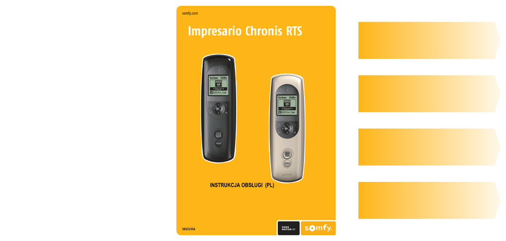 somfy.com Impresario Chronis RTS ,16758.&-$2%6á8*,3/ 5015235A SPIS TREŚCI PREZENTACJA OGÓLNA .............................2 Charakterystyka ogólna ...........................2 Prezentacja ................................................... 2 SZYBKI START - PRZEWODNIK ..................3 Wprowadzenie ...........................................3 Scenariusze dla Twego domu....................... 3 Definicje .....................................................3 Przykłady ...................................................... 3 Programowanie dzienne (typowe dni) ........... 4 Programowanie tygodniowe (typowe tygodnie) ...................................................................... 4 Tryby pracy ................................................5 Tryb pracy ręcznej (poza stacją naścienną).. 5 Uruchamianie scenariusza............................ 5 Tryb pracy automatycznej (w stacji naściennej).................................................... 5 Nawigacja po poszczególnych menu ............ 6 PROGRAMOWANIE .......................................7 Uruchamianie i konfigurowanie...............7 Warunki wstępne przed uruchomieniem ....... 7 Korzystanie z ekranu wprowadzania danych 7 Zmiana nazwy silnika .................................... 8 PROGRAMOWANIE SCENARIUSZY ............9 Tabela 1: tworzenie scenariuszy................... 9 Tworzenie własnych scenariuszy..........10 Tworzenie scenariusza ............................... 10 Zmiana / kopiowanie / Zmiana nazwy / Kasowanie scenariusza .............................. 11 Zmiana istniejącego scenariusza ................ 11 Kopiowanie istniejącego scenariusza ......... 11 Zmiana nazwy istniejącego scenariusza ..... 11 Kasowanie istniejącego scenariusza .......... 11 PROGRAMOWANIE ZEGARA.....................12 Programowanie dzienne (typowe dni) ......... 12 Programowanie tygodniowe (typowe tygodnie) .................................................................... 12 Programowanie dni i tygodni.................13 Tabela 2: programowanie zegara ............... 13 Programowanie dni.................................14 Tworzenie dnia............................................ 14 Przeglądanie programu dnia ....................... 16 Modyfikacja / Kopiowanie / Zmiana nazwy / Kasowanie dnia ...........................................16 Modyfikacja istniejącego dnia ......................16 Kopiowanie istniejącego dnia.......................16 Zmiana nazwy istniejącego dnia ..................16 Kasowanie istniejącego dnia........................16 Programowanie tygodni .........................17 Tworzenie tygodnia......................................17 Modyfikacja / Kopiowanie / Zmiana nazwy / Kasowanie tygodnia.....................................18 Modyfikacja istniejącego tygodnia ...............18 Kopiowanie istniejącego tygodnia................18 Zmiana nazwy istniejącego tygodnia ...........18 Kasowanie istniejącego tygodnia.................18 DOSTĘPNA PAMIĘĆ....................................18 PROGRAMOWANIE CZUJNIKÓW SŁONECZNYCH ...........................................19 Ręczne operowanie czujnikami ...................19 Automatyczne działanie czujników ..............19 USTAWIENIA................................................20 Język............................................................20 Data i czas ...................................................20 Czas letni/zimowy ........................................20 Symulacja obecności ...................................20 Zmierzch ......................................................20 Ekran ...........................................................20 Reset ...........................................................20 Twój kontakt.................................................20 INSTALOWANIE...........................................21 Uruchamianie i konfigurowanie.............21 Warunki wstępne przed uruchomieniem ......21 Pierwsze uruchomienie................................21 Kojarzenie silników i nadawanie im nazw ..................................................................22 Dodawanie silnika ........................................22 Kasowanie silnika ........................................23 Ramki sygnału radiowego............................24 Tryb TILT .....................................................24 Montaż stacji naściennej ........................25 SKOROWIDZ ................................................26 NOTATKI.......................................................27 1 PREZENTACJA OGÓLNA Charakterystyka ogólna Prezentacja IMPRESARIO CHRONIS RTS jest systemem zdalnego sterowania, który umożliwia Ci sterowanie nawet 20-ma urządzeniami kompatybilnymi z technologią radiową Somfy (RTS). Impresario Chronis RTS może sterować następującymi typami urządzeń: • • • • rolety zwijane zasłony (rolety albo zasłony tarasowe) żaluzje o listewkach nastawnych oświetlenie (punkty świetlne) (wyposażone w odpowiedni odbiornik radiowy) Dane techniczne WYMIARY TEMPERATURA PRACY 0 – 60°C STOPIEŃ OCHRONY ZASIĘG RADIOWY Użytkowanie w pomieszczeniach 20 m przez dwie betonowe ściany Wkładanie / wymiana baterii Otwórz pokrywę komory baterii. Operacja nie wymaga używania narzędzi. Włóż trzy zupełnie nowe alkaliczne baterie typu AAA (LR03) tego samego producenta i o tym samym terminie ważności. Pamiętaj o wkładaniu baterii w sposób zaznaczony na pilocie zdalnego sterowania (zgodność biegunów). Nigdy nie używaj akumulatorów. Wyczerpanie się baterii sygnalizuje symbol ( ) na wyświetlaczu. Podczas wymiany baterii, aktualna data i czas zostają zachowane przez dwie minuty. Wszystkie zaprogramowane ustawienia pozostają zachowane w pamięci przez czas nieograniczony. Jeżeli pilot zdalnego sterowania ma pozostać nieużywany przez dłuższy czas, zalecamy wyjęcie baterii. Zużyte baterie należy utylizować zgodnie z przepisami – nigdy nie wyrzucać do zwykłych śmieci. 2 SZYBKI ST