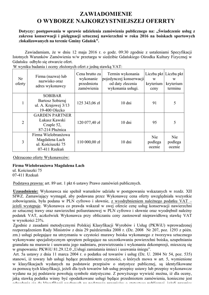 ZAWIADOMIENIE O WYBORZE NAJKORZYSTNIEJSZEJ OFERRTY Dotyczy: postępowania w sprawie udzielenia zamówienia publicznego na: „Świadczenie usług z zakresu konserwacji i pielęgnacji sztucznej nawierzchni w roku 2016 na boiskach sportowych zlokalizowanych na terenie Gminy Gdańsk”. Zawiadamiam, że w dniu 12 maja 2016 r. o godz. 09:30 zgodnie z ustaleniami Specyfikacji Istotnych Warunków Zamówienia w/w przetargu w siedzibie Gdańskiego Ośrodka Kultury Fizycznej w Gdańsku odbyło się otwarcie ofert. W wyniku badania i oceny złożonych ofert z jedną stawką VAT: Nr oferty 1 2 3 Firma (nazwa) lub nazwisko oraz adres wykonawcy SOBIBAR Bartosz Sobieraj ul. A. Krajowej 3/13 19-400 Olecko GARDEN PARTNER Łukasz Kawski Czaple 52, 87-214 Płużnica Firma Wielobranżowa Magdalena Łach ul. Kościuszki 75 07-411 Rzekuń Cena brutto za Termin wykonania Liczba pkt Liczba pkt wykonanie pojedynczej konserwacji w w przedmiotu od daty zlecenia kryterium kryterium zamówienia wykonania usługi. ceny terminu 125 343,06 zł 10 dni 91 5 120 077,40 zł 10 dni 95 5 10 dni Nie podlega ocenie Nie podlega ocenie 110 000,00 zł Odrzucono oferty Wykonawców: Firma Wielobranżowa Magdalena Łach ul. Kościuszki 75 07-411 Rzekuń Podstawa prawna: art. 89 ust. 1 pkt 6 ustawy Prawo zamówień publicznych. Uzasadnienie: Wykonawca nie spełnił warunków udziału w postępowaniu wskazanych w rozdz. XII SIWZ. Zamawiający wymagał, aby podawana przez Wykonawcę cena oferty uwzględniała wszystkie zobowiązania, była podana w PLN cyfrowo i słownie, z wyodrębnieniem należnego podatku VAT – jeżeli występuje. Wykonawca co prawda wskazał w swej ofercie cenę usług konserwacji nawierzchni ze sztucznej trawy oraz nawierzchni poliuretanowej w PLN cyfrowo i słownie oraz wyodrębnił należny podatek VAT, aczkolwiek Wykonawca przy obliczaniu ceny zastosował nieprawidłową stawkę VAT w wysokości 23%. Zgodnie z zasadami metodycznymi Polskiej Klasyfikacji Wyrobów i Usług (PKWiU) wprowadzonej rozporządzeniem Rady Ministrów z dnia 29 października 2008 r. (Dz. 2008 Nr 207, poz. 1293 z późn. zm.) usługi polegające na utrzymaniu w czystości murawy boiska wykonanego z tworzywa sztucznego wykonywane specjalistycznym sprzętem polegające na szczotkowaniu powierzchni boiska, uzupełnianiu granulatu na murawie i usuwaniu jego nadmiaru, przewietrzaniu i wykonaniu dekompresji, mieszczą się w grupowaniu: PKWiU 81.29.12.0 „Usługi zamiatania śmieci i usuwania śniegu”. Art. 5a ustawy z dnia 11 marca 2004 r. o podatku od towarów i usług (Dz. U. 2004 Nr 54, poz. 535) stanowi, iż towary lub usługi będące przedmiotem czynności, o których mowa w art. 5, wymienione w klasyfikacjach wydanych na podstawie przepisów o statystyce publicznej, są identyfikowane za pomocą tych klasyfikacji, jeżeli dla tych towarów lub usług przepisy ustawy lub przepisy wykonawcze wydane na jej podstawie powołują symbole statystyczne. Z powyższego wywieść można, iż dla oceny, jaką stawką podatku winny być opodatkowane usługi będące przedmiotem zamówienia, konieczne jest odwołanie się do klasyfikacji wydanych na podstawie przepisów o statystyce publicznej, jeżeli przepisy ustawy o VAT lub przepisy wykonawcze do tej ustawy powołują symbole statystyczne. Z załącznika Nr 3, poz. 174 do ustawy o podatku od towarów i usług wynika, iż usługi mieszczące się w grupowaniu PKWiU 81.29.12.0 są opodatkowane stawką podatku w wysokości 8% (przy uwzględnieniu zmian wymienionych w art. 146a pkt 2 ustawy o podatku od towarów i usług). W związku z powyższym skonstatować należy, iż Wykonawca stosując nieprawidłową stawkę VAT w wysokości 23%, a w konsekwencji podając niewłaściwą cenę brutto za świadczenie usług będących przedmiotem zamówienia błędnie obliczył cenę, co stanowi przyczynę bezwzględnego odrzucenia oferty Wykonawcy na mocy art. 89 ust. 1 pkt 6 ustawy Prawo zamówień publicznych. Obowiązek odrzucenia oferty w razie niezastosowania przez Wykonawcę właściwej stawki VAT został potwierdzony w orzecznictwie Sądu Najwyższego, wyrok z dnia 20 października 2011 r. sygn. akt III CZP 52/11 i III CZP 53/11. Zastrzec przy tym należy, iż niezastosowanie przez Wykonawcę właściwej stawki VAT nie podlega poprawieniu w trybie art. 87 ust. 2 pkt 2 lub 3 ustawy Prawo zamówień publicznych, co stwierdziła Krajowa Izba Odwoławcza przy Prezesie Urzędu Zamówień Publicznych w wyroku z dnia 01 kwietnia 2010 r. (KIO/UZP 329/10). Nie można bowiem zakwalifikować niezastosowania właściwej stawki VAT jako oczywistej omyłki, której poprawienie nie będzie prowadziło do istotnej zmiany w treści oferty. Nadto, nawiązując do wyroku Krajowej Izby Odwoławczej przy Prezesie Urzędu Zamówień Publicznych z dnia 18 marca 2010 r. (KIO/UZP 233/10) skonstatować należy, iż nie jest możliwa zmiana błędnej stawki VAT w drodze wyjaśnień w trybie art. 26 ust. 4 ustawy Prawo zamówień publicznych. W wyroku tym uznano, iż: „instytucja składania wyjaśnień w trybie art. 26 ust. 4 p.z.p. nie może prowadzić do obejścia prawa, co oznacza, że nie jest dopuszczalne udzielenie wyjaśnień, które w konsekwencji prowadziłyby do zmiany treści oferty w takim zakresie, że nie mieściłby się w kategorii omyłek nie powodujących istotnych zmian w treści oferty.” Nie ulega wątpliwości, iż modyfikacja stawki podatku od towarów i usług z 23% do 8% w drodze wyjaśnień doprowadziłaby do istotnych zmian w treści oferty, wobec czego zastosowanie wyjaśnień w przedmiotowej sprawie jest niedopuszczalne. W związku z powyższymi okolicznościami, Zamawiający był zobligowany do odrzucenia oferty Wykonawcy. Informacja o wyborze wykonawcy. Zamawiający – Gdański Ośrodek Kultury Fizycznej w Gdańsku działając na podstawie art. 92 ust. 1 pkt 1 ustawy z dnia 29 stycznia 2004r. prawo zamówień publicznych informuje, że została wybrana jako najkorzystniejsza oferta złożona