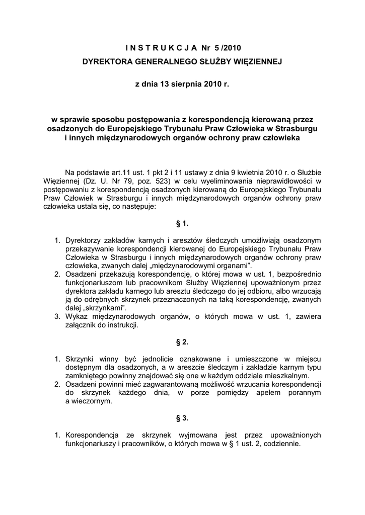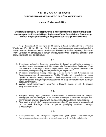 I N S T R U K C J A Nr 5 /2010 DYREKTORA GENERALNEGO SŁUŻBY WIĘZIENNEJ z dnia 13 sierpnia 2010 r. w sprawie sposobu postępowania z korespondencją kierowaną przez osadzonych do Europejskiego Trybunału Praw Człowieka w Strasburgu i innych międzynarodowych organów ochrony praw człowieka Na podstawie art.11 ust. 1 pkt 2 i 11 ustawy z dnia 9 kwietnia 2010 r. o Służbie Więziennej (Dz. U. Nr 79, poz. 523) w celu wyeliminowania nieprawidłowości w postępowaniu z korespondencją osadzonych kierowaną do Europejskiego Trybunału Praw Człowiek w Strasburgu i innych międzynarodowych organów ochrony praw człowieka ustala się, co następuje: § 1. 1. Dyrektorzy zakładów karnych i aresztów śledczych umożliwiają osadzonym przekazywanie korespondencji kierowanej do Europejskiego Trybunału Praw Człowieka w Strasburgu i innych międzynarodowych organów ochrony praw człowieka, zwanych dalej „międzynarodowymi organami”. 2. Osadzeni przekazują korespondencję, o której mowa w ust. 1, bezpośrednio funkcjonariuszom lub pracownikom Służby Więziennej upoważnionym przez dyrektora zakładu karnego lub aresztu śledczego do jej odbioru, albo wrzucają ją do odrębnych skrzynek przeznaczonych na taką korespondencję, zwanych dalej „skrzynkami”. 3. Wykaz międzynarodowych organów, o których mowa w ust. 1, zawiera załącznik do instrukcji. § 2. 1. Skrzynki winny być jednolicie oznakowane i umieszczone w miejscu dostępnym dla osadzonych, a w areszcie śledczym i zakładzie karnym typu zamkniętego powinny znajdować się one w każdym oddziale mieszkalnym. 2. Osadzeni powinni mieć zagwarantowaną możliwość wrzucania korespondencji do skrzynek każdego dnia, w porze pomiędzy apelem porannym a wieczornym. § 3. 1. Korespondencja ze skrzynek wyjmowana jest przez upoważnionych funkcjonariuszy i pracowników, o których mowa w § 1 ust. 2, codziennie. 2. Na kopercie jako datę odbioru korespondencji, o której mowa w art. 105 § 7 ustawy z dnia 6 czerwca 1997 r. - Kodeks karny wykonawczy (Dz. U. Nr 90, poz. 557, z późn.zm.1)), odnotowuje się datę wyjęcia jej ze skrzynki. 3. Funkcjonariusze i pracownicy, o których mowa w ust. 1, niezwłocznie sporządzają i wydają osadzonym pisemne potwierdzenia odbioru tej korespondencji. § 4. 1. Korespondencja skazanych i ukaranych adresowana do międzynarodowych organów nie podlega cenzurze, a nadzór nad korespondencją wykonuje się w sposób określony w art. 8 § 3 Kodeksu karnego wykonawczego. Korespondencję tę po zaewidencjonowaniu w dzienniku korespondencyjnym przesyła się bezpośrednio do adresata. 2. Korespondencję tymczasowo aresztowanych adresowaną do międzynarodowych organów po zaewidencjonowaniu w dzienniku korespondencyjnym przekazuje się adresatowi za pośrednictwem organów, do których dyspozycji tymczasowo aresztowani pozostają, odrębnie od korespondencji przesyłanej do cenzury. Korespondencję tę administracja jednostki penitencjarnej przekazuje w zaklejonych kopertach, na których umieszcza się napis “korespondencja niepodlegająca cenzurze”. 3. W przypadku stwierdzenia, że w skrzynkach znajduje się korespondencja adresowana do innych podmiotów, niż międzynarodowe organy, stosuje się odpowiednio tryb postępowania określony w § 3 ust. 2 i 3. § 5. Instrukcja wchodzi w życie z dniem 13 sierpnia 2010 r. 1 ) Zmiany wymienionej ustawy zostały ogłoszone w Dz. U. z 1997 r. Nr 160, poz. 1083, z 1999 r. Nr 83, poz. 931, z 2000 r. Nr 60, poz. 701 i Nr 120, poz. 1268, z 2001 r. Nr 98, poz. 1071 i Nr 111, poz. 1194, z 2002 r. Nr 74, poz. 676 i Nr 200, poz. 1679, z 2003 r. Nr 111, poz. 1061, Nr 142, poz. 1380 i Nr 179, poz. 1750, z 2004 r. Nr 93, poz. 889, Nr 210, poz. 2135, Nr 240, poz. 2405, Nr 243, poz. 2426 i Nr 273, poz. 2703, z 2005 r. Nr 163, poz. 1363 i Nr 178, poz. 1479, z 2006 r. Nr 104, poz. 708 i Nr 226, poz. 1648, z 2007 r. Nr 123, poz. 849, z 2008 r. Nr 96, poz. 620 i Nr 214, poz. 1344 oraz z 2009 r. Nr 8, poz. 39, Nr 22, poz. 119, Nr 62, poz. 504, Nr 98, poz. 817, Nr 108, poz. 911, Nr 115, poz. 963, Nr 190, poz. 1475 i Nr 201, poz. 1540. Załącznik do instrukcji nr 5 /2010 Dyrektora Generalnego Służby Więziennej z dnia 13 sierpnia 2010 r. Wykaz międzynarodowych organów ochrony praw człowieka I. Organy działające w ramach systemu Organizacji Narodów Zjednoczonych 1. Komitet Praw Człowieka 2. Komitet przeciwko Torturom 3. Komitet do spraw Likwidacji Dyskryminacji Rasowej 4. Komitet do spraw Likwidacji Dyskryminacji Kobiet II. Instytucje i organy działające w ramach Rady Europy Europejski Trybunał Praw Człowieka III. Organy działające w Ramach Unii Europejskiej Europejski Rzecznik Praw Obywatelskich UZASADNIENIE Instrukcja wydana zostaje na podstawie art. 11 ust. 1 pkt. 2 i 11 ustawy z dnia 9 kwietnia 2010 roku o Służbie Więziennej (Dz. U. Nr 79, poz. 523), zgodnie z którymi Dyrektor Generalny Służby Więziennej tworzy warunki do prawidłowego i praworządnego wykonywania kar pozbawienia wolności i tymczasowego aresztowania oraz ustala metody i formy wykonywania zadań służbowych przez funkcjonariuszy Służby Więziennej. Opracowanie instrukcji Dyrektora Generalnego Służby Więziennej w sprawie sposobu postępowania z korespondencją do Europejskiego Trybunału Praw Człowieka w Strasburgu i innych międzynarodowych organów ochrony praw człowieka związane jest z wejściem w życie ustawy o Służbie Więziennej, wobec czego wynikła oczywista potrzeba dostosowania obowiązującego przepisu. Projektowana regulacja stanowi w zasadzie powtórzenie obowiązujących przepisów, zawartych w instrukcji nr 4/2007 Dyrektora Generalnego Służby Więziennej z dnia 16 listopada 2009 roku w sprawie sposobu postępowania z korespondencją kierowaną przez osadzonych do Europejskiego Trybunału Praw Człowieka w Strasburgu i innych międzynarodowych organów ochrony praw człowieka. Zawiera jednak, jedną nową regulację zapisaną w § 3 przedmiotowej i