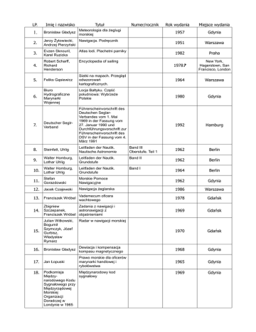 LP. Imię i nazwisko Tytuł 1. Bronisław Gładysz Meteorologia dla żeglugi morskiej 2. Numer/rocznik Rok wydania Miejsce wydania 1957 Gdynia Jerzy Żytowiecki, Nawigacja. Podręcznik Andrzej Pierzyński 1951 Warszawa 3. Evzen Sknouril, Karel Ruzicka Atlas lodi. Plachetni parniky 1982 Praha 4. Robert Scharff, Richard Henderson Encyclopedia of sailing 1978? New York, Hagerstown, San Francisco, London 5. Feliks Gąsiewicz 1964 Warszawa 6. Biuro Hydrograficzne Marynarki Wojennej 1980 Gdynia 1992 Hamburg Siatki na mapach. Przegląd odwzorowań kartograficznych. Locja Bałtyku. Część południowa: Wybrzeże Polskie 7. Deutscher SeglrVerband Führerscheinvorschrift des Deutschen SeglarVerbandes vom 1. Mai 1969 in der Fassung vom 27. Januar 1990 und Durchführungsvorschrift zur Führerscheinvorschrift des DSV in der Fassung vom 4. März 1991 8. Steinfatt, Uhlig Leitfaden der Nautik. Nautische Astronomie Band III Oberstufe. Teil 1 1962 Berlin 9. Walter Homburg, Lothar Uhlig Leitfaden der Nautik. Grundstufe Band II 1962 Berlin 10. Walter Homburg, Lothar Uhlig Leitfaden der Nautik. Grundstufe Band I 1964 Berlin 11. Stefan Gorazdowski Morskie Pomoce Nawigacyjne 1962 Gdynia 12. Jacek Czajewski Nawigacja żeglarska 1986 Warszawa 13. Franciszek Wróbel Vademecum oficera wachtowego 1978 Gdańsk 14. Zbigniew Zadania z nawigacji i Szczepanek, astronawigacji z Franciszek Wróbel objaśnieniami 1969 Gdańsk 15. Julian Witkowski, Bogumił Szymczyk, Józef Gurbisz, Władysław Rymarz 1970 Gdańsk 16. Bronisław Gładysz Dewiacja i kompensacja kompasu magnetycznego 1968 Gdynia 17. Jan Łopuski Prawo morskie dla oficerów marynarki handlowej i rybołówstwa 1965 Gdynia 18. Podkomisja Międzynarodowy kod Międzysygnałowy narodowego Kodu Sygnałowego przy Międzyrządowej Morskiej Organizacji Doradczej w Londynie w 1965 1969 Gdynia Radar w nawigacji morskiej roku 19. Z. Koszewski, S. Gorazdowski Międzynarodowe prawo drogi morskiej Tablice nawigacyjne TN-58 20. Biuro Hydrograficzne Marynarki Wojennej 21. Biuro Hydrograficzne Marynarki Wojennej Dodatek do tablic nawigacyjnych (tn-53) 22. Biuro Hydrograficzne Marynarki Wojennej Dodatek do tablic nawigacyjnych (tn-53) 23. Antoni Ledóchowski Astronawigacja 1966 Gdynia Brown's Nautical Almanac 1960 Glasgow 1959 Leipzig 1981 Gdańsk 24. 25. Walter Homburg, Gerhard Rose, Walter Steinfatt, Adolf Zinn Nautische Aufgabensammlung 26. Aleksander Kaszowski, Zbigniew Urbanyi Polskie jachty na oceanach 1965 Gdynia 1958 Gdynia 1953 1953