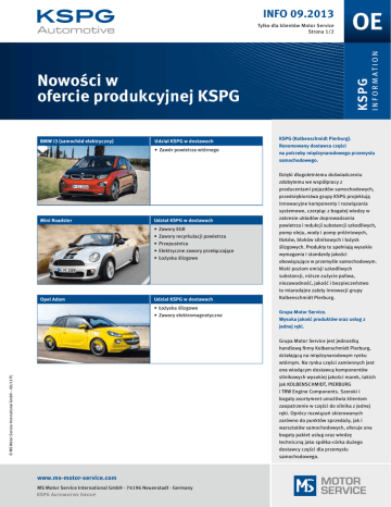 INFO 09.2013 BMW i3 (samochód elektryczny) Udział KSPG w dostawach • Zawór powietrza wtórnego Mini Roadster Udział KSPG w dostawach • Zawory EGR • Zawory recyrkulacji powietrza • Przepustnica • Elektryczne zawory przełączające • Łożyska ślizgowe Opel Adam Udział KSPG w dostawach • Łożyska ślizgowe • Zawory elektromagnetyczne kspg Nowości w ofercie produkcyjnej KSPG I n f o r m at i o n Tylko dla klientów Motor Service Strona 1/2 KSPG (Kolbenschmidt Pierburg). Renomowany dostawca części na potrzeby międzynarodowego przemysłu samochodowego. Dzięki długoletniemu doświadczeniu zdobytemu we współpracy z producentami pojazdów samochodowych, przedsiębiorstwa grupy KSPG projektują innowacyjne komponenty i rozwiązania systemowe, czerpiąc z bogatej wiedzy w zakresie układów doprowadzania powietrza i redukcji substancji szkodliwych, pomp oleju, wody i pomp próżniowych, tłoków, bloków silnikowych i łożysk ślizgowych. Produkty te spełniają wysokie wymagania i standardy jakości obowiązujące w przemyśle samochodowym. Niski poziom emisji szkodliwych substancji, niższe zużycie paliwa, niezawodność, jakość i bezpieczeństwo to miarodajne zalety innowacji grupy Kolbenschmidt Pierburg. Grupa Motor Service. Wysoka jakość produktów oraz usług z jednej ręki. © MS Motor Service International GmbH – 09/13 PL Grupa Motor Service jest jednostką handlową firmy Kolbenschmidt Pierburg, działającą na międzynarodowym rynku wtórnym. Na rynku części zamiennych jest ona wiodącym dostawcą komponentów silnikowych wysokiej jakości marek, takich jak KOLBENSCHMIDT, PIERBURG i TRW Engine Components. Szeroki i bogaty asortyment umożliwia klientom zaopatrzenie w części do silnika z jednej ręki. Oprócz rozwiązań skierowanych zarówno do punktów sprzedaży, jak i warsztatów samochodowych, oferuje ona bogaty pakiet usług oraz wiedzę techniczną jako spółka-córka dużego dostawcy części dla przemysłu samochodowego. www.ms-motor-service.com MS Motor Service International GmbH · 74196 Neuenstadt · Germany INFO 09.2013 Tylko dla klientów Motor Service Strona 2/2 KSPG zakłada kolejną spółkę joint venture w Chinach Firma Pierburg Pump Technology GmbH z siedzibą w Neuss (Niemcy), należąca do spółki akcyjnej KSPG AG, założyła wspólnie z firmą Shanghai Xingfu Motorcycle Co., Ltd., należącą do chińskiej spółki Huayu Automotive Systems Co., Ltd. (grupa SAIC), nową spółkę joint venture, która zajmuje się produkcją i dystrybucją pomp dla przemysłu motoryzacyjnego. W nowo utworzonej spółce Pierburg Huayu Pump Technology Co., Ltd. (PHP) z siedzibą w Szanghaju każdy z partnerów ma po 50% udziałów. PHP specjalizuje się w produkcji innowacyjnych pomp na chiński rynek motoryzacyjny. W ofercie spółki znajdują się m.in. pompy olejowe o zmiennej wydajności, elektryczne pompy olejowe do przekładni, przełączane pompy płynu chłodzącego do głównych obiegów chłodzenia oraz elektryczne, obiegowe pompy wody do obiegów wtórnych, stosowane w chłodnicach powietrza doładowującego lub chłodzonych systemach recyrkulacji spalin. Szerokie portfolio spółki wzbogacą wkrótce wydajne pompy próżniowe. Od 1997 roku grupę KSPG reprezentuje w Chinach kilka spółek joint venture oraz 100-procentowe spółki córki. Międzynarodowy dostawca części samochodowych ma obecnie 10 siedzib na obszarze miast Szanghaj i Yantai. Należy do nich również spółka MS Motor Service Asia Pacific odpowiedzialna za części zamienne. © MS Motor Service International GmbH – 09/13 PL Oficjalne podpisanie umowy joint venture w Szanghaju przez dyrektora firmy Huayu Automotive Systems Co., Ltd. pana Zhang Haitao (po prawej) oraz przewodniczącego zarządu spółki Pierburg Pump Technology GmbH, pana Udo Nenning (po lewej). www.ms-motor-service.com MS Motor Service International GmbH · 74196 Neuenstadt · Germany ABY ŚWIAT KOŁEM SIĘ TOCZYŁ!