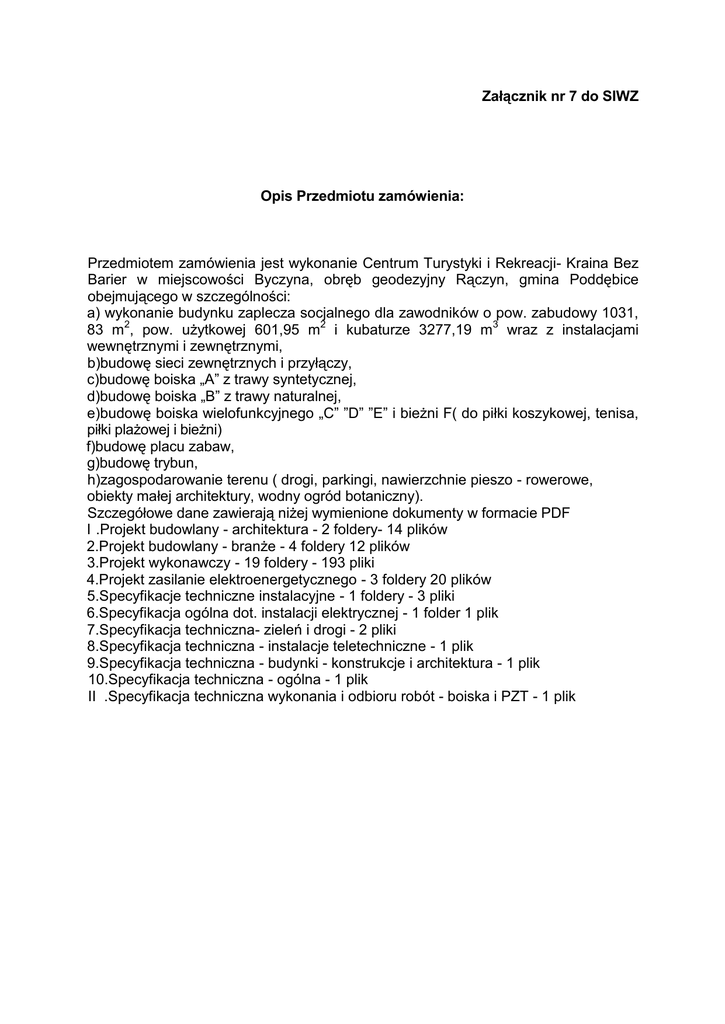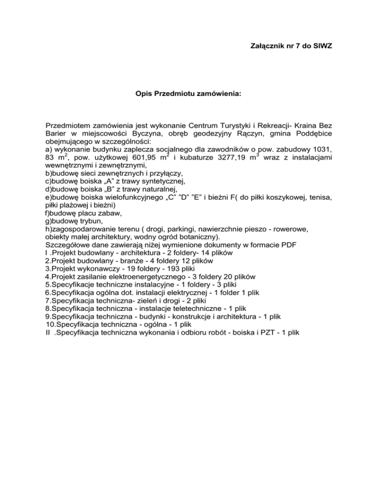 Załącznik nr 7 do SIWZ Opis Przedmiotu zamówienia: Przedmiotem zamówienia jest wykonanie Centrum Turystyki i Rekreacji- Kraina Bez Barier w miejscowości Byczyna, obręb geodezyjny Rączyn, gmina Poddębice obejmującego w szczególności: a) wykonanie budynku zaplecza socjalnego dla zawodników o pow. zabudowy 1031, 83 m2, pow. użytkowej 601,95 m2 i kubaturze 3277,19 m3 wraz z instalacjami wewnętrznymi i zewnętrznymi, b)budowę sieci zewnętrznych i przyłączy, c)budowę boiska „A” z trawy syntetycznej, d)budowę boiska „B” z trawy naturalnej, e)budowę boiska wielofunkcyjnego „C” ”D” ”E” i bieżni F( do piłki koszykowej, tenisa, piłki plażowej i bieżni) f)budowę placu zabaw, g)budowę trybun, h)zagospodarowanie terenu ( drogi, parkingi, nawierzchnie pieszo - rowerowe, obiekty małej architektury, wodny ogród botaniczny). Szczegółowe dane zawierają niżej wymienione dokumenty w formacie PDF I .Projekt budowlany - architektura - 2 foldery- 14 plików 2.Projekt budowlany - branże - 4 foldery 12 plików 3.Projekt wykonawczy - 19 foldery - 193 pliki 4.Projekt zasilanie elektroenergetycznego - 3 foldery 20 plików 5.Specyfikacje techniczne instalacyjne - 1 foldery - 3 pliki 6.Specyfikacja ogólna dot. instalacji elektrycznej - 1 folder 1 plik 7.Specyfikacja techniczna- zieleń i drogi - 2 pliki 8.Specyfikacja techniczna - instalacje teletechniczne - 1 plik 9.Specyfikacja techniczna - budynki - konstrukcje i architektura - 1 plik 10.Specyfikacja techniczna - ogólna - 1 plik II .Specyfikacja techniczna wykonania i odbioru robót - boiska i PZT - 1 plik