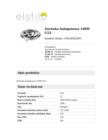 Żarówka halogenowa 100W G53 Symbol elstilo: CHL004LEDV Dostępność: Szacowane koszty dostawy: 20.00 zł - wysyłka kurierem (pobranie) 15.00 zł - wysyłka kurierem 0.00 - odbiór osobisty 32,31 zł z VATem Opis produktu Żarówka halogenowa 100W G53 Dane techniczne Trzonek: G53 Napiecie znamionowe [V]: 12 Barwa światła [K]: 2000-3500 (ciepła) Żywotność [h]: 3000 Typ: Halogen Strumień świetlny zakres [lm]: 751-1000 Strumień świetlny dokładny [lm]: 950 Moc [W]: 100 LED: Nie