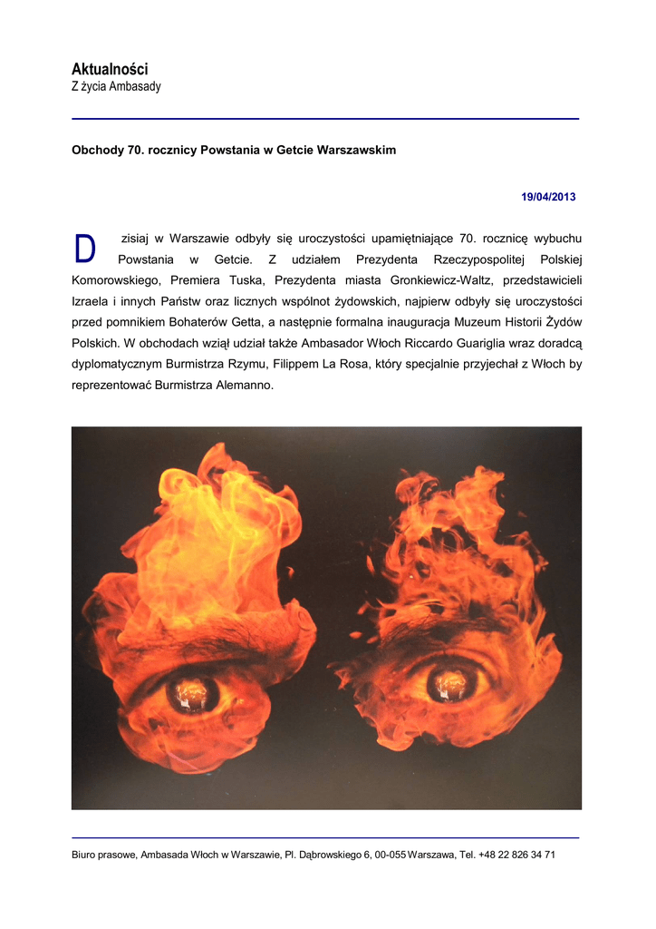 Aktualności Z życia Ambasady Obchody 70. rocznicy Powstania w Getcie Warszawskim 19/04/2013 D zisiaj w Warszawie odbyły się uroczystości upamiętniające 70. rocznicę wybuchu Powstania w Getcie. Z udziałem Prezydenta Rzeczypospolitej Polskiej Komorowskiego, Premiera Tuska, Prezydenta miasta Gronkiewicz-Waltz, przedstawicieli Izraela i innych Państw oraz licznych wspólnot żydowskich, najpierw odbyły się uroczystości przed pomnikiem Bohaterów Getta, a następnie formalna inauguracja Muzeum Historii Żydów Polskich. W obchodach wziął udział także Ambasador Włoch Riccardo Guariglia wraz doradcą dyplomatycznym Burmistrza Rzymu, Filippem La Rosa, który specjalnie przyjechał z Włoch by reprezentować Burmistrza Alemanno. Biuro prasowe, Ambasada Włoch w Warszawie, Pl. Dąbrowskiego 6, 00-055 Warszawa, Tel. +48 22 826 34 71 Ufficio Stampa, Ambasciata d’Italia a Varsavia, Pl. Dąbrowskiego 6, 00-055 Warszawa, Tel. +48 22 826 34 71 Ufficio Stampa, Ambasciata d’Italia a Varsavia, Pl. Dąbrowskiego 6, 00-055 Warszawa, Tel. +48 22 826 34 71