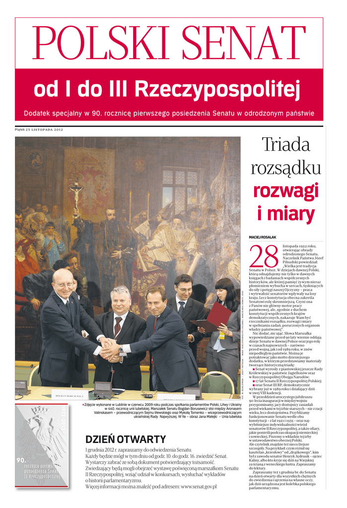 POLSKI SENAT od I do III Rzeczypospolitej Dodatek specjalny w 90. rocznicę pierwszego posiedzenia Senatu w odrodzonym państwie Piątek 23 listopada 2012 Triada rozsądku rozwagi i miary MACIEJ ROSALAK FOT. M. KOZICZYŃSKI / JERZY PIETRZAK – SENAT RZECZYPOSPOLITEJ POLSKIEJ. KANCELARIA SENATU, 2010 28 ≥Zdjęcie wykonane w Lublinie w czerwcu 2009 roku podczas spotkania parlamentów Polski, Litwy i Ukrainy w 440. rocznicę unii lubelskiej. Marszałek Senatu Bogdan Borusewicz stoi między Aronasem Valinskasem – przewodniczącym Sejmu litewskiego oraz Mykołą Tomenko – wiceprzewodniczącym ukraińskiej Rady Najwyższej. W tle – obraz Jana Matejki – Unia lubelska DZIEŃ OTWARTY 1 grudnia 2012 r. zapraszamy do odwiedzenia Senatu. Każdy będzie mógł w tym dniu od godz. 10. do godz. 16. zwiedzić Senat. Wystarczy zabrać ze sobą dokument potwierdzający tożsamość. Zwiedzający będą mogli obejrzeć wystawę poświęconą marszałkom Senatu II Rzeczypospolitej, wziąć udział w konkursach, wysłuchać wykładów o historii parlamentaryzmu. Więcej informacji można znaleźć pod adresem: www.senat.gov.pl listopada 1922 roku, otwierając obrady odrodzonego Senatu, Naczelnik Państwa Józef Piłsudski powiedział: „Wielka jest tradycja Senatu w Polsce. W dziejach dawnej Polski, którą odnajdujemy nie tylko w dawnych księgach i badaniach współczesnych historyków, ale której pamięć żywym nieraz płomieniem wybucha w sercach, tęskniących do siły i potęgi naszej Ojczyzny – praca i wytrwałość senatorów wpływały na losy kraju. Lecz konstytucja obecna zakreśla Senatowi rolę skromniejszą. Czyni ona z Panów nie główny motor pracy państwowej, ale, zgodnie z duchem konstytucji współczesnych krajów demokratycznych, nakazuje Wam być rzecznikami rozsądku, rozwagi i miary w spełnianiu zadań, poruczonych organom władzy państwowej”. Nic dodać, nic ująć. Słowa Marszałka wypowiedziane przed 90 laty wiernie oddają dzieje Senatu w dawnej Polsce oraz jego rolę w czasach najnowszych – zarówno przed wojną, jak i od 1989 roku, w znów niepodległym państwie. Można je potraktować jako motto dziesiejszego dodatku, w którym przedstawiamy materiały tworzące historyczną triadę: ∑ Senat wyrosły z piastowskiej jeszcze Rady Królewskiej w państwie Jagiellonów oraz w Rzeczypospolitej Obojga Narodów; ∑ 17 lat Senatu II Rzeczypospolitej Polskiej; ∑ oraz Senat III RP, demokratycznie wybrany już w 1989 roku i działający dziś w swej VIII kadencji. W przeddzień uroczystego jubileuszu 90-lecia inauguracji w międzywojniu przypominamy, jacy dostojnicy zasiadali przed wiekami w tej izbie starszych – nie z racji wieku, lecz dostojeństwa. Przybliżamy funkcjonowanie Senatu wedle obu konstytucji – z lat 1921 i 1935 – oraz najwybitniejsze indywidualności wśród senatorów II Rzeczypospolitej, a także ofiary, jakie ponieśli podczas okupacji niemieckiej i sowieckiej. Piszemy o wkładzie tej izby w ustawodawstwo obecnej Polski. Ale czytelnik znajdzie też nieco lżejsze szczegóły. Na przykład: czym różnił się kasztelan „krzesłowy” od „drążkowego”, kim był z zawodu senator Henryk Jędrusik – ojciec Kaliny, albo kto kryje się dziś na Wiejskiej za ścianą z weneckiego lustra. Zapraszamy do lektury. Zapraszamy też 1 grudnia br. do Senatu na dzień otwarty dla wszystkich chętnych do zwiedzenia i ujrzenia na własne oczy, jak dziś urządzona jest kolebka polskiego parlamentaryzmu. Piątek POLSKI SENAT 23 listopada 2012 MIROSŁAW SZPAKOWSKI Interesująca wyprawa w dzieje parlamentaryzmu BOGDAN BORUSEWICZ W Królestwie Polskim Starsi radzą królom Nazwa „senat” pojawiła się u nas w XV wieku. Ujęta w prawie państwowym instytucja o tej nazwie działała od następnego stulecia. Ale jej polskiego rodowodu należy szukać u schyłku epoki piastowskiej... MACIEJ ROSALAK marszałek Senatu RP S enat jest jednym z filarów polskiej demokracji. W II Rzeczypospolitej Polskiej, podobnie jak w III, poszukiwano właściwego usytuowania Senatu w nowoczesnej konstytucji. Naczelnik Państwa Józef Piłsudski, otwierając pierwsze posiedzenie Senatu w 1922 r., podkreślił trwałość tradycji Senatu w Polsce. Widział Senat jako instytucję państwową reprezentującą umiar, która „staje zawsze po stronie tych, którzy czy to z urzędu, czy to ze skłonności łagodzą tarcia, zmniejszają konflikty i doprowadzają do koniecznej równowagi zamierzeń, celów i środków". Najważniejszym wówczas zadaniem była odbudowa państwa ze zniszczeń wojennych, scalenie kraju po rozbiorach, stworzenie instytucji państwa i jednolitego systemu prawa. Odrodzony w 1989 r., Senat był pierwszym, demokratycznie wybranym organem władzy państwowej. Uczestniczył w ustrojowej i gospodarczej transformacji państwa. Dzisiejszy Senat dba o jakość stanowionego prawa. Korzysta z inicjatywy ustawodawczej, porządkując nasz system prawny m.in. poprzez dostosowanie prawa do wyroków Trybunału Konstytucyjnego. Aby dać obywatelom dodatkową możliwość wpływania na sprawy publiczne Senat zajął się rozpatrywaniem petycji, zawierających propozycje obywateli, dotyczące zmian w prawie. Senat na początku lat 90. zainicjował budowę społeczeństwa obywatelskiego, przyczyniając się do restytucji samorządu terytorialnego w Polsce, na jego podstawowym, gminnym poziomie. Utworzenie gmin i przeprowadzenie powszechnych wyborów samorządowych wyzwoliło lokalną aktywność ich mieszkańców i zapoczątkowało zmianę świadomości społecznej. Senat ma więc zasługi w budowie polskiej samorządności, która jest istotą demokracji. Tak jak przed wojną Senat objął opieką Polaków żyjących w diasporze. Przez blisko 22 lata kształtował politykę państwa polskiego w tym obszarze. Te działania Senatu na rzecz Polonii i Polaków za granicą stworzyły trwałą więź między krajem a diasporą. Senat uczestniczył aktywnie w procesie do