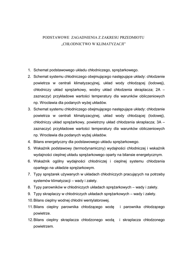 PODSTAWOWE ZAGADNIENIA Z ZAKRESU PRZEDMIOTU „CHŁODNICTWO W KLIMATYZACJI” 1. Schemat podstawowego układu chłodniczego, sprężarkowego. 2. Schemat systemu chłodniczego obejmującego następujące układy: chłodzenie powietrza w centrali klimatyzacyjnej, układ wody chłodzącej (lodowej), chłodniczy układ sprężarkowy, wodny układ chłodzenia skraplacza; 2A – zaznaczyć przykładowe wartości temperatury dla warunków obliczeniowych np. Wrocławia dla podanych wyżej układów. 3. Schemat systemu chłodniczego obejmującego następujące układy: chłodzenie powietrza w centrali klimatyzacyjnej, układ wody chłodzącej (lodowej), chłodniczy układ sprężarkowy, powietrzny układ chłodzenia skraplacza; 3A – zaznaczyć przykładowe wartości temperatury dla warunków obliczeniowych np. Wrocławia dla podanych wyżej układów. 4. Bilans energetyczny dla podstawowego układu sprężarkowego. 5. Wskaźnik podstawowy (termodynamiczny) wydajności chłodniczej i wskaźnik wydajności cieplnej układu sprężarkowego oparty na bilansie energetycznym. 6. Wskaźnik ogólny wydajności chłodniczej i cieplnej systemu chłodzenia opartego na układzie sprężarkowym. 7. Typy sprężarek używanych w układach chłodniczych pracujących na potrzeby systemów klimatyzacji – wady i zalety. 8. Typy parowników w chłodniczych układach sprężarkowych – wady i zalety. 9. Typy skraplaczy w chłodniczych układach sprężarkowych – wady i zalety. 10. Bilans cieplny wodnej chłodni wentylatorowej. 11. Bilans cieplny parownika chłodzącego wodę i parownika chłodzącego powietrze. 12. Bilans cieplny skraplacza chłodzonego wodą powietrzem. i skraplacza chłodzonego 13. Podstawowe objawy złej pracy sprężarkowego układu chłodniczego i pozostałych elementów systemu chłodniczego oraz przyczyny ich powstawania. 14. Wskaźniki środowiskowej oceny czynników chłodniczych. 15. Powody, dla których warto magazynować „chłód” w systemach klimatyzacyjnych. 16. Magazynowanie „chłodu” w zimnej wodzie i magazynowanie w lodzie – wady i zalety. 17. Schematy układów akumulacyjnych w wodzie i lodzie z zaznaczeniem przykładowych temperatur pracy. 18. Sposób postępowania przed podjęciem decyzji co do celowości magazynowania „chłodu” w systemie klimatyzacji. 19. Procedura wymiarowania układu magazynowania „chłodu” w lodzie. 20. Podstawowe schematy układów magazynowania ciepła w lodzie. 21. Schemat podstawowego chłodniczego układu absorpcyjnego, wodno bromolitowego. 22. Bilans masowy dla podstawowego układu absorpcyjnego. 23. Bilans cieplny dla podstawowego układu absorpcyjnego. 24. Wskaźnik wydajności chłodniczej i wskaźnik wydajności cieplnej podstawowego układu absorpcyjnego oparty na bilansie cieplnym. 25. Podstawowe schematy pomp cieplnych do zastosowania w systemach klimatyzacji wraz z przykładowymi średnimi wartościami wskaźników wydajności cieplnej. 26. Wyparne chłodzenie powietrza w kontakcie z wodą w wersji bezpośredniej i pośredniej; sprawność procesu, wskaźnik wydajności chłodniczej układu. 27. Opis zastosowania otwartego układu adsorpcyjnego lub absorpcyjnego na potrzeby chłodzenia w klimatyzacji. 28. Ilustracja przewag stosowania absorbentów w obróbce powietrza, w stosunku do innych sposobów chłodzenia powietrza – ilustracja na wykresie i – x. 29. Przykładowy schemat otwartego układu absorpcyjnego zastosowany w systemie klimatyzacyjnym. 30. Przykładowe adsorpcyjnego rozwiązanie zastosowania w chłodzenia instalacji obrotowego powietrza (przy wymiennika pominięciu konwencjonalnych układów chłodzenia), podstawowe wskaźniki działania. 31. Sezonowe wskaźniki wydajności chłodniczej i cieplnej dla wszystkich dyskutowanych systemów chłodzenia powietrza. 32. Rozważania dotyczące analizy ekonomicznej dla układów chłodniczych (koszty inwestycyjne, eksploatacyjne i koszty modernizacji). Andrzej Bugaj
