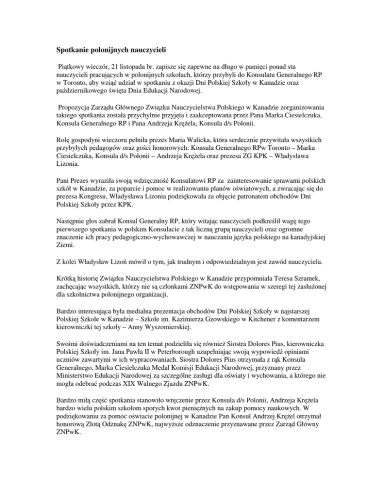 Spotkanie polonijnych nauczycieli Piątkowy wieczór, 21 listopada br. zapisze się zapewne na długo w pamięci ponad stu nauczycieli pracujących w polonijnych szkołach, którzy przybyli do Konsulatu Generalnego RP w Toronto, aby wziąć udział w spotkaniu z okazji Dni Polskiej Szkoły w Kanadzie oraz październikowego święta Dnia Edukacji Narodowej. Propozycja Zarządu Głównego Związku Nauczycielstwa Polskiego w Kanadzie zorganizowania takiego spotkania została przychylnie przyjęta i zaakceptowana przez Pana Marka Ciesielczuka, Konsula Generalnego RP i Pana Andrzeja Krężela, Konsula d/s Polonii. Rolę gospodyni wieczoru pełniła prezes Maria Walicka, która serdecznie przywitała wszystkich przybyłych pedagogów oraz gości honorowych: Konsula Generalnego RPw Toronto – Marka Ciesielczuka, Konsula d/s Polonii – Andrzeja Krężela oraz prezesa ZG KPK – Władysława Lizonia. Pani Prezes wyraziła swoją wdzięczność Konsulatowi RP za zainteresowanie sprawami polskich szkół w Kanadzie, za poparcie i pomoc w realizowaniu planów oświatowych, a zwracając się do prezesa Kongresu, Władysława Lizonia podziękowała za objęcie patronatem obchodów Dni Polskiej Szkoły przez KPK. Następnie głos zabrał Konsul Generalny RP, który witając nauczycieli podkreślił wagę tego pierwszego spotkania w polskim Konsulacie z tak liczną grupą nauczycieli oraz ogromne znaczenie ich pracy pedagogiczno-wychowawczej w nauczaniu języka polskiego na kanadyjskiej Ziemi. Z kolei Władysław Lizoń mówił o tym, jak trudnym i odpowiedzialnym jest zawód nauczyciela. Krótką historię Związku Nauczycielstwa Polskiego w Kanadzie przypomniała Teresa Szramek, zachęcając wszystkich, którzy nie są członkami ZNPwK do wstępowania w szeregi tej zasłużonej dla szkolnictwa polonijnego organizacji. Bardzo interesująca była medialna prezentacja obchodów Dni Polskiej Szkoły w najstarszej Polskiej Szkole w Kanadzie – Szkole im. Kazimierza Gzowskiego w Kitchener z komentarzem kierowniczki tej szkoły – Anny Wyszomierskiej. Swoimi doświadczeniami na ten temat podzieliła się również Siostra Dolores Pius, kierowniczka Polskiej Szkoły im. Jana Pawła II w Peterborough uzupełniając swoją wypowiedź opiniami uczniów zawartymi w ich wypracowaniach. Siostra Dolores Pius otrzymała z rąk Konsula Generalnego, Marka Ciesielczuka Medal Komisji Edukacji Narodowej, przyznany przez Ministerstwo Edukacji Narodowej za szczególne zasługi dla oświaty i wychowania, a którego nie mogła odebrać podczas XIX Walnego Zjazdu ZNPwK. Bardzo miłą część spotkania stanowiło wręczenie przez Konsula d/s Polonii, Andrzeja Krężela bardzo wielu polskim szkołom sporych kwot pieniężnych na zakup pomocy naukowych. W podziękowaniu za pomoc oświacie polonijnej w Kanadzie Pan Konsul Andrzej Krężel otrzymał honorową Złotą Odznakę ZNPwK, najwyższe odznaczenie przyznawane przez Zarząd Główny ZNPwK. W części artystycznej wystąpili uczniowie Szkoły Polskiej im. Marii Konopnickiej w Oakville, której kierowniczką jest Maria Walicka. Był więc pokaz tańca towarzyskiego w wykonaniu dwóch młodziutkich bliźniaczek Nicole i Oliwii Arskich z partnerami, była lekcja historii przeprowadzona przez Bartka Kowala i Anię Rzepkę, były piękne życzenia adresowane do nauczycieli i piękne polskie piosenki: „Cudownych rodziców mam”, „Polskie kwiaty” i „Psalm dla Ciebie” Piotra Rubika w wykonaniu uczniów pod dyrekcją Elżbiety Kliś. Występy młodych artystów bardzo się podobały i nagrodzone zostały zasłużonymi brawami. Ostatnia część wieczoru miała charakter bardzo towarzyski i upłynęła pod znakiem wzajemnego poznawania się, spotkań z dawnymi znajomymi, rozmów na tematy bliskie nauczycielom. W imieniu Zarządu Głównego Związku Nauczycielstwa Polskiego w Kanadzie składam serdeczne podziękowanie Panom Konsulom za umożliwienie zorganizowania tego spotkania w miejscu tak ważnym i bliskim wszystkim Polakom i Kanadyjczykom polskiego pochodzenia. Mamy nadzieję, że Dni Polskiej Szkoły w Kanadzie staną się naszą tradycją wzbogacaną różnymi programami popularyzującymi język polski, bogatą polską historię i kulturę. Teresa Szramek