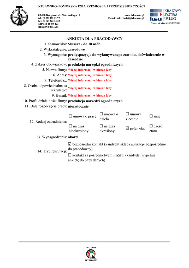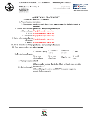 KUJAWSKO–POMORSKA IZBA RZEMIOSŁA I PRZEDSIĘBIORCZOŚCI 85-098 Bydgoszcz ul. Piotrowskiego 11 tel. (0 52) 322 12 77 fax. (0 52) 322 14 23 NIP 554-10-09-423 REGON 000446411 www.izbarzem.pl E-mail: [email protected] ANKIETA DLA PRACODAWCY 1. Stanowisko: Ślusarz - do 10 osób 2. Wykształcenie: zawodowe 3. Wymagania: predyspozycje do wykonywanego zawodu, doświadczenie w zawodzie 4. Zakres obowiązków: produkcja narzędzi ogrodniczych 5. Nazwa firmy: Więcej informacji w biurze Izby 6. Adres: Więcej informacji w biurze Izby 7. Telefon/fax: Więcej informacji w biurze Izby 8. Osoba odpowiedzialna za Więcej informacji w biurze Izby rekrutacje: 9. E-mail: Więcej informacji w biurze Izby 10. Profil działalności firmy: produkcja narzędzi ogrodniczych 11. Data rozpoczęcia pracy: niezwłocznie 12. Rodzaj zatrudnienia: ☐ umowa o ☐ umowa o pracę dzieło zlecenie ☐ na czas nieokreślony część ☑ pełen etat ☐ etatu ☐ na czas określony ☐ umowa ☐ inne 13. Wynagrodzenia: akord ☑ bezpośredni kontakt (kandydat składa aplikacje bezpośrednio 14. Tryb rekrutacji: do pracodawcy) ☐ kontakt za pośrednictwem PIZiPP (kandydat wypełnia ankietę do bazy danych)