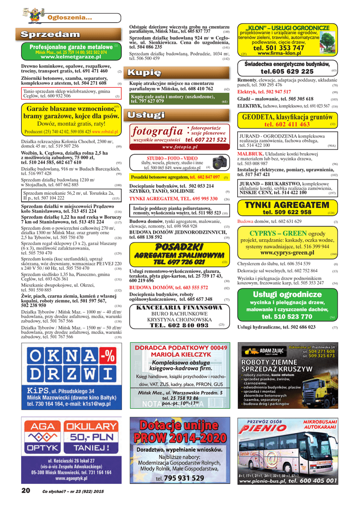 Ogłoszenia... Odstąpię dzierżawę wieczystą grobu na cmentarzu parafialnym, Mińsk Maz., tel. 605 837 737 (140) Sprzedam Profesjonalne garaże metalowe (1) Mińsk Maz., tel. 25 759 14 00; 502 502 074 Sprzedam działkę budowlaną, Podrudzie, 1034 m2, tel. 506 500 459 (142) www.kelmetgaraze.pl Drewno kominkowe, opałowe, rozpałkowe, trociny, transport gratis, tel. 691 471 460 (2) Zbiorniki betonowe, szamba, separatory, kompleksowo z atestem, tel. 504 271 608 (4) Tanio sprzedam sklep wielobranżowy, gmina Cegłów, tel. 600 932 506 Sprzedam działkę budowlaną 924 m2 w Cegłowie, ul. Sienkiewicza. Cena do uzgodnienia, tel. 504 086 235 (141) (3) Garaże blaszane wzmocnione, bramy garażowe, kojce dla psów. Kupię Kupię atrakcyjne miejsce na cmentarzu parafialnym w Mińsku, tel. 608 410 762 (62) Kupię całe auta i motory (uszkodzone), tel. 797 627 079 (61) (43) Dowóz, montaż gratis, raty! Producent (25) 740 42 02, 509 038 425 www.robstal.pl Działka rekreacyjna Kolonia Chochoł, 2300 m2, domek 45 m2, tel. 519 507 256 Usługi fotografia wszystkie uroczystości (89) Woźbin, k. Cegłowa, działka rolna 2,5 ha z możliwością zabudowy, 75 000 zł, (95) tel. 510 244 585, 602 617 610 Działkę budowlaną, 916 m2 w Budach Barcząckich, (99) tel. 516 997 428 Sprzedam działkę budowlaną 1210 m2 (100) w Stojadłach, tel. 607 662 885 Sprzedam mieszkanie 56,2 m2, ul. Toruńska 2a, (115) II p., tel. 507 104 222 Sprzedam działki w miejscowości Prądzewo (116) koło Stanisławowa, tel. 513 451 224 Sprzedam działkę 1,22 ha nad rzeką w Boruczy (117) 7 km od Stanisławowa, tel. 513 451 224 Sprzedam dom o powierzchni całkowitej 270 m2, działka 1300 m2 Mińsk Maz. oraz grunty orne (128) 2,5 ha Tyborów, tel. 505 750 470 Sprzedam regał sklepowy (3 x 2), garaż blaszany (6 x 3), możliwość zafakturowania, (129) tel. 505 750 470 Sprzedam konia (kuc szetlandzki), uprząż skórzaną, wóz drewniany, wzmacniacz PE1VEJ 220 (130) x 240 V 50 / 60 Hz, tel. 505 750 470 Sprzedam siedlisko 1,35 ha, Piaseczno, gmina (131) Cegłów, tel. 693 626 361 Mieszkanie dwupokojowe, ul. Okrzei, (132) tel. 501 550 885 Żwir, piach, czarna ziemia, kamień z własnej kopalni, roboty ziemne, tel. 501 597 567, (136) 502 238 950 Działka Tyborów / Mińsk Maz. – 1000 m2 – 40 zł/m2 budowlana, przy drodze asfaltowej, media, warunki zabudowy, tel. 501 767 566 (138) Działka Tyborów / Mińsk Maz. – 1500 m2 – 50 zł/m2 budowlana, przy drodze asfaltowej, media, warunki zabudowy, tel. 501 767 566 (139) www.firma–klon.pl Świadectwa energetyczne budynków, tel.605 629 225 (63) Remonty, elewacje, adaptacja poddaszy, układanie (78) paneli, tel. 500 295 476 Elektryk, tel. 502 947 517 (99) Gładź – malowanie, tel. 505 305 618 (103) ELEKTRYK, fachowo, kompleksowo, tel. 691 023 567 (116) tel. 602 411 463 • fotoreportaże • sesje plenerowe tel. 607 221 522 www.fotopia.pl STUDIO – FOTO – VIDEO śluby, wesela, plenery, studio i inne tel. 500 065 849, www.agafoto.pl (4) Posadzki betonowe agregatem, tel. 602 847 097 (5) Docieplanie budynków, tel. 502 053 214 SZYBKO, TANIO, SOLIDNIE (9) TYNKI AGREGATEM, TEL. 695 995 330 (26) Izolacje poddaszy pianką poliuretanową, remonty, wykończenia wnętrz, tel. 511 985 523 (10) Budowa domów, tynki agregatem, malowanie, (13) elewacje, remonty, tel. 698 968 928 BUDOWA DOMÓW JEDNORODZINNYCH, (19) tel. 608 138 592 Posadzki agregatem spalinowym tel. 697 726 021 (22) Usługi remontowo-wykończeniowe, glazura, terakota, płyta gips-karton, tel. 25 759 17 43, 600 219 696 (30) BUDOWA DOMÓW, tel. 603 555 572 (82) Docieplenia budynków, roboty ogólnowykończeniowe, tel. 605 657 348 (77) KANCELARIA FINANSOWA BIURO RACHUNKOWE KRYSTYNA CHOJNOWSKA TEL. 602 840 093 JURAND - OGRODZENIA kompleksowa realizacja zamówienia, fachowa obsługa, tel. 514 422 100 dów, VAT, ZUS, kadry, płace, PFRON, GUS Mińsk Maz., ul. Warszawskie Przedm. 5 tel. 25 758 93 86 pon.-pt. 1000-1700 (32) (90A) MALBRUK. Układanie kostki brukowej z materiałem lub bez, wycinka drzewa, (96) tel. 503 008 987 Instalacje elektryczne, pomiary, uprawnienia, (102) tel. 517 547 421 JURAND – BRUKARSTWO, kompleksowe układanie kostki, szybka realizacja zamówienia, NISKIE CENY, tel. 514 422 100 (197) TYNKI AGREGATEM tel. 509 622 958 (124) Budowa domów, tel. 602 631 629 (3) CYPRYS – GREEN ogrody projekt, urządzanie: kaskady, oczka wodne, systemy nawadniające, tel. 516 399 944 www.cyprys-green.pl Chryslerem do ślubu, tel. 606 354 539 (166) (8) Dekoracje sal weselnych, tel. 602 752 864 (13) Wycinka i pielęgnacja drzew podnośnikiem koszowym, frezowanie karp, tel. 505 353 247 (54) Usługi ogrodnicze wycinka i pielęgnacja drzew, malowanie i czyszczenie dachów, tel. 510 523 770 (23) Księgi handlowe, książki przychodów i rozcho- Co słychać? – nr 23 (922) 2015 tel. 501 353 747 (25) GEODETA, klasyfikacja gruntów DORADCA PODATKOWY 00049 MARIOLA KIELCZYK Kompleksowa obsługa księgowo-kadrowa firm. 20 „KLON” – USŁUGI OGRODNICZE projektowanie i urządzanie ogrodów, terenów zieleni, trawniki, automatyczne podlewanie, cięcie drzew, Usługi hydrauliczne, tel. 502 686 023 (56) (77)