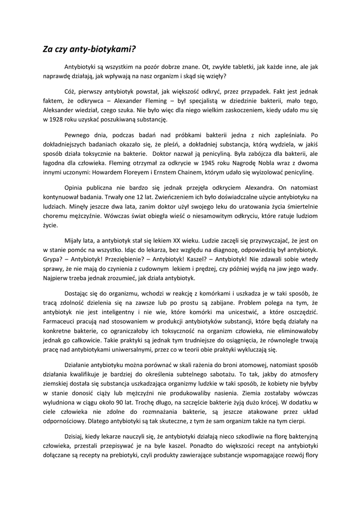 Za czy anty-biotykami? Antybiotyki są wszystkim na pozór dobrze znane. Ot, zwykłe tabletki, jak każde inne, ale jak naprawdę działają, jak wpływają na nasz organizm i skąd się wzięły? Cóż, pierwszy antybiotyk powstał, jak większość odkryć, przez przypadek. Fakt jest jednak faktem, że odkrywca – Alexander Fleming – był specjalistą w dziedzinie bakterii, mało tego, Aleksander wiedział, czego szuka. Nie było więc dla niego wielkim zaskoczeniem, kiedy udało mu się w 1928 roku uzyskać poszukiwaną substancję. Pewnego dnia, podczas badań nad próbkami bakterii jedna z nich zapleśniała. Po dokładniejszych badaniach okazało się, że pleśń, a dokładniej substancja, którą wydziela, w jakiś sposób działa toksycznie na bakterie. Doktor nazwał ją penicyliną. Była zabójcza dla bakterii, ale łagodna dla człowieka. Fleming otrzymał za odkrycie w 1945 roku Nagrodę Nobla wraz z dwoma innymi uczonymi: Howardem Floreyem i Ernstem Chainem, którym udało się wyizolować penicylinę. Opinia publiczna nie bardzo się jednak przejęła odkryciem Alexandra. On natomiast kontynuował badania. Trwały one 12 lat. Zwieńczeniem ich było doświadczalne użycie antybiotyku na ludziach. Minęły jeszcze dwa lata, zanim doktor użył swojego leku do uratowania życia śmiertelnie choremu mężczyźnie. Wówczas świat obiegła wieść o niesamowitym odkryciu, które ratuje ludziom życie. Mijały lata, a antybiotyk stał się lekiem XX wieku. Ludzie zaczęli się przyzwyczajać, że jest on w stanie pomóc na wszystko. Idąc do lekarza, bez względu na diagnozę, odpowiedzią był antybiotyk. Grypa? – Antybiotyk! Przeziębienie? – Antybiotyk! Kaszel? – Antybiotyk! Nie zdawali sobie wtedy sprawy, że nie mają do czynienia z cudownym lekiem i prędzej, czy później wyjdą na jaw jego wady. Najpierw trzeba jednak zrozumieć, jak działa antybiotyk. Dostając się do organizmu, wchodzi w reakcję z komórkami i uszkadza je w taki sposób, że tracą zdolność dzielenia się na zawsze lub po prostu są zabijane. Problem polega na tym, że antybiotyk nie jest inteligentny i nie wie, które komórki ma unicestwić, a które oszczędzić. Farmaceuci pracują nad stosowaniem w produkcji antybiotyków substancji, które będą działały na konkretne bakterie, co ograniczałoby ich toksyczność na organizm człowieka, nie eliminowałoby jednak go całkowicie. Takie praktyki są jednak tym trudniejsze do osiągnięcia, że równolegle trwają pracę nad antybiotykami uniwersalnymi, przez co w teorii obie praktyki wykluczają się. Działanie antybiotyku można porównać w skali rażenia do broni atomowej, natomiast sposób działania kwalifikuje je bardziej do określenia subtelnego sabotażu. To tak, jakby do atmosfery ziemskiej dostała się substancja uszkadzająca organizmy ludzkie w taki sposób, że kobiety nie byłyby w stanie donosić ciąży lub mężczyźni nie produkowaliby nasienia. Ziemia zostałaby wówczas wyludniona w ciągu około 90 lat. Trochę długo, na szczęście bakterie żyją dużo krócej. W dodatku w ciele człowieka nie zdolne do rozmnażania bakterie, są jeszcze atakowane przez układ odpornościowy. Dlatego antybiotyki są tak skuteczne, z tym że sam organizm także na tym cierpi. Dzisiaj, kiedy lekarze nauczyli się, że antybiotyki działają nieco szkodliwie na florę bakteryjną człowieka, przestali przepisywać je na byle kaszel. Ponadto do większości recept na antybiotyki dołączane są recepty na prebiotyki, czyli produkty zawierające substancje wspomagające rozwój flory bakteryjnej człowieka lub probiotyki, czyli produkty zawierające żywe bakterie. Ludzie na początku drugiej połowy XX wieku nie stosowali takich „wspomagaczy”, co doprowadziło do problemów z odpornością i trawieniem u tych, którym często przepisywano antybiotyki. Świat się oburzył i jak to bywa, podzielił się na obrońców i zagorzałych przeciwników antybiotyków. Musiało minąć sporo czasu zanim odzyskały one swoje dobre imię. Nie ulega wątpliwości, że antybiotyki są ważną częścią dzisiejszej medycyny konwencjonalnej. Nie ma jednak rzeczy idealnych i nieszkodliwych i nie można przesadzać z niektórymi z nich. Aktualna wydaje się w tym kontekście kolokwialna maksyma: wszystko jest dla ludzi, tylko z umiarem. Szymon Szafranek kl. I Ti