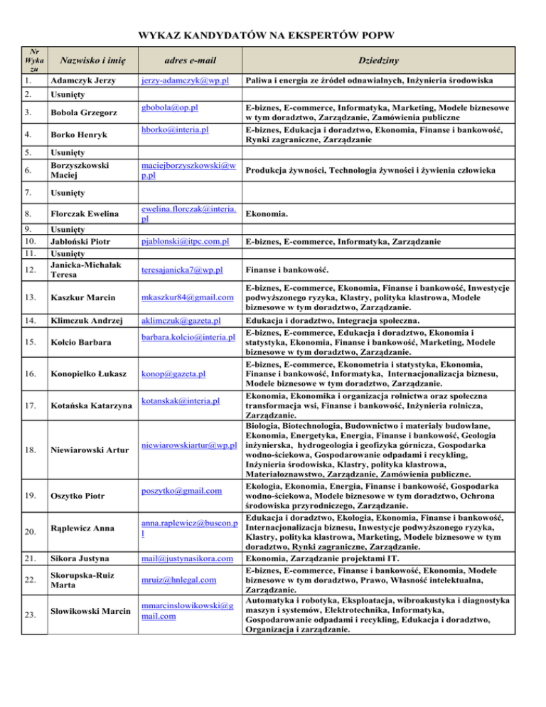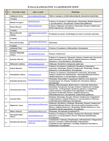 WYKAZ KANDYDATÓW NA EKSPERTÓW POPW Nr Wyka zu Nazwisko i imię 1. Adamczyk Jerzy 2. Usunięty 3. Bobola Grzegorz 4. Borko Henryk 5. Usunięty 6. Borzyszkowski Maciej 7. Usunięty 8. Florczak Ewelina 9. 10. 11. Usunięty Jabłoński Piotr Usunięty Janicka-Michalak Teresa 12. adres e-mail [email protected] Paliwa i energia ze źródeł odnawialnych, Inżynieria środowiska [email protected] E-biznes, E-commerce, Informatyka, Marketing, Modele biznesowe w tym doradztwo, Zarządzanie, Zamówienia publiczne [email protected] E-biznes, Edukacja i doradztwo, Ekonomia, Finanse i bankowość, Rynki zagraniczne, Zarządzanie maciejborzyszkowski@w p.pl Produkcja żywności, Technologia żywności i żywienia człowieka ewelina.florczak@interia. pl Ekonomia. [email protected] E-biznes, E-commerce, Informatyka, Zarządzanie [email protected] Finanse i bankowość. E-biznes, E-commerce, Ekonomia, Finanse i bankowość, Inwestycje podwyższonego ryzyka, Klastry, polityka klastrowa, Modele biznesowe w tym doradztwo, Zarządzanie. 13. Kaszkur Marcin [email protected] 14. Klimczuk Andrzej [email protected] 15. Kołcio Barbara 16. Konopielko Łukasz 17. Kotańska Katarzyna 18. Niewiarowski Artur 19. Oszytko Piotr 20. Rąplewicz Anna 21. Sikora Justyna 22. Skorupska-Ruiz Marta 23. Słowikowski Marcin Dziedziny Edukacja i doradztwo, Integracja społeczna. E-biznes, E-commerce, Edukacja i doradztwo, Ekonomia i [email protected] statystyka, Ekonomia, Finanse i bankowość, Marketing, Modele biznesowe w tym doradztwo, Zarządzanie. E-biznes, E-commerce, Ekonometria i statystyka, Ekonomia, [email protected] Finanse i bankowość, Informatyka, Internacjonalizacja biznesu, Modele biznesowe w tym doradztwo, Zarządzanie. Ekonomia, Ekonomika i organizacja rolnictwa oraz społeczna [email protected] transformacja wsi, Finanse i bankowość, Inżynieria rolnicza, Zarządzanie. Biologia, Biotechnologia, Budownictwo i materiały budowlane, Ekonomia, Energetyka, Energia, Finanse i bankowość, Geologia [email protected] inżynierska, hydrogeologia i geofizyka górnicza, Gospodarka wodno-ściekowa, Gospodarowanie odpadami i recykling, Inżynieria środowiska, Klastry, polityka klastrowa, Materiałoznawstwo, Zarządzanie, Zamówienia publiczne. Ekologia, Ekonomia, Energia, Finanse i bankowość, Gospodarka [email protected] wodno-ściekowa, Modele biznesowe w tym doradztwo, Ochrona środowiska przyrodniczego, Zarządzanie. Edukacja i doradztwo, Ekologia, Ekonomia, Finanse i bankowość, [email protected] Internacjonalizacja biznesu, Inwestycje podwyższonego ryzyka, l Klastry, polityka klastrowa, Marketing, Modele biznesowe w tym doradztwo, Rynki zagraniczne, Zarządzanie. [email protected] Ekonomia, Zarządzanie projektami IT. E-biznes, E-commerce, Finanse i bankowość, Ekonomia, Modele [email protected] biznesowe w tym doradztwo, Prawo, Własność intelektualna, Zarządzanie. Automatyka i robotyka, Eksploatacja, wibroakustyka i diagnostyka mmarcinslowikowski@g maszyn i systemów, Elektrotechnika, Informatyka, mail.com Gospodarowanie odpadami i recykling, Edukacja i doradztwo, Organizacja i zarządzanie. Finanse i bankowość, Modele biznesowe w tym doradztwo, Integracja społeczna, Zarządzanie. Budowa i eksploatacja maszyn, Edukacja i doradztwo, janusz.swierzowicz@gma Informatyka, Technologie informacyjne, komunikacyjne i il.com informatyczne, Zarządzanie. [email protected] Budowa i eksploatacja maszyn, Mechanika. 24. Szarras Robert 25. Świerzowicz Janusz 26. Wernik Jacek 27. Wiewiórowska Sylwia [email protected] 28. Zapał Mateusz [email protected] E-biznes, Finanse i bankowość, Informatyka, Modele biznesowe w om tym doradztwo, Własność intelektualna. 29. Usunięty 30. Żebrowski Paweł [email protected] 31. Fedyk Wojciech [email protected] 32. Koć Patryk [email protected] 33. Usunięty 34. Owczarek Mariusz 35. Usunięty 36. Rak Tomasz 37. Rochacka-Gagliardi Weronika 38. Sakowicz Bartosz 39. Usunięty Ulanowski Waldemar 40. 41. Woźniak Krzysztof 42. Bera Anna 43. Biernat Krzysztof 45. ChojnickaSzymaniak Marta Usunięty 46. Ćwik Kamila 44. [email protected] [email protected] m [email protected] Materiałoznawstwo, Metalurgia, odlewnictwo i przetwórstwo metali, Edukacja i doradztwo. Informatyka. Edukacja i doradztwo, Modele biznesowe w tym doradztwo, Marketing, Zarządzanie. Automatyka i robotyka, Edukacja i doradztwo, Finanse i bankowość, Internacjonalizacja biznesu, Marketing, Modele biznesowe w tym doradztwo, Zarządzanie. E-biznes, E-commerce, Analiza finansowa, Innowacje e-biznes, technologie informacyjne, komunikacyjne i informatyczne. E-biznes, E-commerce, Transfer technologii, Innowacje technologiczne, Innowacje e-biznes, Innowacje popytowe, zarządzanie projektami IT. weronika.rochacka@gmai Strategia designu, Zarządzanie designem. l.com Automatyka i robotyka, E-biznes, E-commerce, Edukacja i doradztwo, Elektronika, Elektrotechnika, Energetyka, bartosz.sakowicz@gmail. Informatyka, Transfer technologii, Innowacje technologiczne, com innowacje e-biznes, Innowacje popytowe, Metody komputerowe w nauce, Modele biznesowe w tym doradztwo, Analiza biznesowa, technologie informacyjne, komunikacyjne i informatyczne, Zarządzanie przedsiębiorstwem, Zarządzanie projektami IT. [email protected] Chemia techniczna, Nauki chemiczne, Nauki farmaceutyczne. E-biznes, E-commerce, Edukacja i doradztwo, Analiza finansowa, Transfer technologii, Innowacje technologiczne, Innowacje e-biznes, Innowacje popytowe, Technologie informacyjne, komunikacyjne i [email protected] informatyczne, Klastry i polityka klastrowa, Analiza finansowa, Zarządzanie i organizacja w administracji publicznej, Zarządzanie przedsiębiorstwem, Zarządzanie strategiczne, Zarządzanie zmianą, Zarządzanie projektami IT, Zarządzanie procesowe, Zarządzanie jakością. Edukacja i doradztwo, Ekonomia, Finanse i bankowość, [email protected] Internacjonalizacja biznesu, Inwestycje podwyższonego ryzyka, Modele biznesowe w tym doradztwo, Rynki 