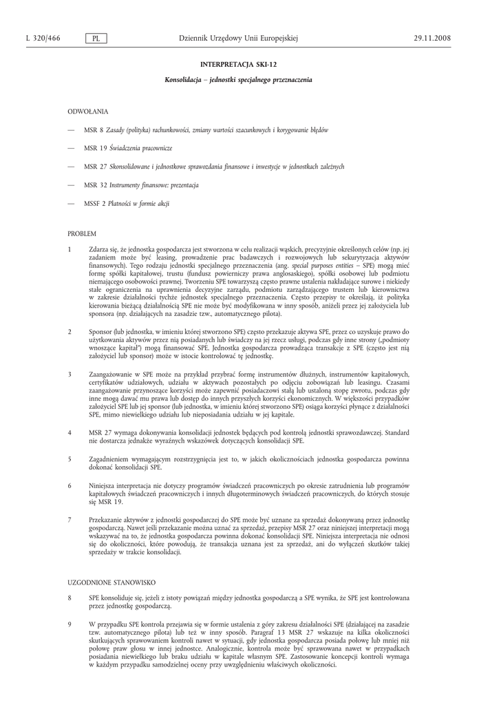 L 320/466 Dziennik Urzędowy Unii Europejskiej PL INTERPRETACJA SKI-12 Konsolidacja – jednostki specjalnego przeznaczenia ODWOŁANIA — MSR 8 Zasady (polityka) rachunkowości, zmiany wartości szacunkowych i korygowanie błędów — MSR 19 Świadczenia pracownicze — MSR 27 Skonsolidowane i jednostkowe sprawozdania finansowe i inwestycje w jednostkach zależnych — MSR 32 Instrumenty finansowe: prezentacja — MSSF 2 Płatności w formie akcji PROBLEM 1 Zdarza się, że jednostka gospodarcza jest stworzona w celu realizacji wąskich, precyzyjnie określonych celów (np. jej zadaniem może być leasing, prowadzenie prac badawczych i rozwojowych lub sekurytyzacja aktywów finansowych). Tego rodzaju jednostki specjalnego przeznaczenia (ang. special purposes entities – SPE) mogą mieć formę spółki kapitałowej, trustu (fundusz powierniczy prawa anglosaskiego), spółki osobowej lub podmiotu niemającego osobowości prawnej. Tworzeniu SPE towarzyszą często prawne ustalenia nakładające surowe i niekiedy stałe ograniczenia na uprawnienia decyzyjne zarządu, podmiotu zarządzającego trustem lub kierownictwa w zakresie działalności tychże jednostek specjalnego przeznaczenia. Często przepisy te określają, iż polityka kierowania bieżącą działalnością SPE nie może być modyfikowana w inny sposób, aniżeli przez jej założyciela lub sponsora (np. działających na zasadzie tzw., automatycznego pilota). 2 Sponsor (lub jednostka, w imieniu której stworzono SPE) często przekazuje aktywa SPE, przez co uzyskuje prawo do użytkowania aktywów przez nią posiadanych lub świadczy na jej rzecz usługi, podczas gdy inne strony („podmioty wnoszące kapitał”) mogą finansować SPE. Jednostka gospodarcza prowadząca transakcje z SPE (często jest nią założyciel lub sponsor) może w istocie kontrolować tę jednostkę. 3 Zaangażowanie w SPE może na przykład przybrać formę instrumentów dłużnych, instrumentów kapitałowych, certyfikatów udziałowych, udziału w aktywach pozostałych po odjęciu zobowiązań lub leasingu. Czasami zaangażowanie przynoszące korzyści może zapewnić posiadaczowi stałą lub ustaloną stopę zwrotu, podczas gdy inne mogą dawać mu prawa lub dostęp do innych przyszłych korzyści ekonomicznych. W większości przypadków założyciel SPE lub jej sponsor (lub jednostka, w imieniu której stworzono SPE) osiąga korzyści płynące z działalności SPE, mimo niewielkiego udziału lub nieposiadania udziału w jej kapitale. 4 MSR 27 wymaga dokonywania konsolidacji jednostek będących pod kontrolą jednostki sprawozdawczej. Standard nie dostarcza jednakże wyraźnych wskazówek dotyczących konsolidacji SPE. 5 Zagadnieniem wymagającym rozstrzygnięcia jest to, w jakich okolicznościach jednostka gospodarcza powinna dokonać konsolidacji SPE. 6 Niniejsza interpretacja nie dotyczy programów świadczeń pracowniczych po okresie zatrudnienia lub programów kapitałowych świadczeń pracowniczych i innych długoterminowych świadczeń pracowniczych, do których stosuje się MSR 19. 7 Przekazanie aktywów z jednostki gospodarczej do SPE może być uznane za sprzedaż dokonywaną przez jednostkę gospodarczą. Nawet jeśli przekazanie można uznać za sprzedaż, przepisy MSR 27 oraz niniejszej interpretacji mogą wskazywać na to, że jednostka gospodarcza powinna dokonać konsolidacji SPE. Niniejsza interpretacja nie odnosi się do okoliczności, które powodują, że transakcja uznana jest za sprzedaż, ani do wyłączeń skutków takiej sprzedaży w trakcie konsolidacji. UZGODNIONE STANOWISKO 8 SPE konsoliduje się, jeżeli z istoty powiązań między jednostka gospodarczą a SPE wynika, że SPE jest kontrolowana przez jednostkę gospodarczą. 9 W przypadku SPE kontrola przejawia się w formie ustalenia z góry zakresu działalności SPE (działającej na zasadzie tzw. automatycznego pilota) lub też w inny sposób. Paragraf 13 MSR 27 wskazuje na kilka okoliczności skutkujących sprawowaniem kontroli nawet w sytuacji, gdy jednostka gospodarcza posiada połowę lub mniej niż połowę praw głosu w innej jednostce. Analogicznie, kontrola może być sprawowana nawet w przypadkach posiadania niewielkiego lub braku udziału w kapitale własnym SPE. Zastosowanie koncepcji kontroli wymaga w każdym przypadku samodzielnej oceny przy uwzględnieniu właściwych okoliczności. 29.11.2008 29.11.2008 Dziennik Urzędowy Unii Europejskiej PL 10 11 Na sprawowanie przez jednostkę gospodarczą kontroli w SPE, a zatem na konieczność konsolidacji SPE, poza okolicznościami, jakie zostały opisane w paragrafie 13 MSR 27, mogą na przykład wskazywać następujące okoliczności (dalsze wytyczne znajdują się w załączniku do niniejszej interpretacji): a) SPE prowadzi w istocie działalność w imieniu jednostki gospodarczej zgodną z jej potrzebami gospodarczymi, z tytułu których jednostka gospodarcza uzyskuje korzyści; b) jednostka gospodarcza posiada w istocie uprawnienia decyzyjne do uzyskiwania większości korzyści z działalności SPE lub jednostka gospodarcza przekazała te uprawnienia decyzyjne poprzez ustalenie mechanizmu „automatycznego pilota”; c) jednostka gospodarcza posiada w istocie prawo do uzyskiwania większości korzyści z SPE, a zatem jest narażona na ryzyko związane z działalnością prowadzoną przez SPE; lub d) jednostka gospodarcza ponosi w istocie większą część ryzyka związanego z posiadaniem SPE lub z posiadaniem jej aktywów, mającego na celu uzyskanie większości korzyści z jej działalności. [Usunięty] DATA UZGODNIENIA STANOWISKA Czerwiec 1998 r. DATA WEJŚCIA W ŻYCIE Niniejszą interpretację stosuje się do rocznych okresów obrotowych rozpoczynających się dnia 1 lipca 1999 r. i później. Zaleca się wcześniejsze stosowanie interpretacji. Zmiany zasad (polityki) rachunkowości stosuje się zgodnie z przepisami MSR 8. Jednostka stosuje zmianę w paragrafie 6 w odniesieniu do rocznych okresów