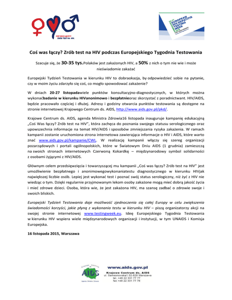 Coś was łączy? Zrób test na HIV podczas Europejskiego Tygodnia Testowania Szacuje się, że 30-35 tys.Polaków jest zakażonych HIV, a 50% z nich o tym nie wie i może nieświadomie zakażad Europejski Tydzieo Testowania w kierunku HIV to dobraokazja, by odpowiedzied sobie na pytanie, czy w moim życiu zdarzyło się coś, co mogło spowodowad zakażenie? W dniach 20-27 listopadawiele punktów konsultacyjno-diagnostycznych, w których można wykonadbadanie w kierunku HIVanonimowo i bezpłatnieoraz skorzystad z poradnictwant. HIV/AIDS, będzie pracowało częściej i dłużej. Adresy i godziny otwarcia punktów testowania są dostępne na stronie internetowej Krajowego Centrum ds. AIDS, http://www.aids.gov.pl/pkd/. Krajowe Centrum ds. AIDS, agenda Ministra Zdrowia16 listopada inauguruje kampanię edukacyjną „Coś Was łączy? Zrób test na HIV”, która zachęca do poznania swojego statusu serologicznego oraz upowszechnia informacje na temat HIV/AIDS i sposobów zmniejszania ryzyka zakażenia. W ramach kampanii zostanie uruchomiona strona internetowa zawierająca informacje o HIV i AIDS, które warto znad www.aids.gov.pl/kampanie/CWL. W realizację kampanii włączy się szereg organizacji pozarządowych i portali ogólnopolskich, które w Światowym Dniu AIDS (1 grudnia) zamieszczą na swoich stronach internetowych Czerwoną Kokardkę – międzynarodowy symbol solidarności z osobami żyjącymi z HIV/AIDS. Głównym celem przedsięwzięcia i towarzyszącej mu kampanii „Coś was łączy? Zrób test na HIV” jest umożliwienie bezpłatnego i anonimowegowykonaniatestu diagnostycznego w kierunku HIVjak największej liczbie osób. Lepiej jest wykonad test i poznad swój status serologiczny, niż żyd z HIV nie wiedząc o tym. Dzięki regularnie przyjmowanym lekom osoby zakażone mogą mied dobrą jakośd życia i mied zdrowe dzieci. Osoba, która wie, że jest zakażona HIV, ma szansę zadbad o zdrowie swoje i swoich bliskich. Europejski Tydzieo Testowania daje możliwość zjednoczenia się całej Europy w celu zwiększenia świadomości korzyści, jakie płyną z wykonania testu w kierunku HIV – piszą organizatorzy akcji na swojej stronie internetowej www.testingweek.eu. Ideę Europejskiego Tygodnia Testowania w kierunku HIV wspiera wiele międzynarodowych organizacji i instytucji, w tym UNAIDS i Komisja Europejska. 16 listopada 2015, Warszawa