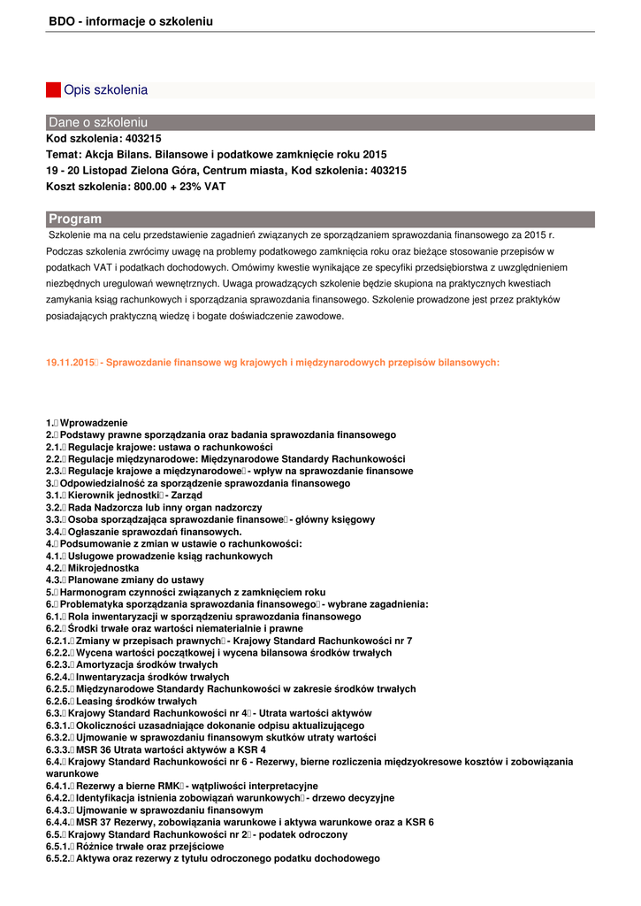 BDO - informacje o szkoleniu Opis szkolenia Dane o szkoleniu Kod szkolenia: 403215 Temat: Akcja Bilans. Bilansowe i podatkowe zamknięcie roku 2015 19 - 20 Listopad Zielona Góra, Centrum miasta, Kod szkolenia: 403215 Koszt szkolenia: 800.00 + 23% VAT Program Szkolenie ma na celu przedstawienie zagadnień związanych ze sporządzaniem sprawozdania finansowego za 2015 r. Podczas szkolenia zwrócimy uwagę na problemy podatkowego zamknięcia roku oraz bieżące stosowanie przepisów w podatkach VAT i podatkach dochodowych. Omówimy kwestie wynikające ze specyfiki przedsiębiorstwa z uwzględnieniem niezbędnych uregulowań wewnętrznych. Uwaga prowadzących szkolenie będzie skupiona na praktycznych kwestiach zamykania ksiąg rachunkowych i sporządzania sprawozdania finansowego. Szkolenie prowadzone jest przez praktyków posiadających praktyczną wiedzę i bogate doświadczenie zawodowe. 19.11.2015 - Sprawozdanie finansowe wg krajowych i międzynarodowych przepisów bilansowych: 1. Wprowadzenie 2. Podstawy prawne sporządzania oraz badania sprawozdania finansowego 2.1. Regulacje krajowe: ustawa o rachunkowości 2.2. Regulacje międzynarodowe: Międzynarodowe Standardy Rachunkowości 2.3. Regulacje krajowe a międzynarodowe - wpływ na sprawozdanie finansowe 3. Odpowiedzialność za sporządzenie sprawozdania finansowego 3.1. Kierownik jednostki - Zarząd 3.2. Rada Nadzorcza lub inny organ nadzorczy 3.3. Osoba sporządzająca sprawozdanie finansowe - główny księgowy 3.4. Ogłaszanie sprawozdań finansowych. 4. Podsumowanie z zmian w ustawie o rachunkowości: 4.1. Usługowe prowadzenie ksiąg rachunkowych 4.2. Mikrojednostka 4.3. Planowane zmiany do ustawy 5. Harmonogram czynności związanych z zamknięciem roku 6. Problematyka sporządzania sprawozdania finansowego - wybrane zagadnienia: 6.1. Rola inwentaryzacji w sporządzeniu sprawozdania finansowego 6.2. Środki trwałe oraz wartości niematerialnie i prawne 6.2.1. Zmiany w przepisach prawnych - Krajowy Standard Rachunkowości nr 7 6.2.2. Wycena wartości początkowej i wycena bilansowa środków trwałych 6.2.3. Amortyzacja środków trwałych 6.2.4. Inwentaryzacja środków trwałych 6.2.5. Międzynarodowe Standardy Rachunkowości w zakresie środków trwałych 6.2.6. Leasing środków trwałych 6.3. Krajowy Standard Rachunkowości nr 4 - Utrata wartości aktywów 6.3.1. Okoliczności uzasadniające dokonanie odpisu aktualizującego 6.3.2. Ujmowanie w sprawozdaniu finansowym skutków utraty wartości 6.3.3. MSR 36 Utrata wartości aktywów a KSR 4 6.4. Krajowy Standard Rachunkowości nr 6 - Rezerwy, bierne rozliczenia międzyokresowe kosztów i zobowiązania warunkowe 6.4.1. Rezerwy a bierne RMK - wątpliwości interpretacyjne 6.4.2. Identyfikacja istnienia zobowiązań warunkowych - drzewo decyzyjne 6.4.3. Ujmowanie w sprawozdaniu finansowym 6.4.4. MSR 37 Rezerwy, zobowiązania warunkowe i aktywa warunkowe oraz a KSR 6 6.5. Krajowy Standard Rachunkowości nr 2 - podatek odroczony 6.5.1. Różnice trwałe oraz przejściowe 6.5.2. Aktywa oraz rezerwy z tytułu odroczonego podatku dochodowego BDO - informacje o szkoleniu 6.5.3. Ujmowanie w sprawozdaniu finansowym 6.5.4. MSR 12 Podatek dochodowy a KSR 2 7. Dyskusja i zakończenie. 20.11.2015 - Podatkowe zamknięcie roku - przegląd wybranych zagadnień podatkowych: podatek dochodowy, podatek od towarów i usług: A. Podatek dochodowy od osób prawnych: 1. Podatek dochodowy od osób prawnych jako podatek rozliczany rocznie; roczne rozliczenie podatku - zmiana i zasady wyznaczania roku podatkowego 2. Zakończenie roku podatkowego i bilansowego - Roczna kalkulacja podatku, Przejście z wyniku bilansowego na wynik podatkowy, Ostateczne rozliczenie zaliczek na podatek dochodowy od osób prawnych, Deklaracja CIT-8 i inne obowiązki informacyjne, Zatwierdzenie sprawozdania finansowego i sprawozdania zarządu 3. Przychód podatkowy a przychód finansowy - ujęcie w rocznym sprawozdaniu finansowym. 4. Przychód podatkowy i moment jego uzyskania. - otwarty katalog przychodów z art. 12 updop (ze szczególnym uwzględnieniem przychodów z nieodpłatnych świadczeń i zasad ustalania ich wartości, umorzonych bądź przedawnionych zobowiązań) - moment rozpoznania przychodu - korekta bieżąca lub wsteczna w zakresie: przyznanych rabatów, premii pieniężnych, otrzymanych próbek, nieodpłatnie otrzymanych towarów, korekt obrotu. - katalog przysporzeń majątkowych nie stanowiących przychodów, - pojęcie zapłaty jako momentu rozpoznania przychodu powstającego na zasadzie kasowej (kapitalizacja, potrącenie, kompensata), - szczególne momenty rozpoznania niektórych przychodów (umorzenie zobowiązania, przedawnienie, zasiedzenie), czy umorzenie odsetek skutkuje powstaniem przychodu - zasady korygowania przychodów z działalności gospodarczej 5. Koszty uzyskania przychodu - definicja i zasady rozliczania kosztów w czasie: - koszty związane z przychodem danego roku, koszty dotyczące lat poprzednich, koszty przyszłych okresów, koszty rozliczane kasowo. 6. ,,Korekta kosztów" - stosowanie przepisów w praktyce 7. Koszty sporządzenia i badania rocznego sprawozdania finansowego: - wydatki stanowiące koszty podatkowe, - moment zaliczenia wydatków do kosztów podatkowych. BDO - informacje o szkoleniu 8. Dokumentowanie kosztów. 9. Koszty podatkowe a koszty finansowe. 10. Zaliczki na podatek dochodowy opłacane w trakcie roku: - uproszczone zaliczki na podatek dochodowy, ,,zwykłe" zaliczki na podatek dochodowy, konsekwencje błędnego naliczenia zaliczek na podatek dochodowy, błędne zaliczki po zakończeniu roku - czy korygować? 11. Zwolnienia od podatku - roczne obowiązki podatników korzystających ze zwolnień. 12. Zakupy od podmiotów zagranicznych i obowiązki płatnika - podatek ,,u źródła". 13. Obliczenie podatku: - stawka podatku, - odliczenia od dochodu, - dochody osiągane za granicą RP. 14. Zeznanie roczne. 15. Zmiana przepisów obowiązujących od 1.01.2016 r. - st