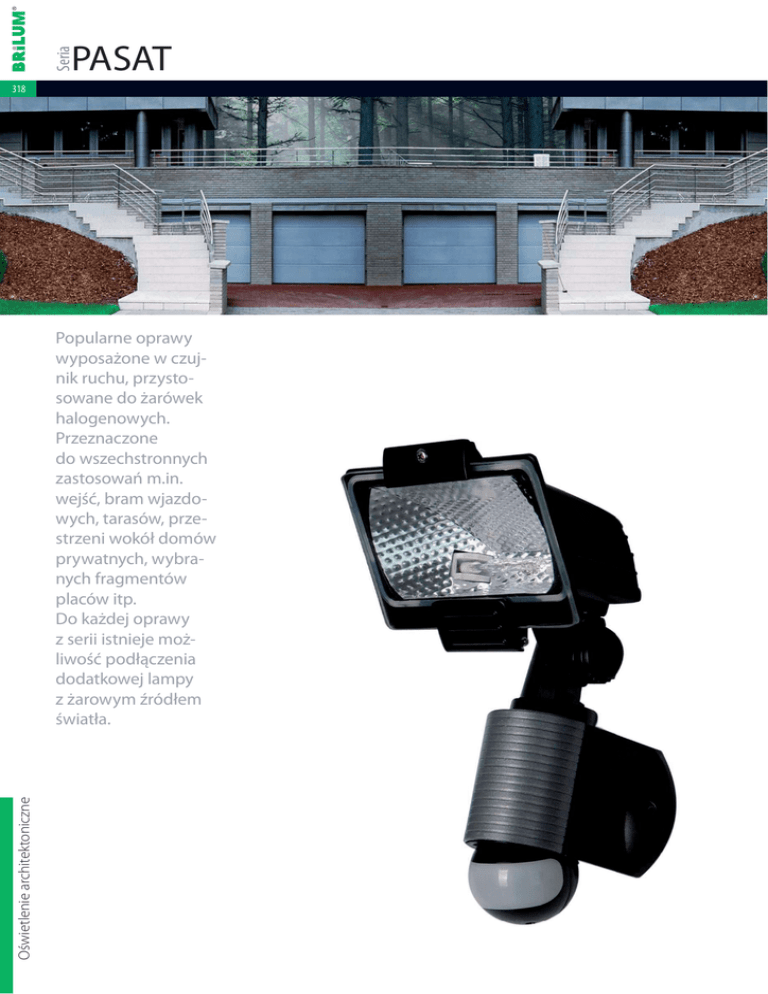 Seria PASAT 318 Oświetlenie architektoniczne Popularne oprawy wyposażone w czujnik ruchu, przystosowane do żarówek halogenowych. Przeznaczone do wszechstronnych zastosowań m.in. wejść, bram wjazdowych, tarasów, przestrzeni wokół domów prywatnych, wybranych fragmentów placów itp. Do każdej oprawy z serii istnieje możliwość podłączenia dodatkowej lampy z żarowym źródłem światła. 2. Oświetlenie architektoniczne • zewnętrzne 2.4. Projektory i naświetlacze 319 Rodzaj materiału: obudowa – stop aluminium, tworzywo sztuczne odbłyśnik – aluminium klosz/dyfuzor – szkło Zakres regulacji reflektora: w pionie do 25°, w poziomie do 80° Zakres regulacji czujnika ruchu: w pionie do 35°, w poziomie do 70° Zasięg wykrywania ruchu: max. 12m przy 20°C Czas świecenia: od 5 sek. do 12 min. Temperatura pracy: -20°C ... +40°C ~230V R7s 1m IP 44 180O 2.5mm2 PASAT 150S max. 0,87kg Nr art. Oprawa halogenowa, ruchoma, z czujnikiem ruchu Model Indeks Kolor Cena netto PLN 0890 PASAT 150S NH-PA150S-00 czarny 152,00 0891 PASAT 150S NH-PA150S-90 szary 152,00 NOWOŚĆ J-78 150W PASAT 500S max. 1,33kg Nr art. Oprawa halogenowa, ruchoma, z czujnikiem ruchu Model Indeks Kolor Cena netto PLN 0892 PASAT 500S NH-PA500S-00 czarny 214,00 0893 PASAT 500S NH-PA500S-90 szary 214,00 Zasięg wykrywania ruchu Zakres wykrywania ruchu Oświetlenie architektoniczne NOWOŚĆ J-118 500W