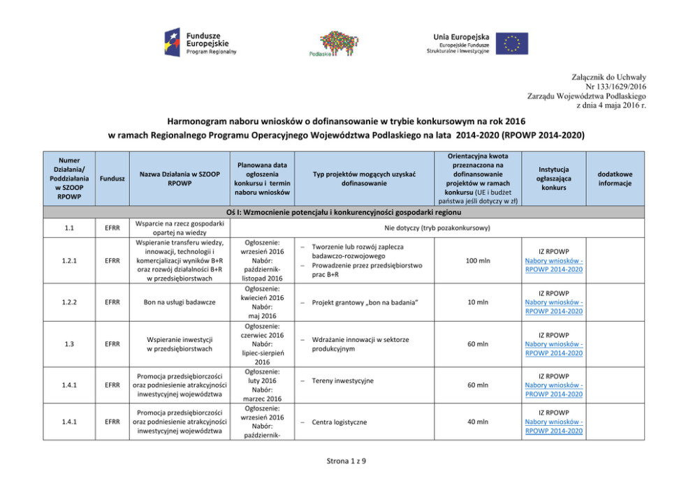 Załącznik do Uchwały Nr 133/1629/2016 Zarządu Województwa Podlaskiego z dnia 4 maja 2016 r. Harmonogram naboru wniosków o dofinansowanie w trybie konkursowym na rok 2016 w ramach Regionalnego Programu Operacyjnego Województwa Podlaskiego na lata 2014-2020 (RPOWP 2014-2020) Numer Działania/ Poddziałania w SZOOP RPOWP Fundusz Planowana data ogłoszenia konkursu i termin naboru wniosków Nazwa Działania w SZOOP RPOWP Typ projektów mogących uzyskać dofinasowanie Orientacyjna kwota przeznaczona na dofinansowanie projektów w ramach konkursu (UE i budżet państwa jeśli dotyczy w zł) Instytucja ogłaszająca konkurs Oś I: Wzmocnienie potencjału i konkurencyjności gospodarki regionu 1.1 EFRR Wsparcie na rzecz gospodarki opartej na wiedzy Wspieranie transferu wiedzy, innowacji, technologii i komercjalizacji wyników B+R oraz rozwój działalności B+R w przedsiębiorstwach 1.2.1 EFRR 1.2.2 EFRR Bon na usługi badawcze 1.3 EFRR Wspieranie inwestycji w przedsiębiorstwach 1.4.1 EFRR Promocja przedsiębiorczości oraz podniesienie atrakcyjności inwestycyjnej województwa 1.4.1 EFRR Promocja przedsiębiorczości oraz podniesienie atrakcyjności inwestycyjnej województwa Nie dotyczy (tryb pozakonkursowy) Ogłoszenie: wrzesień 2016 Nabór: październiklistopad 2016 Ogłoszenie: kwiecień 2016 Nabór: maj 2016 Ogłoszenie: czerwiec 2016 Nabór: lipiec-sierpień 2016 Ogłoszenie: luty 2016 Nabór: marzec 2016 Ogłoszenie: wrzesień 2016 Nabór: październik- Tworzenie lub rozwój zaplecza badawczo-rozwojowego Prowadzenie przez przedsiębiorstwo prac B+R 100 mln IZ RPOWP Nabory wniosków RPOWP 2014-2020 Projekt grantowy „bon na badania” 10 mln IZ RPOWP Nabory wniosków RPOWP 2014-2020 Wdrażanie innowacji w sektorze produkcyjnym 60 mln IZ RPOWP Nabory wniosków RPOWP 2014-2020 Tereny inwestycyjne 60 mln IZ RPOWP Nabory wniosków PROWP 2014-2020 Centra logistyczne 40 mln IZ RPOWP Nabory wniosków RPOWP 2014-2020 Strona 1 z 9 dodatkowe informacje Numer Działania/ Poddziałania w SZOOP RPOWP Fundusz Nazwa Działania w SZOOP RPOWP 1.4.1 EFRR Promocja przedsiębiorczości oraz podniesienie atrakcyjności inwestycyjnej województwa 1.4.2 EFRR Podniesienie atrakcyjności inwestycyjnej BOF EFRR Wspieranie przedsiębiorczości i zatrudnienia w gminach, których rozwój uwarunkowany jest siecią Natura 2000 1.5 Planowana data ogłoszenia konkursu i termin naboru wniosków listopad 2016 Ogłoszenie: listopad 2016 Nabór ciągły: grudzień 2016 – kwiecień 2017 Typ projektów mogących uzyskać dofinasowanie Tereny inwestycyjne Orientacyjna kwota przeznaczona na dofinansowanie projektów w ramach konkursu (UE i budżet państwa jeśli dotyczy w zł) Instytucja ogłaszająca konkurs 50 mln IZ RPOWP Nabory wniosków RPOWP 2014-2020 Nie dotyczy (tryb pozakonkursowy) Ogłoszenie: sierpień 2016 Nabór: wrzesieńpaździernik 2016 Pełen zakres działania – zgodnie z SZOOP RPOWP 20 mln IZ RPOWP Nabory wniosków RPOWP 2014-2020 8 mln WUP w Białymstoku Strona główna Wojewódzki Urząd Pracy w Białymstoku OŚ II: Przedsiębiorczość i aktywność zawodowa 2.1 2.2 2.3 EFS Zwiększanie zdolności zatrudnieniowej osób pozostających bez zatrudnienia oraz osób poszukujących pracy przy wykorzystaniu aktywnej polityki rynku pracy oraz wspieranie mobilności zasobów pracy Ogłoszenie: sierpień 2016 Nabór: wrzesień 2016 EFS Działania na rzecz równowagi praca – życie Ogłoszenie: marzec 2016 Nabór: kwiecień 2016 EFS Wspieranie powstawania i rozwoju podmiotów gospodarczych Ogłoszenie: październik 2016 Nabór: listopad 2016 Programy podnoszące aktywność zawodową i zdolność do zatrudnienia Udostępnienie usług w zakresie opieki nad dziećmi w wieku do 3 lat poprzez tworzenie nowych miejsc opieki Wsparcie pracodawców (w tym przedsiębiorców) w stosowaniu rozwiązań na rzecz godzenia życia zawodowego z prywatnym, w połączeniu ze wsparciem kierowanym do osób opiekujących się dziećmi w wieku do lat 3 27 mln WUP w Białymstoku Strona główna Wojewódzki Urząd Pracy w Białymstoku Bezzwrotne wsparcie dla osób zamierzających rozpocząć prowadzenie działalności gospodarczej 20 mln IZ RPOWP Nabory wniosków RPOWP 2014-2020 Strona 2 z 9 dodatkowe informacje Numer Działania/ Poddziałania w SZOOP RPOWP Fundusz Nazwa Działania w SZOOP RPOWP Planowana data ogłoszenia konkursu i termin naboru wniosków Typ projektów mogących uzyskać dofinasowanie 2.4 EFS Adaptacja pracowników, przedsiębiorstw i przedsiębiorców do zmian Ogłoszenie: grudzień 2016 Nabór: styczeń 2017 2.5 EFS Aktywne i zdrowe starzenie się Ogłoszenie: październik2016 Nabór: grudzień 2016 – styczeń 2017 Wsparcie dla osób zwolnionych, przewidzianych do zwolnienia lub zagrożonych zwolnieniem z pracy z przyczyn dotyczących zakładu pracy, realizowane w formie tworzenia i wdrożenia programów typu outplacement Realizacja programów rehabilitacji leczniczej zapobiegającej przerywaniu aktywności zawodowej ze względów zdrowotnych ułatwiających powrót na rynek pracy. Realizacja programów profilaktyki zdrowotnej (pierwotnej i wtórnej), dotyczących chorób będących istotnym problemem zdrowotnym regionu. Realizacja programów dotyczących przekwalifikowania pracowników długotrwale pracujących w warunkach negatywnie wpływających na zdrowie, przygotowujących do kontynuowania pracy na innych stanowiskach o mniejszym obciążeniu dla zdrowia, wspierających osoby w decyzji o pozostaniu aktywnym społecznie i zawodowo, w tym poprzez umożliwienie przekwalifikowania pracownika i umożliwienie mu wykonywania pracy bez narażenia na czynniki zagrażające zdrowiu; dostosowywanie warunków pracy do wyzwań związanych ze starzeniem się społeczeństwa, eliminowanie zdrowotnych czynników ryzyka w miejscu pracy. Strona 3 z 9 Orientacyjna kwota przeznaczona na dofinansowanie projektów w ramach konkursu (UE i budżet państwa jeśli dotyczy w zł) Instytucja ogłaszająca konkurs 4 mln WUP 