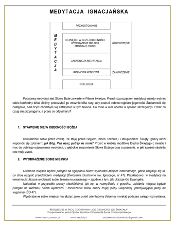 MEDYTACJA IGNACJAŃSKA PRZYGOTOWANIE M E D Y T A C J A STANIĘCIE W BOŻEJ OBECNOŚCI WYOBRAŻENIE MIEJSCA PROŚBA O OWOC ROZPOCZĘCIE ZASADNICZA MEDYTACJA ROZMOWA KOŃCOWA ZAKOŃCZENIE REFLEKSJA Podstawą medytacji jest Słowo Boże zawarte w Piśmie świętym. Przed rozpoczęciem medytacji należy wybrać sobie konkretny tekst biblijny, przeczytać go uważnie kilka razy, aby poznać dobrze najpierw jego treść. Zastanowić się następnie, nad czym chciałbym się zatrzymać w tym tekście. Co mnie w nim uderza w sposób szczególny? Przez co czuję się przyciągany, a przez co odpychany? 1. STAWIENIE SIĘ W OBECNOŚCI BOŻEJ Uświadomić sobie przez chwilę, że staję przed Bogiem, moim Stwórcą i Odkupicielem. Święty Ignacy radzi wspomóc się pytaniem: jak Bóg, Pan nasz, patrzy na mnie? Prosić w krótkiej modlitwie Ducha Świętego o światło i moc do dobrego odprawienia medytacji, o głębokie zrozumienie Słowa Bożego oraz o poznanie, w jaki sposób oświetla ono moje życie. 2. WYOBRAŻENIE SOBIE MIEJSCA Ustalenie miejsca będzie polegać na oglądaniu okiem wyobraźni miejsca materialnego, gdzie znajduje się to, co chcę uczynić przedmiotem medytacji (Ćwiczenia Duchowne św. Ignacego, nr 47). Przykładowo: w medytacji na temat nauki Jezusa wyobrazić sobie Jezusa nauczającego – zgodnie z tym, jak ukazuje Go Ewangelia. Natomiast w przypadku rzeczy niewidzialnej, jak np. w rozmyślaniu o grzechu, ustalenie miejsca będzie polegać na widzeniu okiem wyobraźni i rozważaniu stanu duszy mojej jakby uwięzionej, przebywającej jakby na wygnaniu (ĆD 47). Wyobrażenie sobie miejsca ma służyć, jako punkt orientacyjny (latarnia morska) podczas całego rozmyślania. REKOLEKCJE W ŻYCIU CODZIENNYM „OD CIEMNOSCI DO ŚWIATAŁA” Przygotowane przez Ojców Jezuitów i Wspólnotę Życia Chrześcijańskiego www.wzch.poznan.pl www.jezuici.pl [email protected] W razie „zagubienia się” (oddalenia się myślą i sercem od przedmiotu medytacji) umiejscowienie rozważanej treści wydarzenia ma być pomocą w „odnalezieniu się". Wyobrażenie sobie miejsca będzie się zmieniać w zależności od danego przedmiotu medytacji. 3. PROŚBA O OWOC DANEGO ROZMYŚLANIA Prosić Boga, Pana naszego, o to czego chcę i pragnę. Prośba ta ma się stosować do danego przedmiotu: jeżeli rozważam o Zmartwychwstaniu Jezusa, to prosić o radość z Chrystusem radosnym, a jeżeli o Męce, prosić o ból, łzy i cierpienie z Chrystusem cierpiącym (ĆD 48). Prośba o owoc danego rozmyślania określa cel, który pragnie się osiągnąć. Nie tylko poszczególne medytacje, ale także poszczególne Tygodnie oraz całe Ćwiczenia zmierzają do określonego owocu - celu. 4. DALSZY CIĄG MEDYTACJI Medytacja będąc modlitwą jest otwarciem całego człowieka, jego całej głębi osobowej na obecność i działanie zbawcze Boga. Konkretnie: chodzi o to, by z maksymalną uważnością nakierować wszystkie zmysły (zwłaszcza słuch i wzrok) a przede wszystkim duchowe zdolności (pamięć i rozum) - na prawdę historyczną (ĆD 2). To zaktywizowanie i ukierunkowanie zdolności poznawczych obudzi głębię serca (zwykle mówimy o woli i o uczuciach). A) Co Bóg mówi? (Słuchać, patrzeć, rozumieć). Trzeba uważnie patrzeć i słuchać, by obiektywnie poznać Boże orędzie zawarte w medytowanym tekście biblijnym. Jaką prawdę przekazuje mi Bóg w tej perykopie? Zatrzymać swoją uwagę w szczególny sposób nad tym, co mnie uderza: nad tym, co mnie pociąga lub też, co wydaje mi się trudne do przyjęcia. Uświadomię sobie, że jest to wezwanie samego Boga. Rozumiejąc słuchanie, chociaż jest podstawą medytacji, to jednak nie jest ani jedyną ani najważniejszą jej aktywnością. Rozbudowanie samego słuchania i rozważania w medytacji groziłoby przeintelektualizowaniem naszej modlitwy. B) Poddać się osądowi Słowa Bożego Słowo Boże zawarte w Piśmie świętym jest zawsze objawione i przeznaczone dla konkretnego człowieka: poznana Prawda jest skierowana do mnie. Jakie konsekwencja wynikają dla mnie z poznanej prawdy? W jaki sposób oświetla ona moje życie całe moje życie: przeszłe, teraźniejsza i przyszłe? Osądzanie mojego życia w świetle Słowa Bożego winno być bardzo konkretne, np. Słowo Boże musi osądzić konkretne sytuacje i problemy mojego życia. C) Moja odpowiedź Polega na poddaniu się pewnym uczuciom budzącym się pod wpływem zetknięcia się mojego życia ze Słowem Bożym. Uczucia winny przeplatać całą medytację: uczucia miłości do Boga, dziękczynienia, żalu, prośby, itd. O ile działania poznawcze winny być świadomie pobudzane, kierowane, a nawet ograniczane, o tyle w zakresie uczuć REKOLEKCJE W ŻYCIU CODZIENNYM „OD CIEMNOSCI DO ŚWIATAŁA” Przygotowane przez Ojców Jezuitów i Wspólnotę Życia Chrześcijańskiego www.wzch.poznan.pl www.jezuici.pl [email protected] należy zachować się bardziej spontanicznie. W tym ostatnim działaniu nie chodzi jednak o sztuczne „produkowanie w sobie" uczuć, ale raczej o bezpośrednie wyrażenie przed Bogiem tego, co rodzi się we mnie pod wpływem oceniania mojego życia w świetle Słowa Bożego. W medytacji nie należy się spieszyć. Nie ilość wiedzy, ale wewnętrzne odczuwanie i smakowanie rzeczy zadowala i nasyca duszę (ĆD 2) 5. ROZMOWA KOŃCOWA Całą medytacje zakończyć serdeczną, bezpośrednią rozmową z Bogiem Ojcem, Chrystusem lub Matką Najświętszą. Rozmowę końcową, ujmując ją trafnie, należy odbyć tak, jakby przyjaciel mówił do przyjaciela, albo sługa do pana swego, już to prosząc o jaką łaskę, już to oskarżając się przed nim o jakiś zły uczynek, już to zwierzając mu się ufnie ze swoich spraw i prosząc go w nich o radę (ĆD 54). Oto przykład Końcowej Rozmowy, jaką święty Ignacy proponuje w medytacji o grzechu: Wyobrażając sobie Chrystusa, Pana naszego obecnego i wiszącego na krzyżu rozmawiać z Nim pytając Go jak to On będąc S