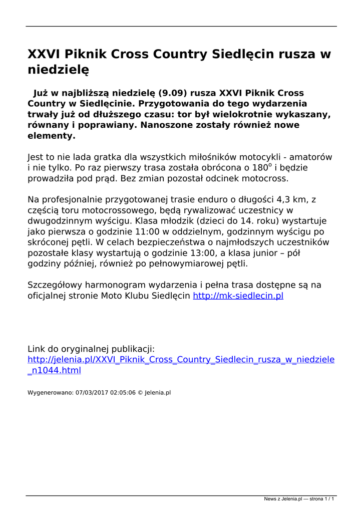 XXVI Piknik Cross Country Siedlęcin rusza w niedzielę Już w najbliższą niedzielę (9.09) rusza XXVI Piknik Cross Country w Siedlęcinie. Przygotowania do tego wydarzenia trwały już od dłuższego czasu: tor był wielokrotnie wykaszany, równany i poprawiany. Nanoszone zostały również nowe elementy. Jest to nie lada gratka dla wszystkich miłośników motocykli - amatorów i nie tylko. Po raz pierwszy trasa została obrócona o 180o i będzie prowadziła pod prąd. Bez zmian pozostał odcinek motocross. Na profesjonalnie przygotowanej trasie enduro o długości 4,3 km, z częścią toru motocrossowego, będą rywalizować uczestnicy w dwugodzinnym wyścigu. Klasa młodzik (dzieci do 14. roku) wystartuje jako pierwsza o godzinie 11:00 w oddzielnym, godzinnym wyścigu po skróconej pętli. W celach bezpieczeństwa o najmłodszych uczestników pozostałe klasy wystartują o godzinie 13:00, a klasa junior – pół godziny później, również po pełnowymiarowej pętli. Szczegółowy harmonogram wydarzenia i pełna trasa dostępne są na oficjalnej stronie Moto Klubu Siedlęcin http://mk-siedlecin.pl Link do oryginalnej publikacji: http://jelenia.pl/XXVI_Piknik_Cross_Country_Siedlecin_rusza_w_niedziele _n1044.html Wygenerowano: 07/03/2017 02:05:06 © Jelenia.pl News z Jelenia.pl — strona 1 / 1 Powered by TCPDF (www.tcpdf.org)