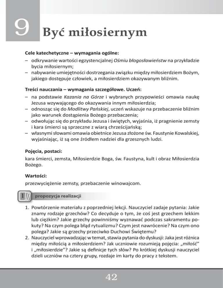 9 Być miłosiernym Cele katechetyczne – wymagania ogólne: – odkrywanie wartości egzystencjalnej Ośmiu błogosławieństw na przykładzie bycia miłosiernym; – nabywanie umiejętności dostrzegania związku między miłosierdziem Bożym, jakiego dostępuje człowiek, a miłosierdziem okazywanym bliźnim. Treści nauczania – wymagania szczegółowe. Uczeń: – na podstawie Kazania na Górze i wybranych przypowieści omawia naukę Jezusa wzywającego do okazywania innym miłosierdzia; – odnosząc się do Modlitwy Pańskiej, uczeń wskazuje na przebaczenie bliźnim jako warunek dostąpienia Bożego przebaczenia; – odwołując się do przykładu Jezusa i świętych, wyjaśnia, iż pragnienie zemsty i kara śmierci są sprzeczne z wiarą chrześcijańską; – własnymi słowami omawia obietnice Jezusa złożone św. Faustynie Kowalskiej, wyjaśniając, iż są one źródłem nadziei dla grzesznych ludzi. Pojęcia, postaci: kara śmierci, zemsta, Miłosierdzie Boga, św. Faustyna, kult i obraz Miłosierdzia Bożego. Wartości: przezwyciężenie zemsty, przebaczenie winowajcom. realizacji: propozycja realizacji 1 Propozycja 1. Powtórzenie materiału z poprzedniej lekcji. Nauczyciel zadaje pytania: Jakie znamy rodzaje grzechów? Co decyduje o tym, że coś jest grzechem lekkim lub ciężkim? Jakie grzechy powinniśmy wyznawać podczas sakramentu pokuty? Na czym polega błąd rytualizmu? Czym jest nawrócenie? Na czym ono polega? Jakie są grzechy przeciwko Duchowi Świętemu? 2. Nauczyciel wprowadzając w temat, stawia pytania do dyskusji: Jaka jest różnica między miłością a miłosierdziem? Jak uczniowie rozumieją pojęcia: „miłość” i „miłosierdzie”? Jakie są definicje tych słów? Po krótkiej dyskusji nauczyciel dzieli uczniów na cztery grupy, rozdaje im karty do pracy z tekstem. 42 grupa 1 – Mt 5, 43–48, miłość nieprzyjaciół, grupa 2 – Mt 18, 23–35, nielitościwy dłużnik, grupa 3 – Łk 6, 27–36, miłość nieprzyjaciół, grupa 4 – Łk 10, 30–37, miłosierny samarytanin. Uczniowie mają znaleźć odpowiedzi na następujące pytania: Jakie jest nauczanie Pana Jezusa i czego dotyczy w odczytanych fragmentach? Jakie postawy ludzkie przedstawione są w odczytanych fragmentach? Do jakich postaw wzywa nas Ewangelia? Po zakończeniu pracy w grupach, jeden z uczniów z grupy przedstawia pracę swojego zespołu. 3. Nauczyciel podsumowuje pracę w grupach. Dyktuje notatkę do zeszytu: Miłość jest pragnieniem dobra dla drugiego człowieka. Najwyższym dobrem dla człowieka jest zbawienie, tak więc miłość jest związana z pragnieniem zbawienia dla drugiego. Najpełniej taka miłość została objawiona przez Jezusa Chrystusa na krzyżu. Miłosierdzie jest miłością przebaczającą ze względu na miłość do Boga i człowieka. 4. Głośnie odczytanie tekstu z podręcznika (Opinie, s. 54). Po krótkim namyśle uczniowie dyskutują w klasie na temat: Co daje człowiekowi szczęście? Czy przebaczenie ma sens? Odpowiadają na pytanie 2 z ramki Zastanów się, s. 54. 5. Nauczyciel dyktuje notatkę: Jedną z dróg do szczęścia człowieka jest zachowywanie błogosławieństw, miedzy innymi tego: „Błogosławieni miłosierni, albowiem oni miłosierdzia dostąpią” (Mt 5, 7). Następnie nauczyciel daje za przykład siostrę Faustynę Kowalską – apostołkę miłosierdzia – nawiązuje do Dzienniczka siostry Faustyny. Uczniowie czytają na głos teksty Poszli za Chrystusem i Nauczanie Kościoła, s. 58–59. Jeśli nauczyciel ma taką możliwość, rozdaje uczniom obrazki Jezusa Miłosiernego z Koronką do Miłosierdzia Bożego i wyjaśnia znaczenie tej modlitwy, obietnice z nią związane. Zachęca uczniów, żeby nauczyli się tej modlitwy na pamięć. propozycja na lekcji propozycja pracypracy na lekcji 3 inna 12Inna Trzeba pamiętać, że temat jednostki jest kontynuacją poprzednich tematów. Przebaczenie, które otrzymujemy od Boga w sakramencie pokuty, jest potrzebne człowiekowi grzesznemu, winno też rodzić postawę gotowości do przebaczenia winowajcom, zgodnie z wezwaniem Modlitwy Pańskiej: „Odpuść nam nasze winy jako i my odpuszczamy naszym winowajcom”. 43 Przy tym temacie trzeba omówić dwie postawy: zemsty i przebaczenia. Na początku warto odwołać się do przeżyć i doświadczeń uczniów. Jeśli uczniowie zechcą powiedzieć, co czuli, gdy przebaczyli innym, można te odczucia porównać z nauką Jezusa (Mt 5, 7.6, 14–15). Biogram św. Faustyny można uzupełnić fotografią świętej, obrazkiem Miłosierdzia Bożego, filmem. Jednostkę rozpoczyna list dorosłego zwolennika kary śmierci, list podyktowany, co ważne, zemstą. Następnie podręcznik sięga do wierszy Leonii Jabłonkówny i Jana Romockiego mówiących o przebaczeniu. Wiersze uzupełniają refleksja Bosmansa i biblijne wezwania do miłosierdzia i przebaczenia. Następnie podany zostaje biogram św. Faustyny, zwięzła informacja o kulcie Miłosierdzia Bożego oraz słowa Jana Pawła II wypowiedziane przy grobie Apostołki Miłosierdzia (Łagiewniki, 1997 r.). Modlitwa: Fragment Koronki do Bożego Miłosierdzia. Zadanie 1 i 2, s. 59. Korelacja z innymi przedmiotami: język polski – przebaczenie w literaturze polskiej; godziny do dyspozycji wychowawcy – trudna sztuka przebaczania. 44