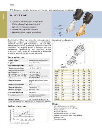2000 2/2-drogowy zawór kątowy sterowany pneumatycznie do cieczy • • • • • Przeznaczony do dużych przepływów Wolny od uderzeń hydraulicznych Optyczny wskaźnik położenia Kompaktowy siłownik tłokowy Samoregulujący zestaw uszczelnień Zawór kątowy składa się z siłownika tłokowego oraz 2drogowego korpusu. W zależności od temperatury otoczenia siłownik jest wykonany z PA lub PPS. Samoregulujący zestaw uszczelnień zapewnia zachowanie szczelności. 2/2-drogowy korpus z mosiądzu lub stali nierdzewnej zaprojektowany dla uzyskania dużego przepływu. Zawory mogą być wyposażone w dodatkowe akcesoria: wskaźnik pozycji, ogranicznik ruchu. Wymiary opakowania Dane techniczne Zakres ciśnień Zobacz tabelę zamówieniową Lepkość Max. 600 mm2/s Uszczelnienie gniazda PTFE Temperatura medium -10 °C do +180 °C Temperatura otoczenia dla siłownika PA 1) dla siłownika PPS 1) Ø 40-80 dla siłownika PPS 1) Ø 100125 -10 °C do +60 °C +5 °C do +140 °C +5 °C do +90 °C, zazwyczaj nawet do +140 °C Materiał korpusu Mosiądz lub stal nierdzewna 316L Materiał uszczelnienia PTFE Materiał siłownika Poliamid lub PPS Medium sterujące Powietrze 6 bar Kierunek przepływu Pod grzyb Pozycja spoczynkowa Normalnie zamknięty lub normalnie otwarty Gniazdo pilota 1/4” (Siłownik Ø 40 = 1/8”) 1) Uwaga: Dla siłowników PA o średnicy 40, 50 i 63, kombinacja max. temperatury medium i max. temperatury otoczenia jest przedstawiona na poniższym wykresie Wykres temperatury www.burkert-polska.pl Opcje • • • • • • • • Siłownik dwustronnego działania Elektromagnetyczny zawór pilotujący Wersja próżniowa Wskaźnik położenia Przystosowane do pracy z tlenem Materiał uszczelnienia NBR, FKM, EPDM Atesty GL, SIL Ogranicznik ruchu 2000 Wykres ciśnień dla wersji normalnie otwartej i kierunku przepływu “pod grzyb” Tabela zamówieniowa Prz yłącz e [cal] Śre dni ca [mm ] Roz m iar siłown ik a Ø [m m ] W artość Kv [m 3/h] Zakre s ciśn ie ń [bar] 40 3.7 0 - 15 178 608 178 607 178 606 178 605 50 4.2 0 - 16 178 684 178 683 178 682 178 681 50 8.5 0 - 11 178 680 178 679 178 678 178 677 63 9 0 - 16 178 666 178 665 178 664 178 663 63 18 0 - 11 178 676 178 675 178 674 178 667 80 18 0 - 16 186 489 187 565 186 488 187 844 Norm alnie z am kn ię ty G 1/2 13 G 3/4 G 1 20 25 Num e r z am ówie n iowy m osiądz S iłownik PA Siłown ik PPS Nu me r z am ówie niowy stal nie rdz e wna S iłownik PA Siłown ik PPS G 1 1/4 32 80 27 0 - 14 178 699 178 698 178 697 178 696 G 1 1/2 40 100 42 0 - 12.5 185 072 187 829 185 073 235 380 125 42 0 - 16 186 487 – 187 840 – 100 55 0 - 7.2 001 134 002 170 001 140 001 239 125 55 0 - 10 001 593 002 171 001 601 002 162 65 125 90 0 - 5.2 001 368 002 172 001 373 001 703 Norm alnie otwarty G 1/2 13 40 3.8 0 - 16 178 601 178 602 178 603 178 604 50 4.2 0 - 16 178 691 178 690 178 689 178 688 G 2 G 2 1/2 50 G 3/4 20 50 8.5 0 - 16 178 687 179 020 178 686 178 685 G 1 25 50 10 0 - 16 178 850 178 849 178 848 178 847 G 1 1/4 32 63 25 0 - 16 178 845 178 853 178 852 178 851 G 1 1/2 40 63 35 0 - 16 178 864 178 863 178 862 178 861 G 2 50 80 49 0 - 16 001 595 002 180 001 603 002 164 G 2 1/2 65 80 77 0 - 16 001 372 002 181 001 377 001 710 www.burkert-polska.pl