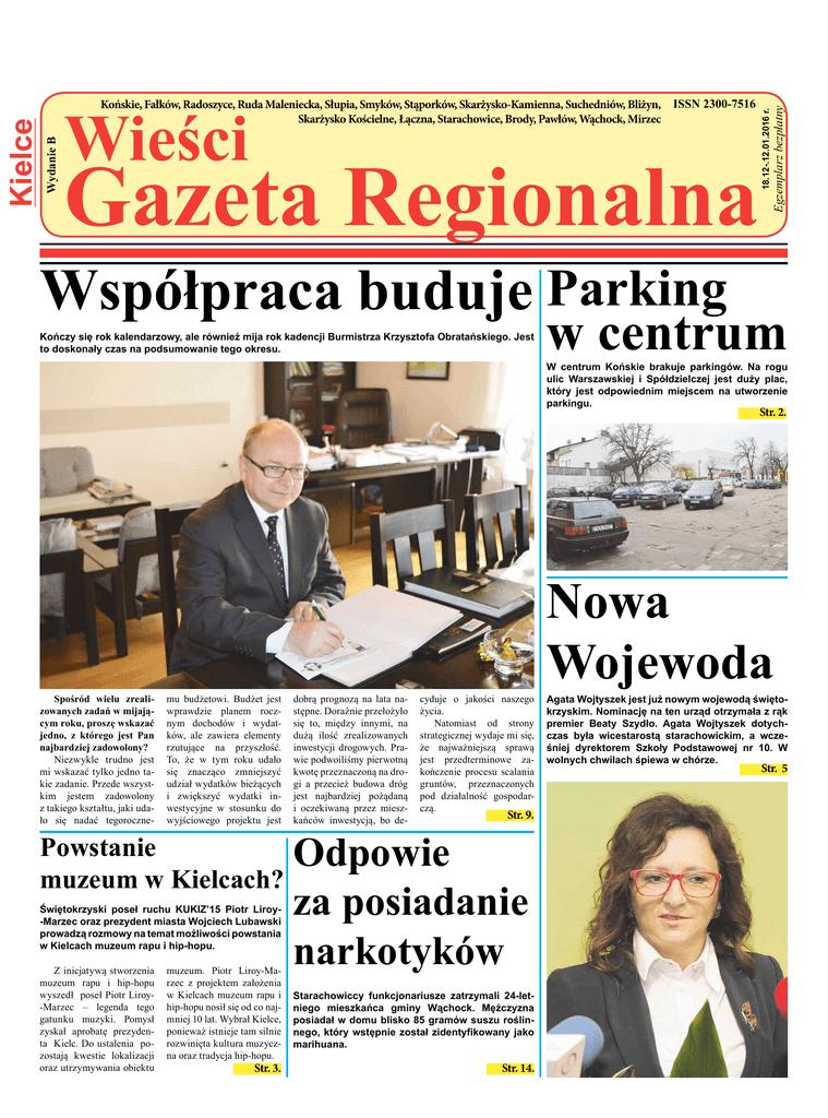 18.12-.12.01.2016 r. Gazeta Regionalna Egzemplarz bezpłatny Wydanie B Kielce Wieści Końskie, Fałków, Radoszyce, Ruda Maleniecka, Słupia, Smyków, Stąporków, Skarżysko-Kamienna, Suchedniów, Bliżyn, ISSN 2300-7516 Skarżysko Kościelne, Łączna, Starachowice, Brody, Pawłów, Wąchock, Mirzec Współpraca buduje Parking Kończy się rok kalendarzowy, ale również mija rok kadencji Burmistrza Krzysztofa Obratańskiego. Jest to doskonały czas na podsumowanie tego okresu. w centrum W centrum Końskie brakuje parkingów. Na rogu ulic Warszawskiej i Spółdzielczej jest duży plac, który jest odpowiednim miejscem na utworzenie parkingu. Str. 2. Spośród wielu zrealizowanych zadań w mijającym roku, proszę wskazać jedno, z którego jest Pan najbardziej zadowolony? Niezwykle trudno jest mi wskazać tylko jedno takie zadanie. Przede wszystkim jestem zadowolony z takiego kształtu, jaki udało się nadać tegoroczne- mu budżetowi. Budżet jest wprawdzie planem rocznym dochodów i wydatków, ale zawiera elementy rzutujące na przyszłość. To, że w tym roku udało się znacząco zmniejszyć udział wydatków bieżących i zwiększyć wydatki inwestycyjne w stosunku do wyjściowego projektu jest Powstanie muzeum w Kielcach? Świętokrzyski poseł ruchu KUKIZ’15 Piotr Liroy-Marzec oraz prezydent miasta Wojciech Lubawski prowadzą rozmowy na temat możliwości powstania w Kielcach muzeum rapu i hip-hopu. Z inicjatywą stworzenia muzeum rapu i hip-hopu wyszedł poseł Piotr Liroy-Marzec – legenda tego gatunku muzyki. Pomysł zyskał aprobatę prezydenta Kielc. Do ustalenia pozostają kwestie lokalizacji oraz utrzymywania obiektu muzeum. Piotr Liroy-Marzec z projektem założenia w Kielcach muzeum rapu i hip-hopu nosił się od co najmniej 10 lat. Wybrał Kielce, ponieważ istnieje tam silnie rozwinięta kultura muzyczna oraz tradycja hip-hopu. Str. 3. dobrą prognozą na lata następne. Doraźnie przełożyło się to, między innymi, na dużą ilość zrealizowanych inwestycji drogowych. Prawie podwoiliśmy pierwotną kwotę przeznaczoną na drogi a przecież budowa dróg jest najbardziej pożądaną i oczekiwaną przez mieszkańców inwestycją, bo de- cyduje o jakości naszego życia. Natomiast od strony strategicznej wydaje mi się, że najważniejszą sprawą jest przedterminowe zakończenie procesu scalania gruntów, przeznaczonych pod działalność gospodarczą. Str. 9. Odpowie za posiadanie narkotyków Starachowiccy funkcjonariusze zatrzymali 24-letniego mieszkańca gminy Wąchock. Mężczyzna posiadał w domu blisko 85 gramów suszu roślinnego, który wstępnie został zidentyfikowany jako marihuana. Str. 14. Nowa Wojewoda Agata Wojtyszek jest już nowym wojewodą świętokrzyskim. Nominację na ten urząd otrzymała z rąk premier Beaty Szydło. Agata Wojtyszek dotychczas była wicestarostą starachowickim, a wcześniej dyrektorem Szkoły Podstawowej nr 10. W wolnych chwilach śpiewa w chórze. Str. 5 2 Wieści W Wydarzenia Radoszyce starają się o prawa miejskie Radoszyce, które były przez pewien czas miastem, w 1869 roku utraciły prawa miejskie. Obecnie pojawiła się szansa na ich przywrócenie. Był to główny temat poruszany podczas XII sesji Rady Gminy Radoszyce. Ż e b y Radoszyce mogły uzyskać prawa miejskie, muszą spełnić kilka warunków. Dzięki zrealizowanym już inwestycjom jest w g m i n ie niezbędna infrastr uktura techniczna: wodociągi i kanalizacja. Radoszyce posiadają także wyodrębnione centrum. Argumentem, który przemawia za odzyskaniem statusu miasta jest to, że miejscowość posiada herb zatwierdzony przez komisję heraldyczną. Obecnie jest to największa wieś w województwie świętokrzyskim, która liczy ponad 17 kilometrów kwadratowych powierzchni. Aktualna liczba mieszkańców Radoszyc pozwalana na to, aby przekształcić je w miasto, w którym 2/3 ludności utrzymuje się z działalności pozarolniczej. Jeśli Radoszyce stałyby się miastem, mogłyby ubiegać się o środki z Unii Europejskiej, niedostępne dot ychczas. Działania, które były do tej pory prowadzone na terenie gminy: budowa dróg, cho d n i ków, oświetlenia, budowa oczyszczalni, a także wprowadzenie selektywnej zbiórki odpadów zwiększają znacznie szansę powrotu na listę miast w Polsce. Władze gminy zamierzają prowadzić na ten temat rozmowy w sołectwach. Każdy mieszkaniec będzie miał możliwość wyrażenia swojej opinii, a projekt nadania praw miejskich będzie przegłosowywany. Opinię musi wydać także Wojewoda Świętokrzyski. Parking w centrum W centrum Końskie brakuje parkingów. Na rogu ulic Warszawskiej i Spółdzielczej jest duży plac, który jest odpowiednim miejscem na utworzenie parkingu. Na placu przy skrzyżowaniu ulic Spółdzielczej i Warszawskiej obecnie są parkowane samochody „na dziko”. Problem z zagospodarowaniem tego placu wynika z podziału własnościowego. Na tak niewielkim obszarze ulokowane są dwie działki Okręgowej Spółdzielni Mleczarskiej, jedna działka PSS Społem oraz jedna Gminy Końskie. Ułożenie wzajemne tych Niech czas Bożego Narodzenia upłynie w atmosferze miłości i rodzinnego ciepła, a Nowy Rok obdaruje Wszystkich pomyślnością i szczęściem. Najpiękniejszych Świąt Bożego Narodzenia i spełnienia wszystkich marzeń w 2016 roku mieszkańcom Miasta i Gminy Końskie życzą Przewodniczący Rady Miejskiej w Końskich Zbigniew Kowalczyk Zastępca Przewodniczącego Lidia Wiśniewska Zastępca Przewodniczącego Marek Kozerawski www.gazeta-wiesci.pl Burmistrz Miasta Krzysztof Obratański Zastępca Burmistrza Krzysztof Jasiński Zastępca Burmistrza Marcin Zieliński działek powoduje, że żaden z właścicieli nie może samodzielnie wykorzystywać tego gruntu. Od dawna Gmina stara się te działki scalić. - Jesteśmy na dobrej drodze do dokonania zamian gruntowych zarówno z PSS Społem, jak i OSM. Jest uchwała Rady Miejskiej wyrażająca zgodę na taką zamianę, a także uchwał