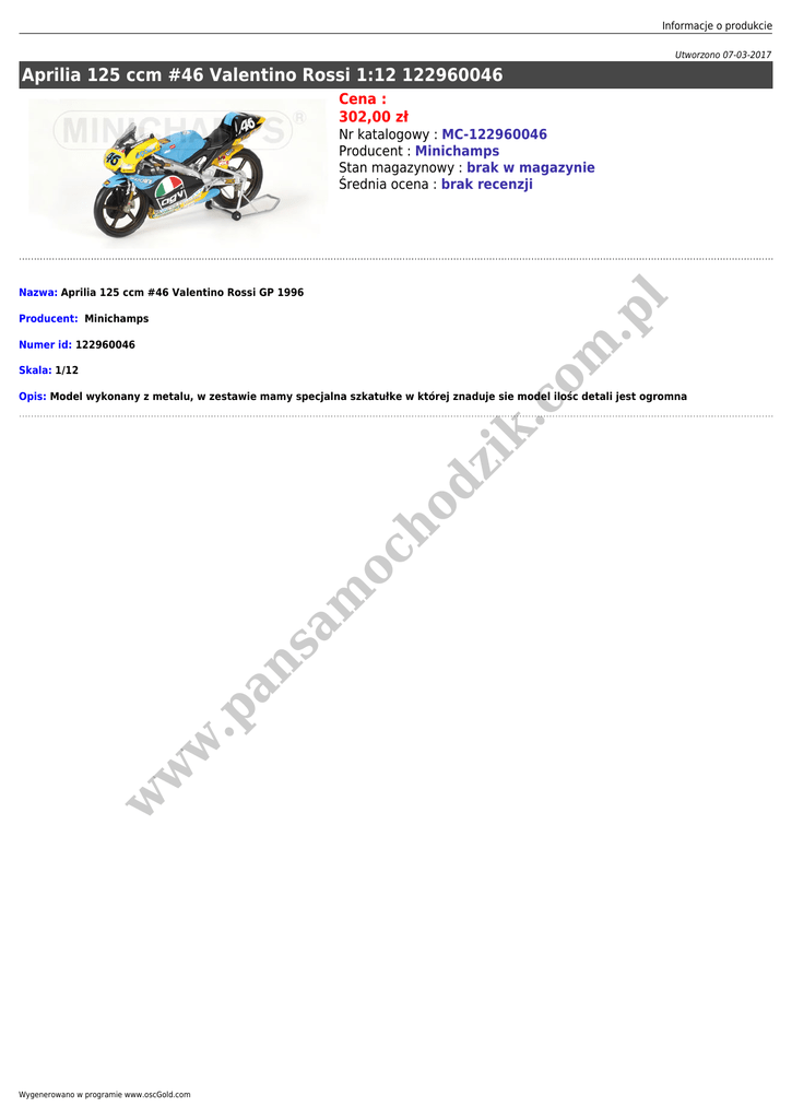 Informacje o produkcie Utworzono 07-03-2017 Aprilia 125 ccm #46 Valentino Rossi 1:12 122960046 Cena : 302,00 zł Nr katalogowy : MC-122960046 Producent : Minichamps Stan magazynowy : brak w magazynie Średnia ocena : brak recenzji .p l Nazwa: Aprilia 125 ccm #46 Valentino Rossi GP 1996 Producent: Minichamps om Numer id: 122960046 Skala: 1/12 w w w .p an sa m oc ho dz ik .c Opis: Model wykonany z metalu, w zestawie mamy specjalna szkatułke w której znaduje sie model ilośc detali jest ogromna Wygenerowano w programie www.oscGold.com