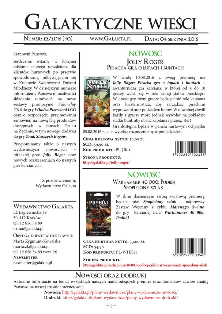 Galaktyczne Numer: 22/2016 (40) www.Galakta.pl Przypominamy także o naszych wydawniczych nowościach – pirackiej grze Jolly Roger oraz nowych rozszerzeniach do naszych gier karcianych. 2016 W środę 10.08.2016 r. swoją premierą ma Jolly Roger: Piracka gra o łupach i buntach – awanturnicza gra karciana, w której od 4 do 10 graczy wcieli się w role załogi statku pirackiego. W czasie gry różni gracze będą pełnić rolę kapitana oraz kwatermistrza, aby zarządzać pirackimi wyprawami oraz podziałem łupów. W dowolnej chwili każdy z graczy może jednak wywołać na pokładzie statku bunt, aby obalić kapitana i przejąć ster! Gra dostępna będzie w panelu hurtowym od piątku 05.08.2016 r., a jej wysyłkę rozpoczniemy w poniedziałek. Cena hurtowa netto: 36,00 zł SCD: 59,90 zł Kod produktu: PL-JR01 Strona produktu: http://galakta.pl/jolly-roger/ NOWOŚĆ Warhammer 40 000: Podbój Spopielony szlak W dniu dzisiejszym swoją światową premierę będzie miał Spopielony szlak – najnowszy Zestaw Wojenny z cyklu Martwego Świata do gry karcianej LCG Warhammer 40 000: Podbój. Wydawnictwo Galakta ul. Łagiewnicka 39 30-417 Kraków tel: 12 656 34 89 [email protected] Marta Zygmunt-Kowalska [email protected] tel. 12 656 34 89 wew. 26 Newsletter [email protected] sierpnia Piracka gra o łupach i buntach Z pozdrowieniami, Wydawnictwo Galakta Obsługa klientów hurtowych Data: 04 Nowość Jolly Roger Szanowni Państwo, serdecznie witamy w kolejnej odsłonie naszego newslettera dla klientów hurtowych po przerwie spowodowanej odbywającymi się w Krakowie Światowymi Dniami Młodzieży. W dzisiejszym numerze informujemy Państwa o możliwości składania zamówień na nowe zestawy promocyjne Fellowship 2016 do gry Władca Pierścieni LCG oraz o rozpoczęciu przyjmowaniu zamówień na nową falę produktów dostępnych w ramach Druku na Żądanie, w tym nowego dodatku do gry Znak Starszych Bogów. wieści Cena hurtowa netto: 33,00 zł SCD: 54,90 Kod produktu: PL-WHK18 Strona produktu: http://galakta.pl/warhammer-40-000-podboj-cykl-martwego-swiata-spopielony-szlak Nowości oraz dodruki Aktualne informacje na temat wszystkich naszych nadchodzących premier oraz dodruków zawsze znajdą Państwo na naszej stronie internetowej: Nowości: http://galakta.pl/plany-wydawnicze/plany-wydawnicze-nowosci/ Dodruki: http://galakta.pl/plany-wydawnicze/plany-wydawnicze-dodruki/ 1 NowośCi 18.08.2016 Gra o Tron LCG: Wezwanie do broni Warhammer 40 000: Podbój Poszukiwanie prawdy 18.08.2016 r. swoją światową premierę będzie miało rozszerzenie Wezwanie do broni do gry karcianej Gra o Tron oraz Poszukiwanie prawdy – najnowszy Zestaw Wojenny z cyklu Martwego Świata do gry karcianej LCG Warhammer 40 000: Podbój. Wysyłkę tych produktów rozpoczniemy od poniedziałku 15.08.2016 r. Przypominamy, że w przypadku produktów otrzymanych przedpremierowo nie mogą Państwo sprzedawać ani wysyłać żadnych egzemplarzy produktu przed dniem jego światowej premiery. Złamanie tej zasady spowoduje, że w przyszłości nie będą mogli Państwo otrzymać żadnych produktów przedpremierowo. Zestawy promocyjne Władca Pierścieni LCG: Fellowship 2016 Fellowship 2016 to specjalne wydarzenie zaplanowane na weekend 11-13 listopada 2016. W tych dniach miłośnicy Władcy Pierścieni LCG będą mogli w wybranych sklepach stacjonarnych na całym świecie zmierzyć się po raz pierwszy z zupełnie nowym scenariuszem Oblężenie Annuminas. Każdy uczestnik wydarzenia otrzyma swój egzemplarz wspomnianego scenariusza (kilka miesięcy później scenariusz ten będzie dostępny dla wszystkich w ramach Druku na Żądanie). Dodatkowo każdy uczestnik otrzyma także specjalną matę do gry oraz kartę promocyjną Faramira z alternatywną grafiką. Każdy sklep stacjonarny zainteresowany udziałem we wspomnianym wydarzeniu musi zamówić, za naszym pośrednictwem, specjalny zestaw promocyjny oraz zorganizować we wskazanych dniach w swojej siedzibie wydarzenie, w ramach którego miłośnicy Władcy Pierścieni LCG będą mogli rozegrać partię we wspomniany scenariusz. Koszt pojedynczego zestawu to 219,00 netto. Jeden zestaw zawiera 3 kopie scenariusza, 3 maty oraz 3 karty promocyjne (jeden zestaw wystarcza dla 3 graczy). Nie ma przy tym górnego limitu zestawów, które może zamówić jeden sklep. Uwaga: Za naszym pośrednictwem mogą Państwo zamawiać zestawy w języku polskim! Zgłoszenia proszę wysyłać do nas na adres [email protected]. Termin nadsyłania upływa 24.08.2015 o godzinie 12:00 i jest on nieprzekraczalny. W związku z tym, że musimy z odpowiednim wyprzedzeniem przekazać FFG liczbę zestawów niezbędnych dla naszego kraju, zgłoszenia przesyłane do nas po tym terminie nie będą już przyjmowane. Aby pomóc w promocji wydarzenia, na początku listopada na naszej stronie internetowej opublikujemy listę sklepów, w których gracze będą mogli wziąć udział w rozgrywkach w ramach Fellowship 2016. Dlatego też będziemy prosić Państwa o dokładne dane, które będziemy mogli opublikować w tym celu na dedykowanej podstronie. Uwaga: Informujemy, że zestawy Fellowship 2016, podobnie jak inne zestawy promocyjne, nie są przeznaczone do normalnej sprzedaży, w związku z czym nie można oferować ich klientom poza wspomnianym wydarzeniem. Złamanie tego zakazu uniemożliwi Państwu zamawiania w przyszłości jakichkolwiek zestawów promocyjnych do naszych gier. Nowości oraz dodruki Najnowsze informacje na temat wszystkich naszych nadchodzących premier oraz dodruków zawsze znajdą Państwo na naszej stronie internetowej: Nowości: http://galakta.pl/plany-wydawnicze/plany-wydawnicze-nowosci/ Dodruki: http://galakta.pl/plany-wydawnicze/plany-wydawnicze-dodruki/ 2 Ważna informacja Druk na Żądanie rozpoczynamy zbieranie zamówień Tak jak wspomnieliśmy we wstępie, rozpoczynamy zbieranie zamówień na najnowszą falę zamówień na produkty dostępne w ramach Druku na Żądanie. Druk na Ż