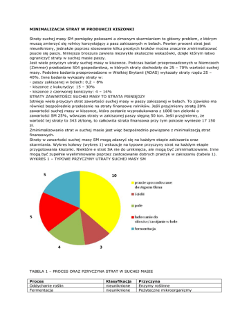 MINIMALIZACJA STRAT W PRODUKCJI KISZONKI Straty suchej masy SM pomiędzy pokosami a zimowym skarmianiem to główny problem, z którym muszą zmierzyć się rolnicy korzystający z pasz zakiszanych w belach. Pewien procent strat jest nieunikniony, jednakże poprzez stosowanie kilku prostych kroków można znacznie zminimalizować psucie się paszy. Niniejsza broszura zawiera niezwykle skuteczne wskazówki, dzięki którym łatwo ograniczyć straty w suchej masie paszy. Jest wiele przyczyn utraty suchej masy w kiszonce. Podczas badań przeprowadzonych w Niemczech (Zimmer) przebadano 504 gospodarstwa, w których straty dochodziły do 25 – 70% wartości suchej masy. Podobne badania przeprowadzone w Wielkiej Brytanii (ADAS) wykazały straty rzędu 25 – 40%. Inne badania wykazały straty w: - paszy zakiszanej w belach: 0,2 – 8% - kiszonce z kukurydzy: 15 – 30% - kiszonce z czerwonej koniczyny: 4 – 14% STRATY ZAWARTOŚCI SUCHEJ MASY TO STRATA PIENIĘDZY Istnieje wiele przyczyn strat zawartości suchej masy w paszy zakiszanej w belach. To zjawisko ma również bezpośrednie przełożenie na straty finansowe rolników. Jeśli przyjmiemy stratę 20% zawartości suchej masy w kiszonce, która zostanie wyprodukowana z 1000 ton zielonki o zawartości SM 25%, wówczas straty w zakiszonej paszy sięgną 50 ton. Jeśli przyjmiemy, że wartość tej straty to 343 zł/tonę, to całkowita strata finansowa przy tym pokosie wyniesie 17 150 zł. Zminimalizowanie strat w suchej masie jest więc bezpośrednio powiązane z minimalizacją strat finansowych. Straty w zawartości suchej masy SM mogą zdarzyć się na każdym etapie zakiszania oraz skarmiania. Wykres kołowy (wykres 1) wskazuje na typowe przyczyny strat na każdym etapie przygotowania kiszonki. Niektóre e strat SA nie do uniknięcia, ale mogą być zminimalizowane. Inne mogą być zupełnie wyeliminowane poprzez zastosowanie dobrych praktyk w zakiszaniu (tabela 1). WYKRES 1 – TYPOWE PRZYCZYNY UTRATY SUCHEJ MASY SM 5 10 5 4 3 TABELA 1 – PROCES ORAZ PZRYCZYNA STRAT W SUCHEJ MASIE Proces Oddychanie roślin Fermentacja Klasyfikacja nieuniknione nieuniknione Przyczyna Enzymy roślinne Pożyteczne mikroorganizmy Powodzie lub nadmierne przesuszenie plonu Wtórna fermentacja nieuniknione Przenikanie powietrza do silosu do uniknięcia Tlenowe psucie się paszy podczas skarmiania do uniknięcia do uniknięcia Niska zawartość SM, złe metody zakiszania Niepożądane mikroorganizmy, zanieczyszczenie glebą, jakość upraw Prasowanie, stopień rozdrobnienia, prędkość zawijania, umieszczanie w silosie Jak powyżej, ważna szczelność folii lub silosów, prędkość skarmiania PRAKTYCZNE POARDY JAK OGRANICZYĆ STRATY STRATY NA POLU - ważne jest by kosić jak pogoda jest bezdeszczowa. To zapewnia niską zawartość wody w plonie. Woda musi być usunięta przed zakiszeniem. - unikać zanieczyszczenia paszy ziemią (ciąć na wysokości 5 – 10 cm), przetrząsania oraz grabienia - unikać uszkodzeń mechanicznych. Rośliny motylkowe nie powinny mieć uszkodzonych liści - rzędy suszącej się kiszonki powinny być szerokie i płaskie, co wzmaga suszenie - podsuszaj do korzystnej suchej masy w możliwie jak najkrótszym czasie. Dla traw 24 h, a dla motylkowych 48 h. STRATY W SILOSACH - jeśli to możliwe to należy zakiszać plony o zawartości suchej masy SM większej niż 27%, co pozwoli na usuniecie zbędnych płynów - rozdrabniaj zielonkę w zależności od wytycznych dla danego gatunku. Przy produkcji bel używaj rozdrabniającej belownicy. Rozdrabnianie kiszonki wpływa na zwiększenie gęstości paszy w beli i zmniejszenie zawartości tlenu - używaj dodatków do zakiszania. Wzmagają one zawartość bakterii przyczyniających się do fermentacji, obniżają pH wewnątrz beli, silosu - wypełnij silos równo, dobrze sprasowana kiszonką - uszczelnij silos jak najszybciej po wypełnieniu. Bele powinny być uszczelnione w ciągu dwóch godzin od zawinięcia. Ważne jest aby folia była dobrej jakości - bele powinny być zawijane w miejscu późniejszego składowania, co pozwala uniknąć strat spowodowanych mechanicznym uszkodzeniem folii. STRATY PRZY SKARMIANIU - dobierz pojemność silosu do ilości krów w gospodarstwie. Silos nie może zostać otwarty dłużej niż 5 dni - korzystaj z ostrych wybieraków, co zmniejszy dostęp tlenu do silosu - warto jest przemyśleć zastąpienie kiszonki w silosach paszą zakiszana w belach. Szczególnie w okresach gdy karmienie kiszonką jest mniej intensywne. Straty spowodowane dostępem tlenu do kiszonki w silosach sięgają 25% podczas gdy straty tego samego rodzaju w paszy zakiszanej w belach praktycznie nie występu.